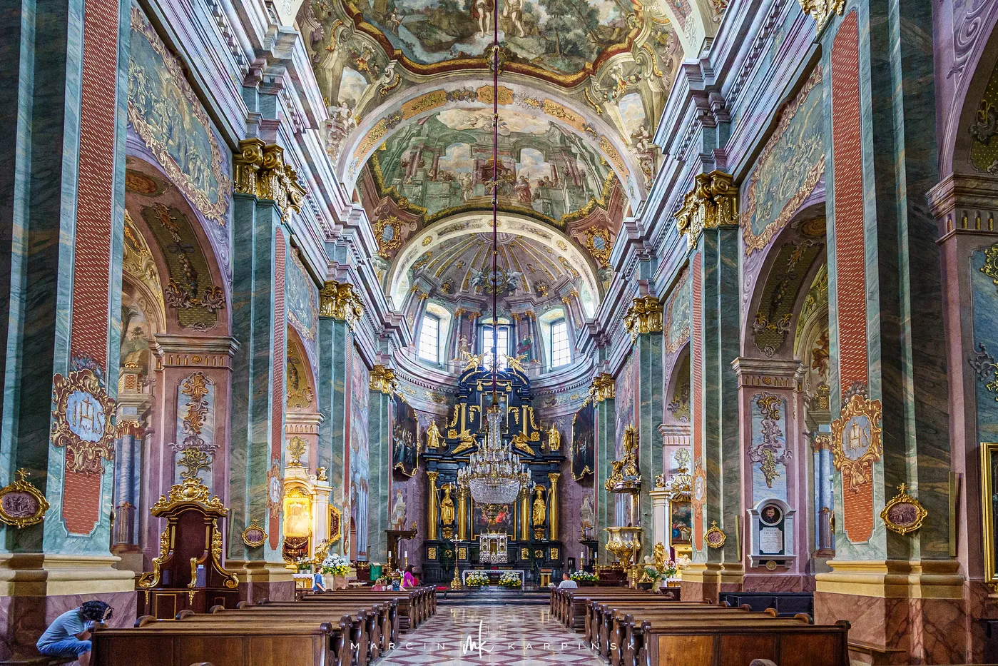 W swojej historii archikatedra wielokrotnie ucierpiała wskutek pożarów i wojen, co wiązało się z koniecznością przebudów i zmian wystroju. Jej wnętrze zdobią bogate polichromie autorstwa Józefa Meyera z połowy XVIII wieku. Do najciekawszych miejsc należy tzw. zakrystia akustyczna, w której można usłyszeć szept przenoszący się z jednego końca pomieszczenia na drugi. Wśród cennych elementów archikatedry znajdują się również krypty, gdzie spoczywają biskupi lubelscy, oraz skarbiec.