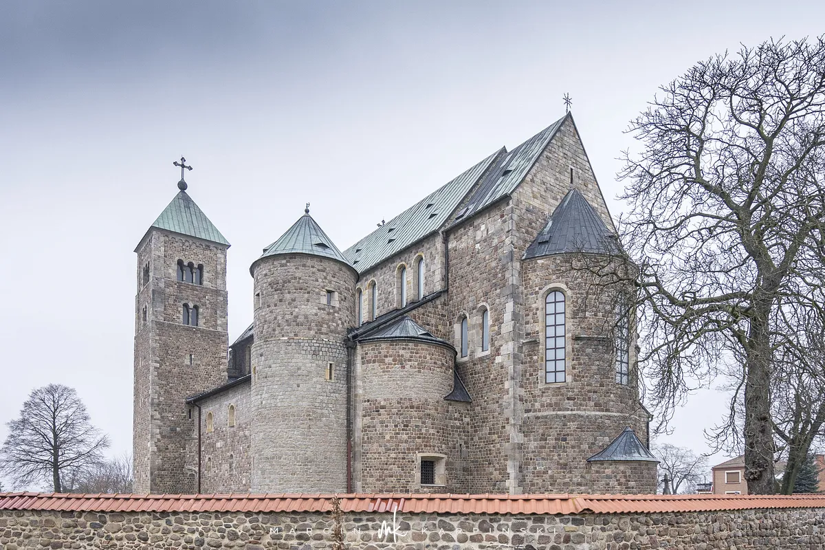 Kościół został wybudowany na miejscu wcześniej istniejącej budowli. Prawdopodobnie powstał na fundamentach benedyktyńskiego opactwa Świętej Marii. Konsekracja kościoła nastąpiła w 1161 roku. Świątynia wzniesiona w romańskim stylu była kilkukrotnie niszczona i odbudowywana. Obecny wygląd jest wynikiem prac prowadzonych w połowie XX wieku oraz na przełomie XX i XXI wieku. Z zewnątrz zachowany jest jej romański wygląd, natomiast we wnętrzu dominują cechy gotyckie.