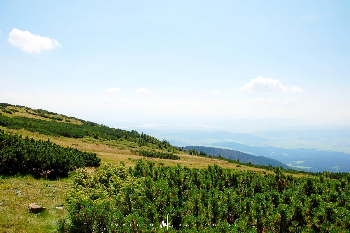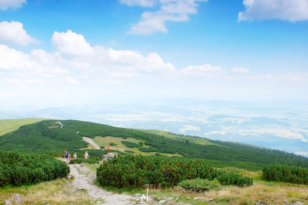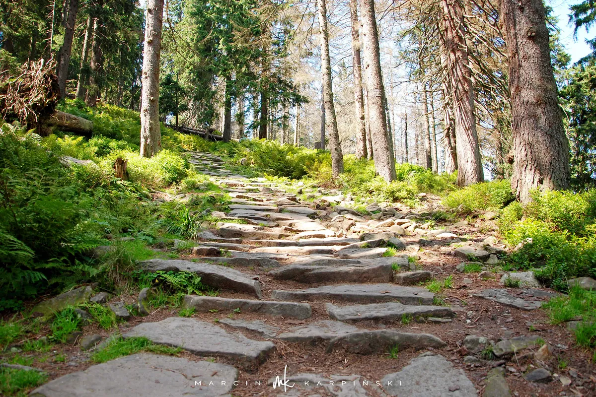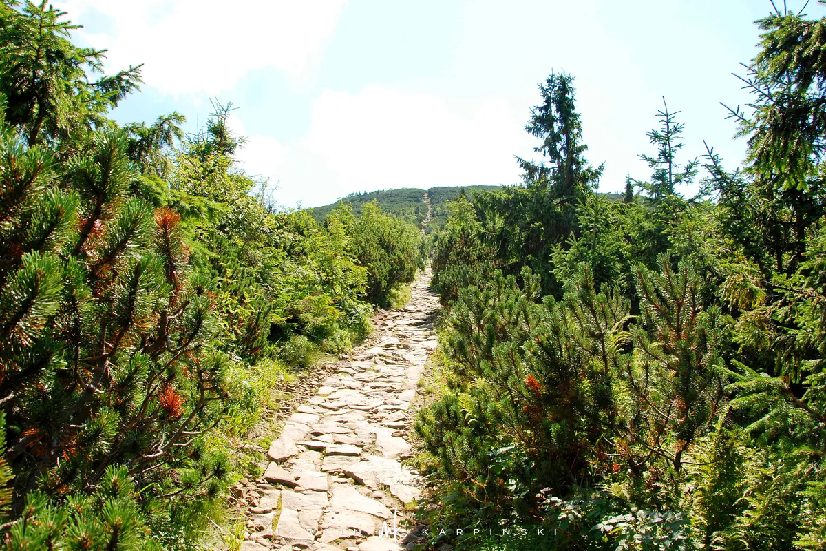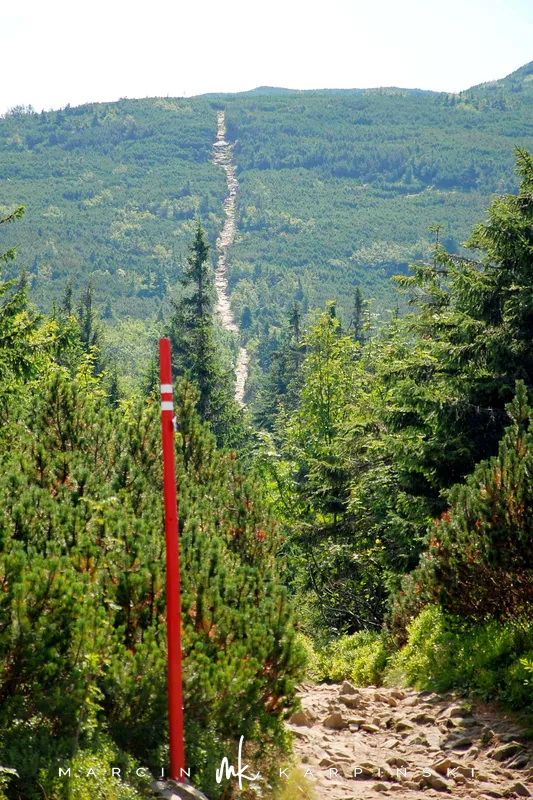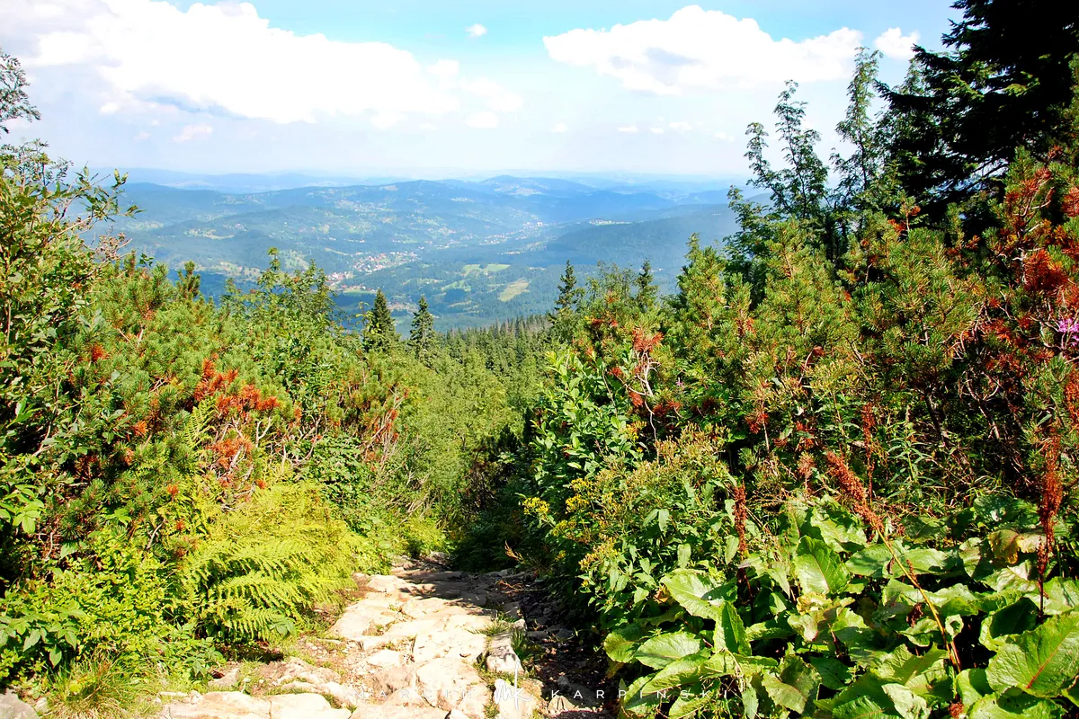 Na drogę powrotną wybraliśmy szlak czerwony, który schodząc z Babiej Góry prowadzi nas przez kosodrzewinę. Po drodze warto zatrzymać się na w punkcie widokowym na wysokości 1450 m n.p.m. - skąd doskonale widać Tatry. Idąc dalej przechodzimy przez szczyt Sokolicy (1367 m n.p.m.). Szlak prowadzi cały czas w dół, początkowo idziemy kamienną ścieżką, a zbliżając się ku końcowi naszej wędrówki maszerujemy chodnikiem wyłożonym świerkowymi balami.