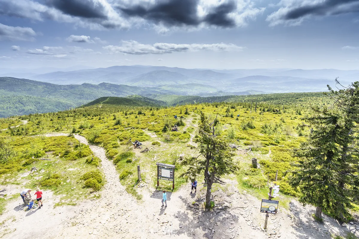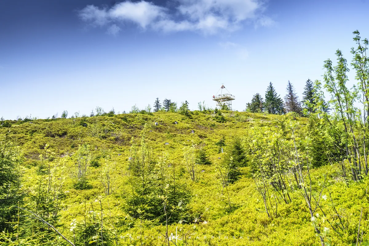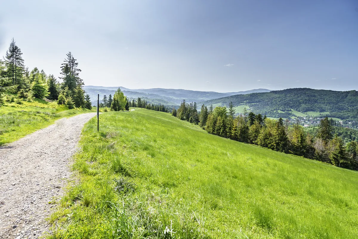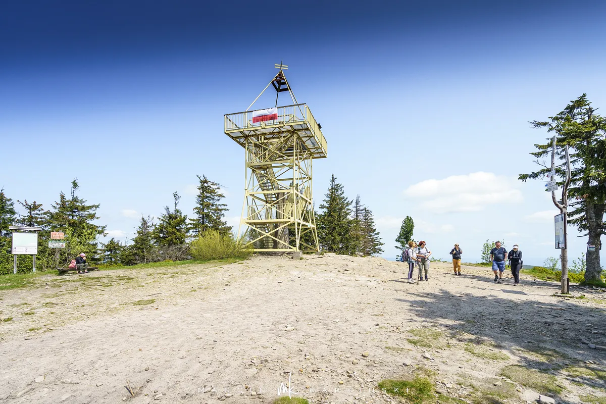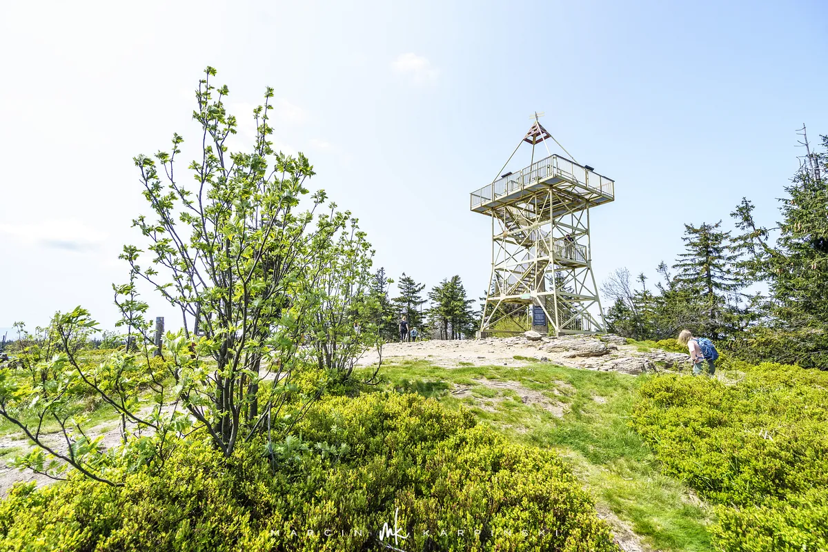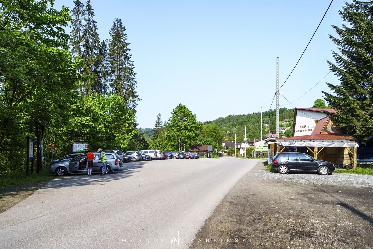 przez Cieńków. Wędrówkę rozpoczynamy sprzed budynku Ochotniczej Straży Pożarnej „Wisła Czarne”, przed którym znajduje się dość duży płatny parking. Pierwsze 3 kilometry idziemy asfaltową drogą, wzdłuż potoku Biała Wisełka. Następnie skręcamy z drogi w prawo, zgodnie z oznaczeniem szlaku. Droga zaczyna delikatnie piąć się do góry. Po prawej stronie mijamy Kaskady Rodła, czyli zespół wodospadów i progów rzecznych. Jest ich około dwudziestu pięciu. Dwa największe mają 3,5 i 5 metrów wysokości. Cały czas idziemy lasem. Im wyżej wchodzimy, to staje się on rzadszy. Spomiędzy drzew zaczynają się wyłaniać widoki okolicznych wzniesień. Dochodzimy do punktu, w którym nasz niebieski szlak łączy się z czerwonym i zielonym. Od tego miejsca do szczytu zostało 300 metrów marszu.