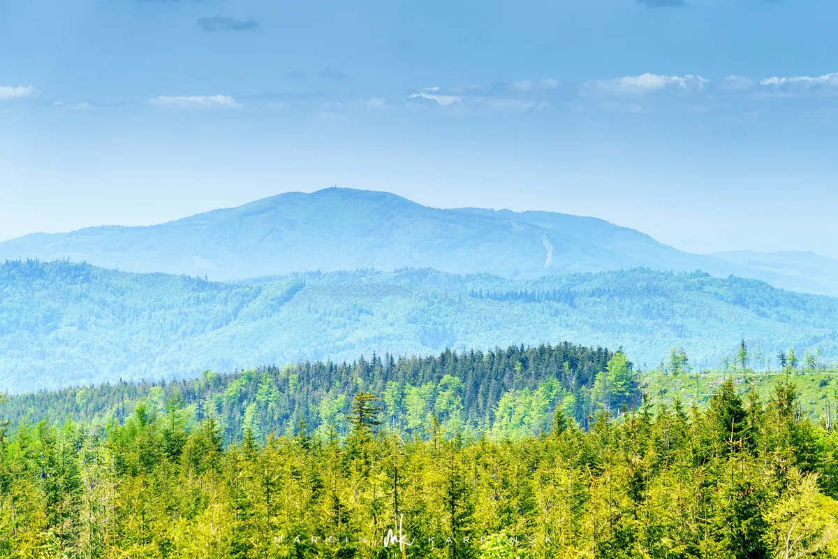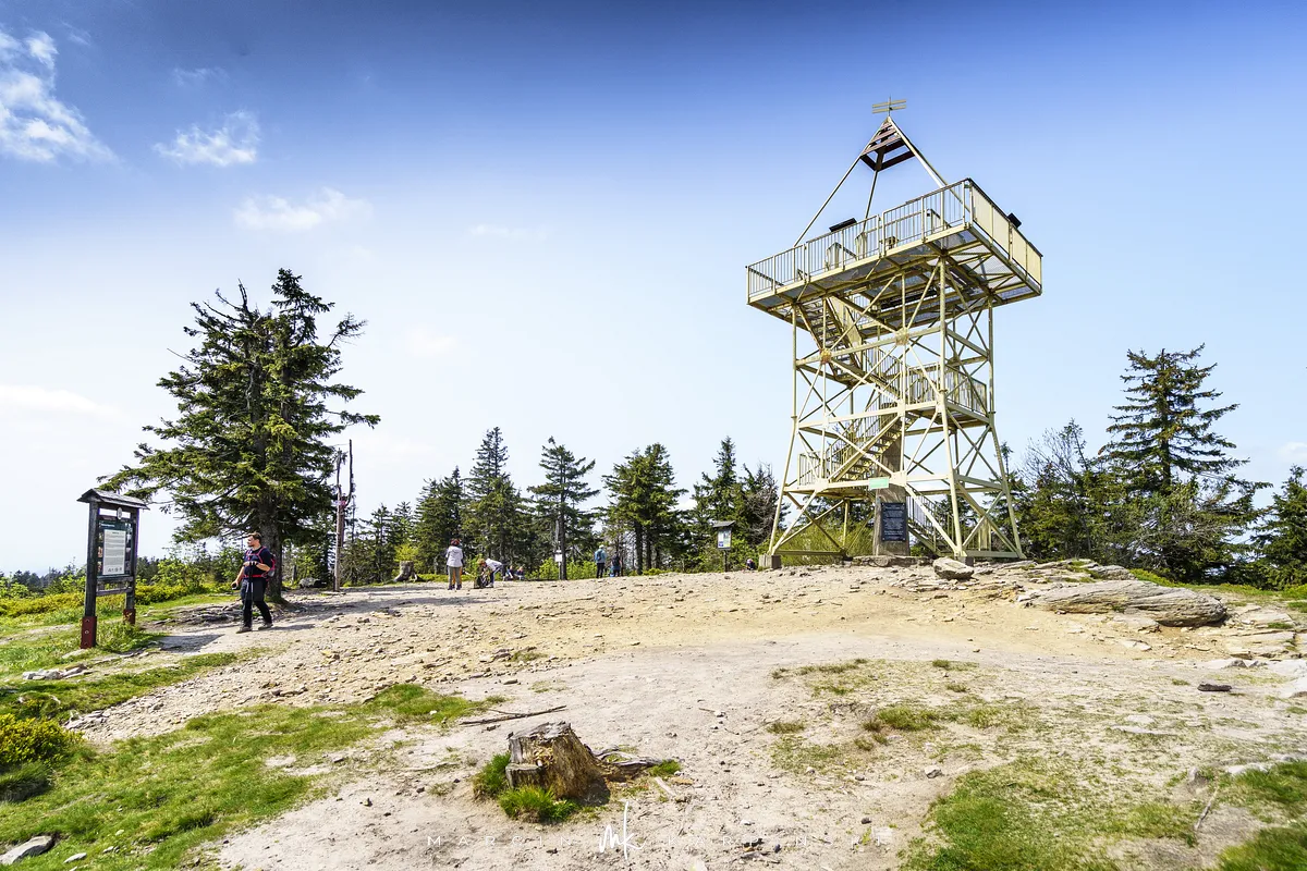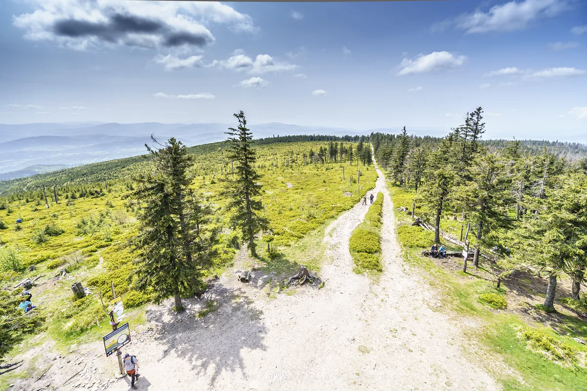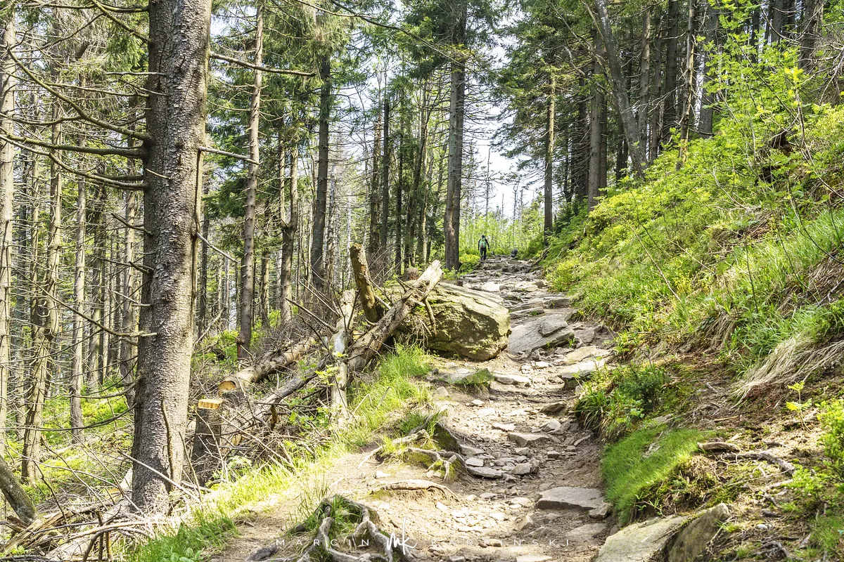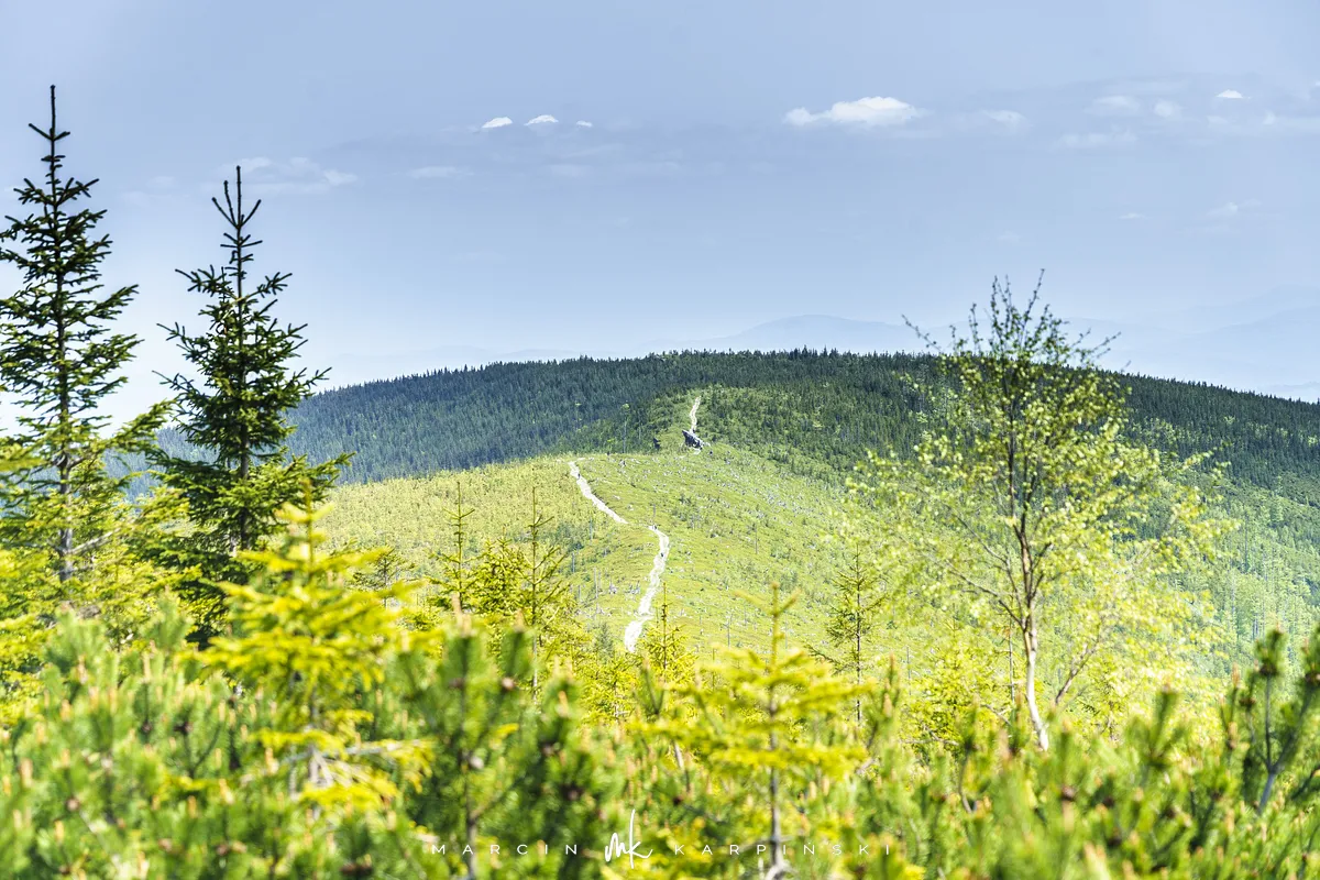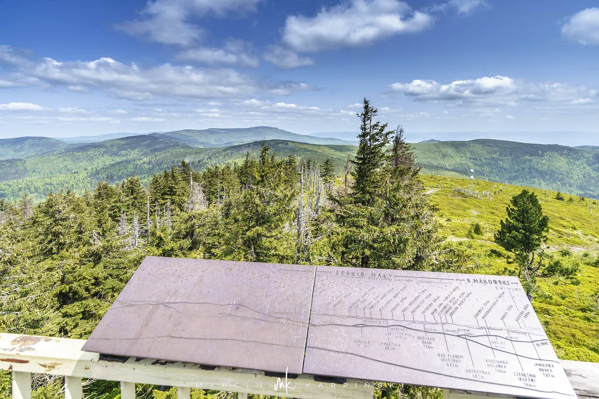 przez Cieńków. Wędrówkę rozpoczynamy sprzed budynku Ochotniczej Straży Pożarnej „Wisła Czarne”, przed którym znajduje się dość duży płatny parking. Pierwsze 3 kilometry idziemy asfaltową drogą, wzdłuż potoku Biała Wisełka. Następnie skręcamy z drogi w prawo, zgodnie z oznaczeniem szlaku. Droga zaczyna delikatnie piąć się do góry. Po prawej stronie mijamy Kaskady Rodła, czyli zespół wodospadów i progów rzecznych. Jest ich około dwudziestu pięciu. Dwa największe mają 3,5 i 5 metrów wysokości. Cały czas idziemy lasem. Im wyżej wchodzimy, to staje się on rzadszy. Spomiędzy drzew zaczynają się wyłaniać widoki okolicznych wzniesień. Dochodzimy do punktu, w którym nasz niebieski szlak łączy się z czerwonym i zielonym. Od tego miejsca do szczytu zostało 300 metrów marszu.