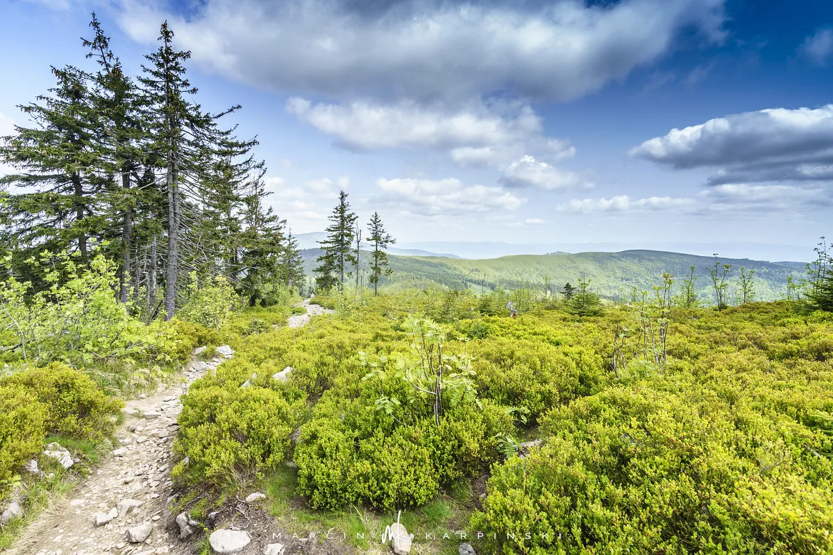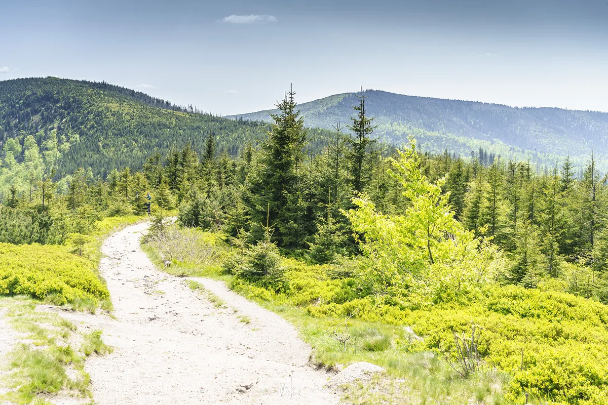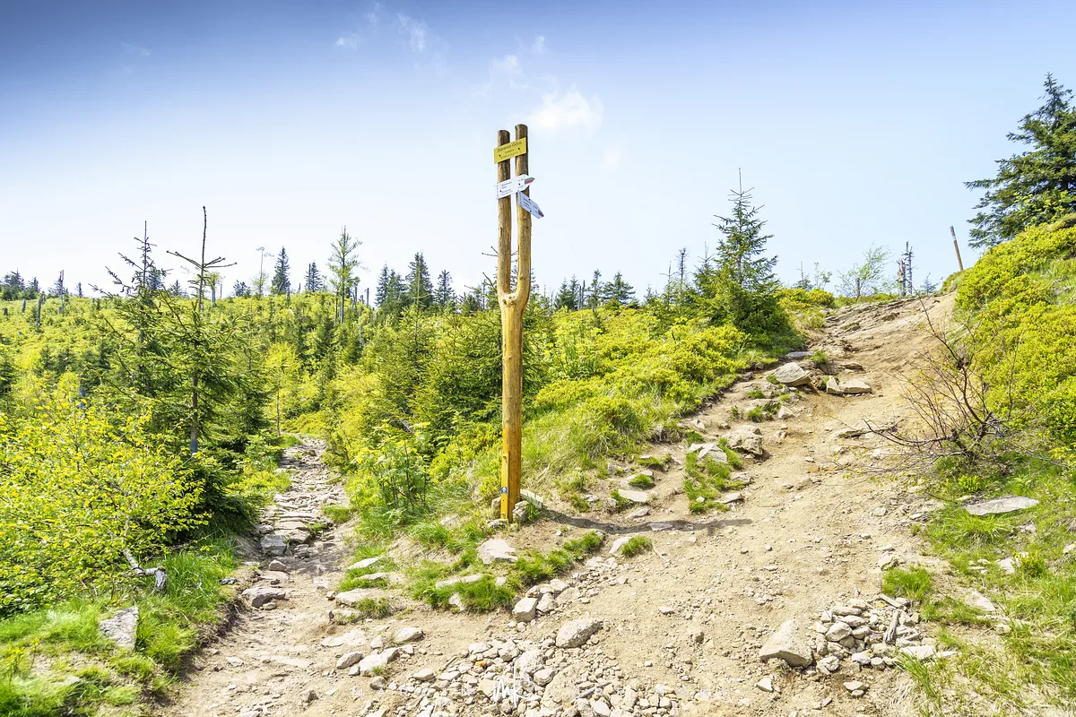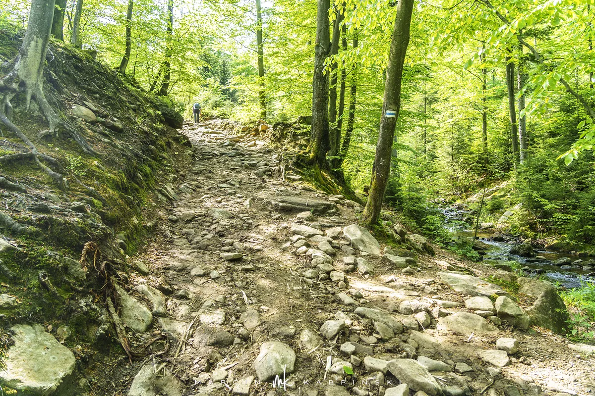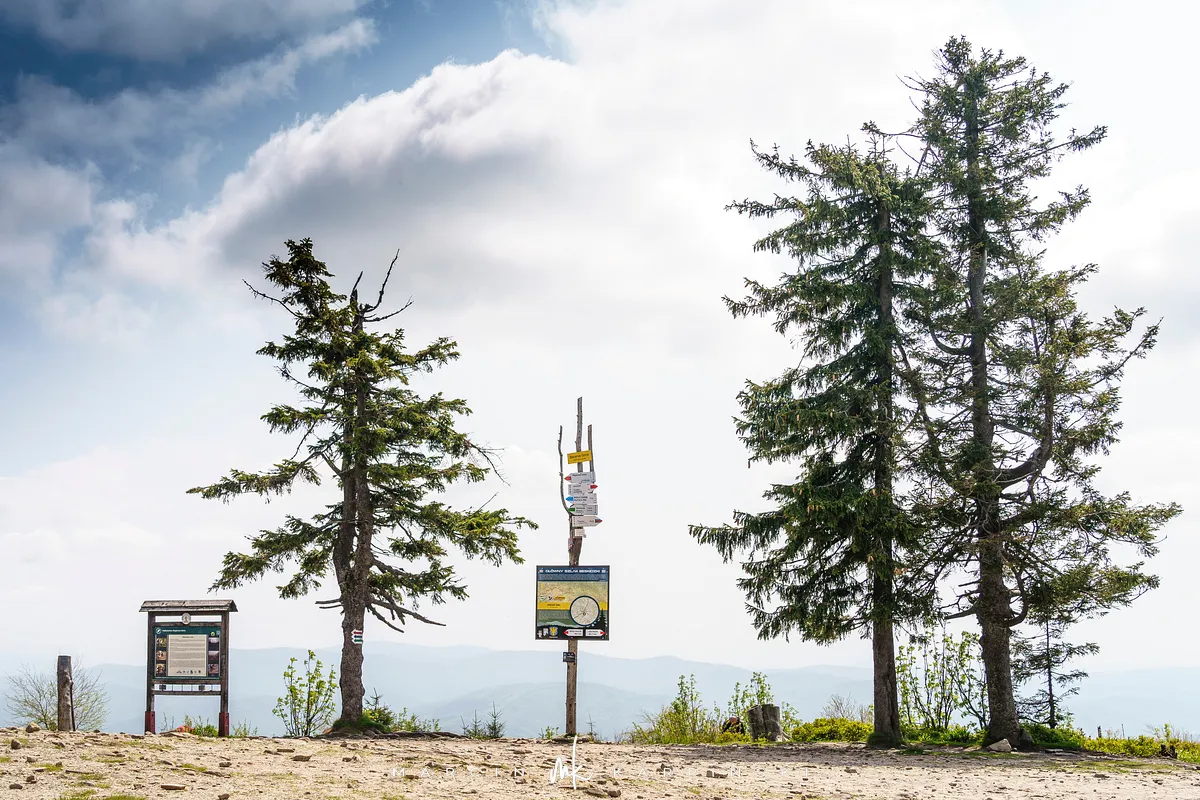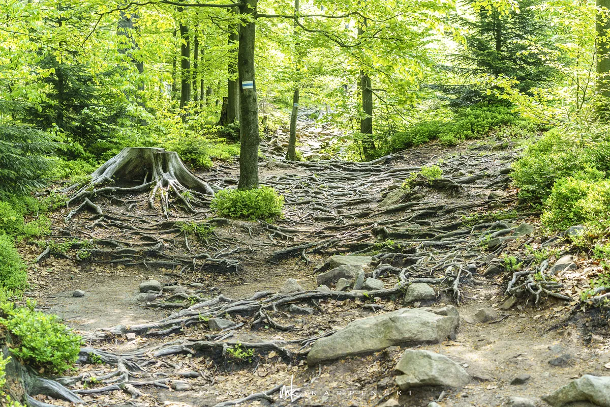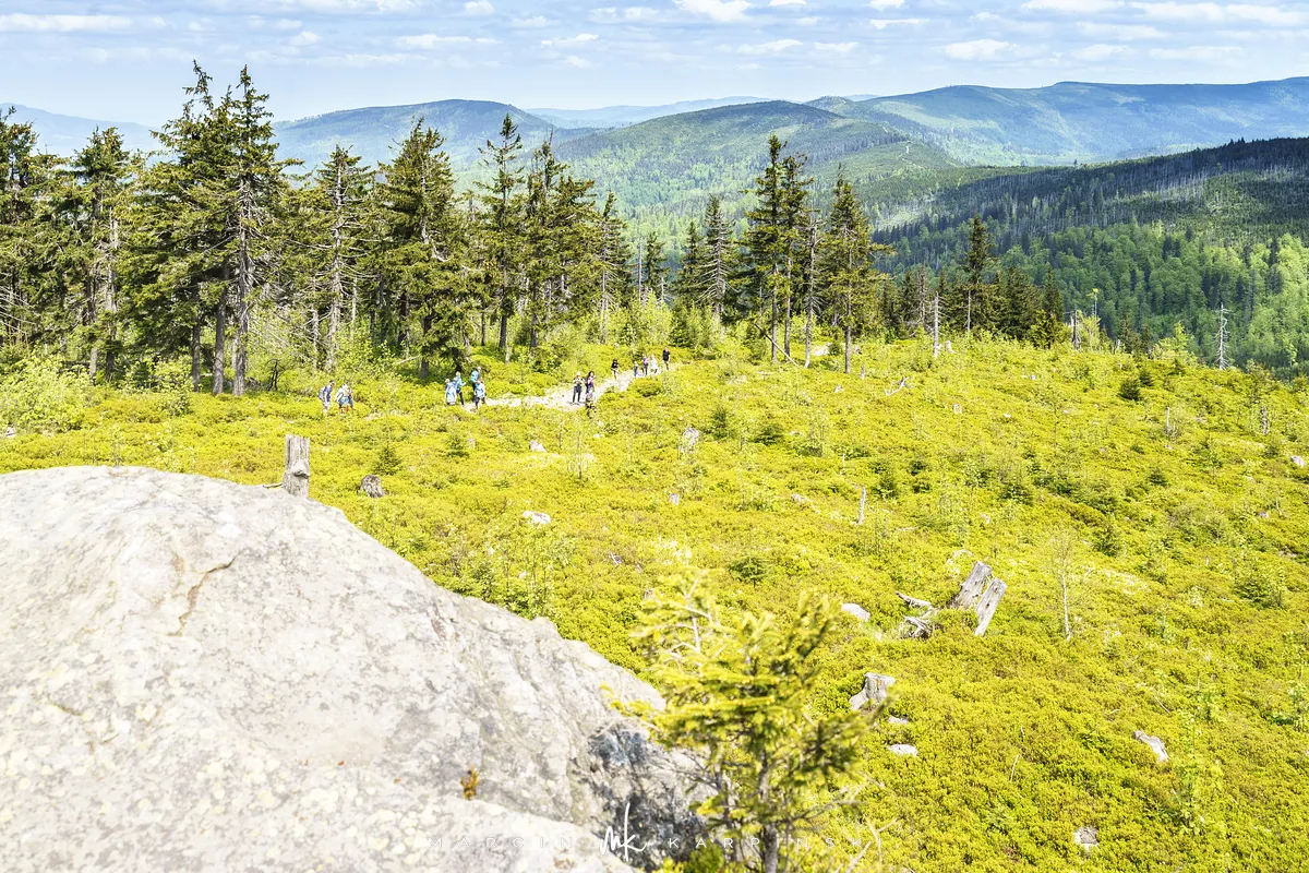 przez Cieńków. Wędrówkę rozpoczynamy sprzed budynku Ochotniczej Straży Pożarnej „Wisła Czarne”, przed którym znajduje się dość duży płatny parking. Pierwsze 3 kilometry idziemy asfaltową drogą, wzdłuż potoku Biała Wisełka. Następnie skręcamy z drogi w prawo, zgodnie z oznaczeniem szlaku. Droga zaczyna delikatnie piąć się do góry. Po prawej stronie mijamy Kaskady Rodła, czyli zespół wodospadów i progów rzecznych. Jest ich około dwudziestu pięciu. Dwa największe mają 3,5 i 5 metrów wysokości. Cały czas idziemy lasem. Im wyżej wchodzimy, to staje się on rzadszy. Spomiędzy drzew zaczynają się wyłaniać widoki okolicznych wzniesień. Dochodzimy do punktu, w którym nasz niebieski szlak łączy się z czerwonym i zielonym. Od tego miejsca do szczytu zostało 300 metrów marszu.