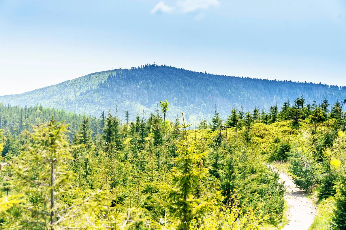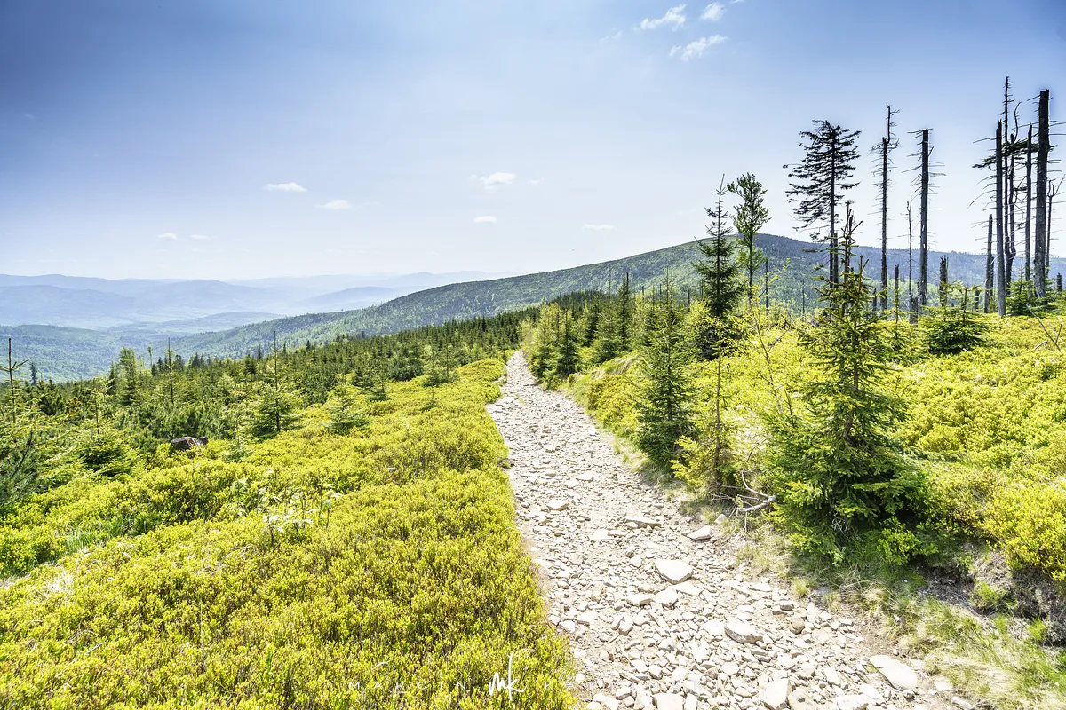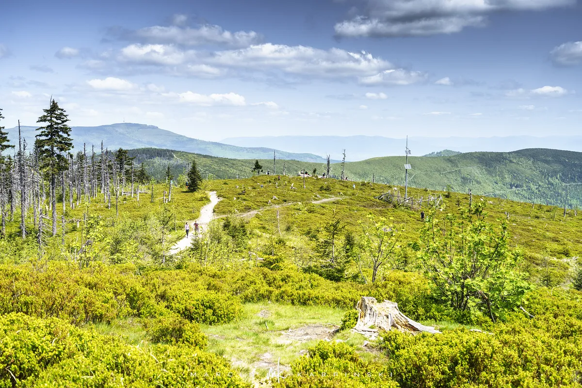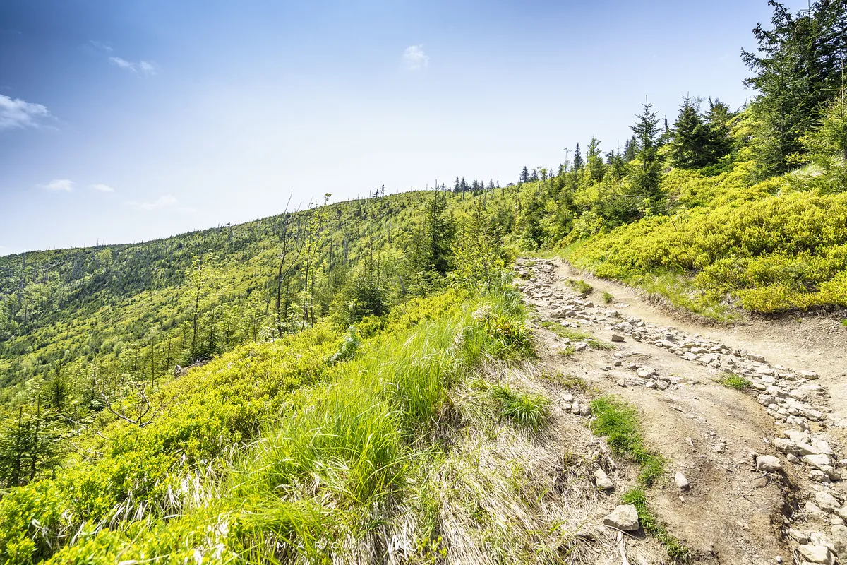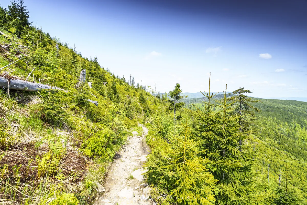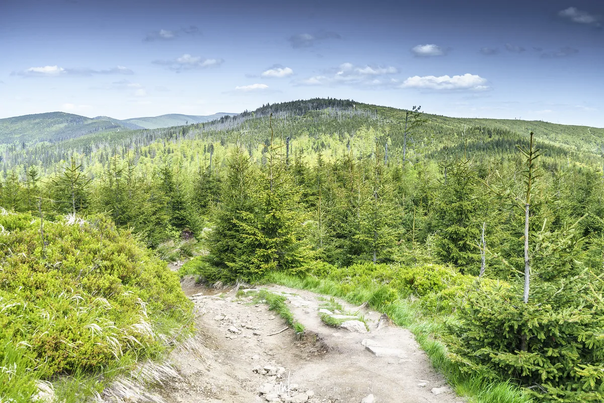 przez Cieńków. Wędrówkę rozpoczynamy sprzed budynku Ochotniczej Straży Pożarnej „Wisła Czarne”, przed którym znajduje się dość duży płatny parking. Pierwsze 3 kilometry idziemy asfaltową drogą, wzdłuż potoku Biała Wisełka. Następnie skręcamy z drogi w prawo, zgodnie z oznaczeniem szlaku. Droga zaczyna delikatnie piąć się do góry. Po prawej stronie mijamy Kaskady Rodła, czyli zespół wodospadów i progów rzecznych. Jest ich około dwudziestu pięciu. Dwa największe mają 3,5 i 5 metrów wysokości. Cały czas idziemy lasem. Im wyżej wchodzimy, to staje się on rzadszy. Spomiędzy drzew zaczynają się wyłaniać widoki okolicznych wzniesień. Dochodzimy do punktu, w którym nasz niebieski szlak łączy się z czerwonym i zielonym. Od tego miejsca do szczytu zostało 300 metrów marszu.