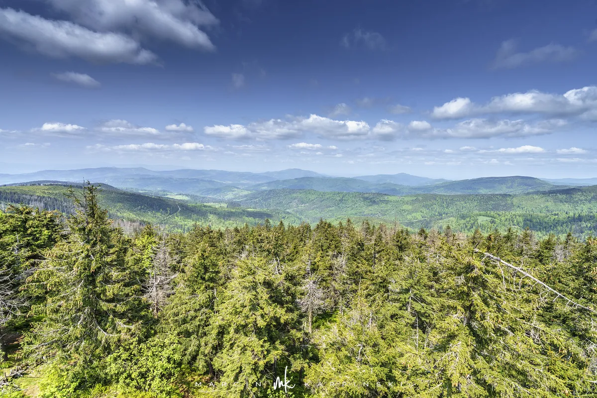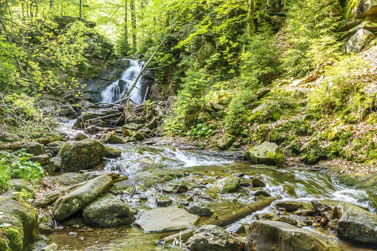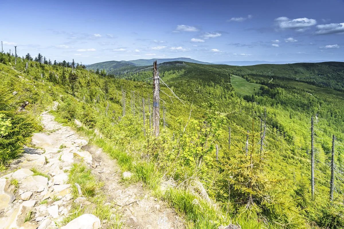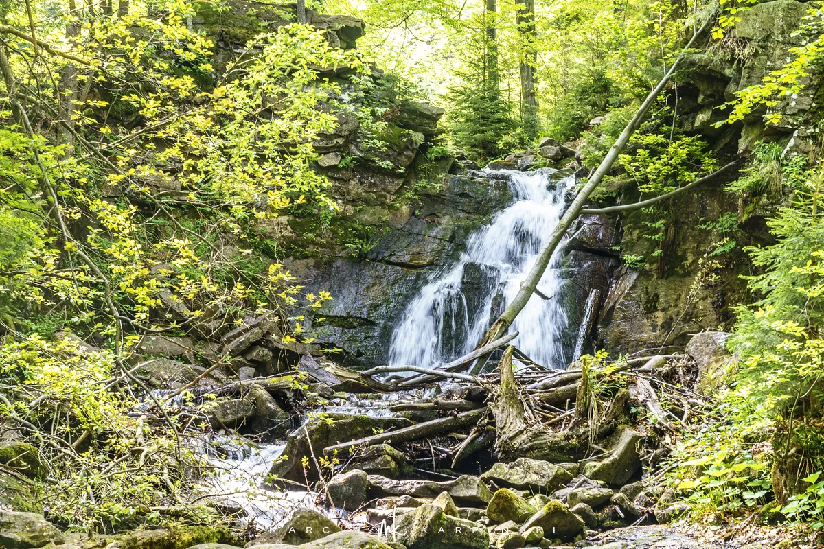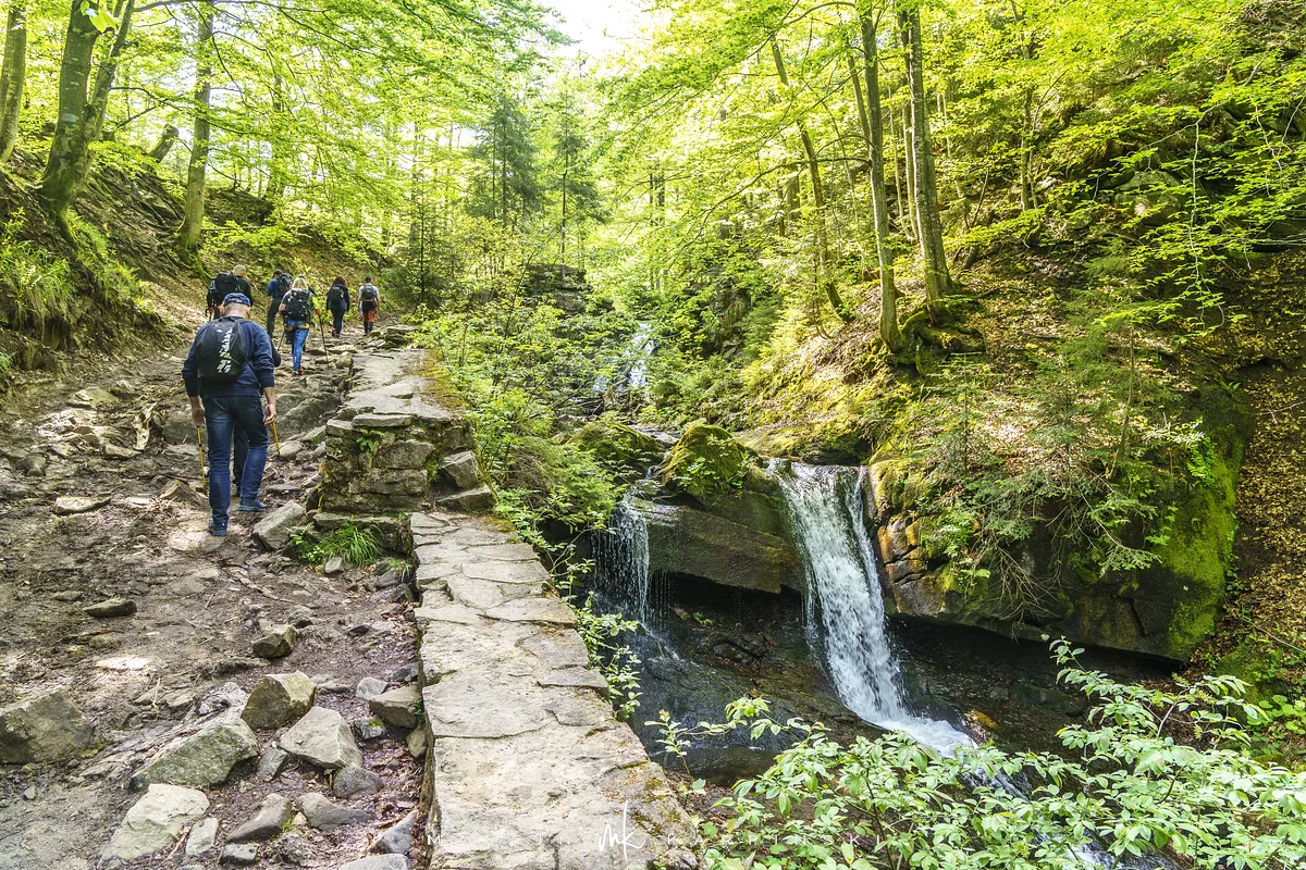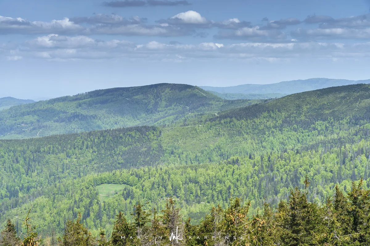 przez Cieńków. Wędrówkę rozpoczynamy sprzed budynku Ochotniczej Straży Pożarnej „Wisła Czarne”, przed którym znajduje się dość duży płatny parking. Pierwsze 3 kilometry idziemy asfaltową drogą, wzdłuż potoku Biała Wisełka. Następnie skręcamy z drogi w prawo, zgodnie z oznaczeniem szlaku. Droga zaczyna delikatnie piąć się do góry. Po prawej stronie mijamy Kaskady Rodła, czyli zespół wodospadów i progów rzecznych. Jest ich około dwudziestu pięciu. Dwa największe mają 3,5 i 5 metrów wysokości. Cały czas idziemy lasem. Im wyżej wchodzimy, to staje się on rzadszy. Spomiędzy drzew zaczynają się wyłaniać widoki okolicznych wzniesień. Dochodzimy do punktu, w którym nasz niebieski szlak łączy się z czerwonym i zielonym. Od tego miejsca do szczytu zostało 300 metrów marszu.