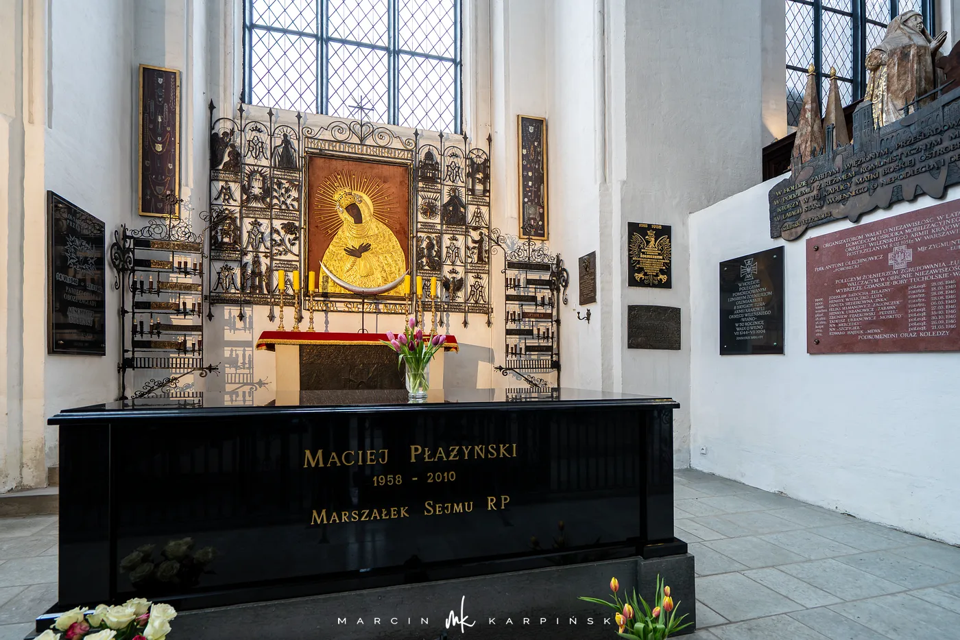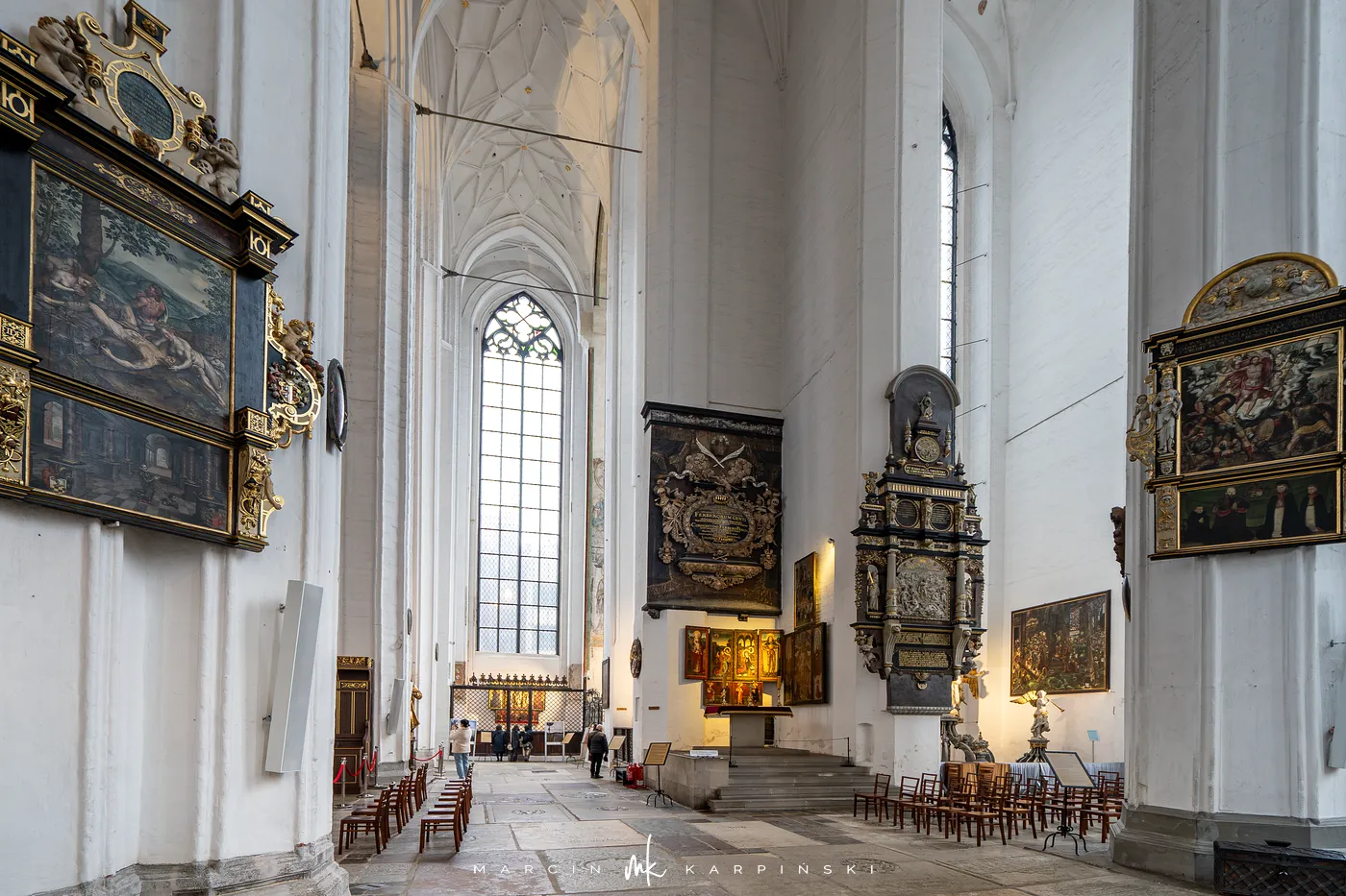 Posadzka świątyni pokryta jest blisko 400 płytami nagrobnymi mieszczan i przedstawicieli dawnych gdańskich rodów. Najstarsze z nich pochodzą z początku XV wieku. Charakterystycznym elementem wnętrza są przypory wprowadzone do środka budowli. Między nimi utworzono wieniec kaplic, fundowanych przez bogate rodziny, bractwa oraz cechy rzemieślnicze. Układ ten podkreśla halowy charakter bazyliki.