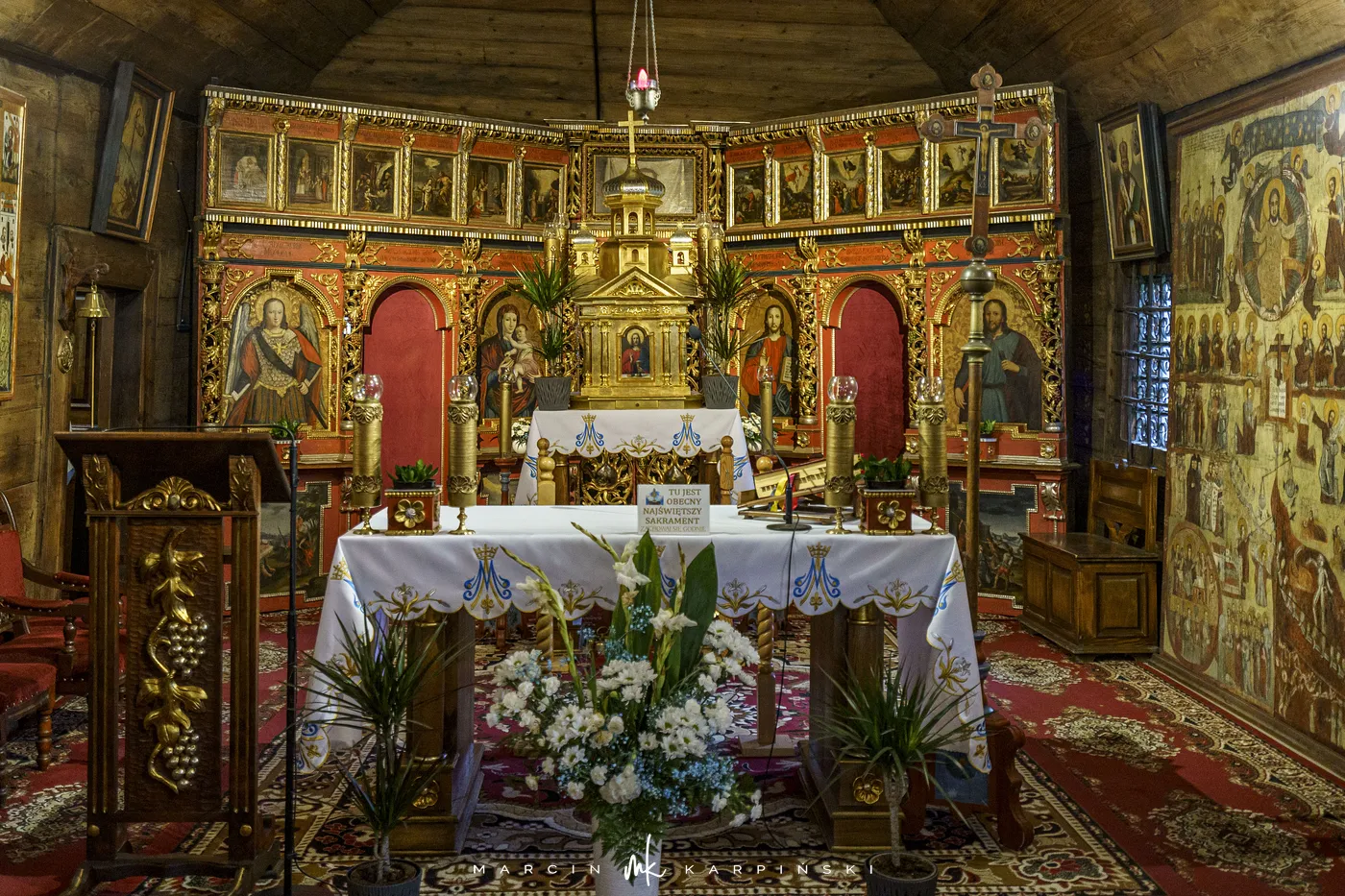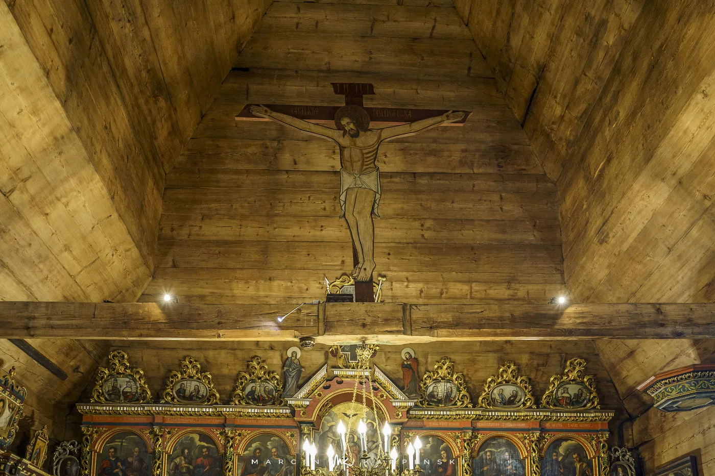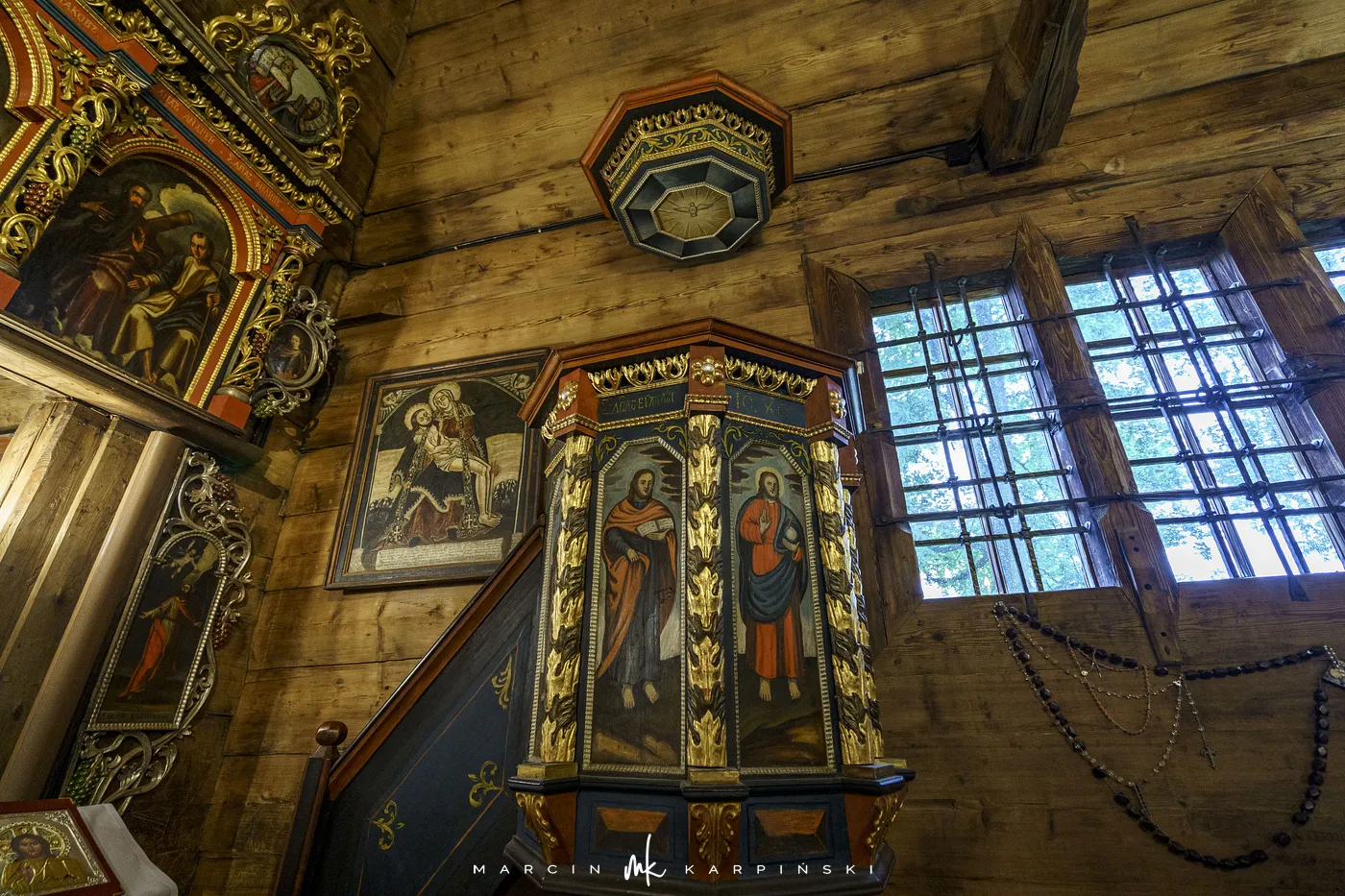 Cerkiew reprezentuje północno-zachodni typ cerkwi łemkowskiej, z prezbiterium skierowanym na wschód. Składa się z trzech części – babińca, nawy i prezbiterium. Wewnątrz uwagę przyciąga niezwykle bogata polichromia z 1607 roku, która ukazuje m.in. Boga Ojca, Ukrzyżowanie Chrystusa, Złożenie do Grobu, Wjazd Chrystusa na osiołku do Jerozolimy oraz Nadanie Mojżeszowi Dziesięciorga Przykazań. Ikonostas pochodzi z lat 1743–1744. Dzwon w wieży datowany jest na 1615 rok. Teren wokół cerkwi otacza kamienne ogrodzenie.