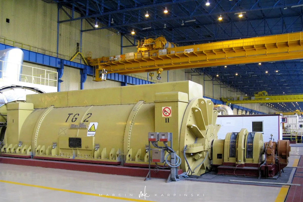 - napięcie z generatora trafia do połączonego z nim transformatora, który ma za zadanie ustalić odpowiedni poziom napięcia i wprowadzić je do systemu elektroenergetycznego.