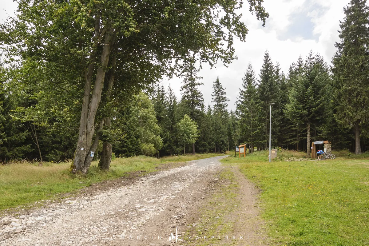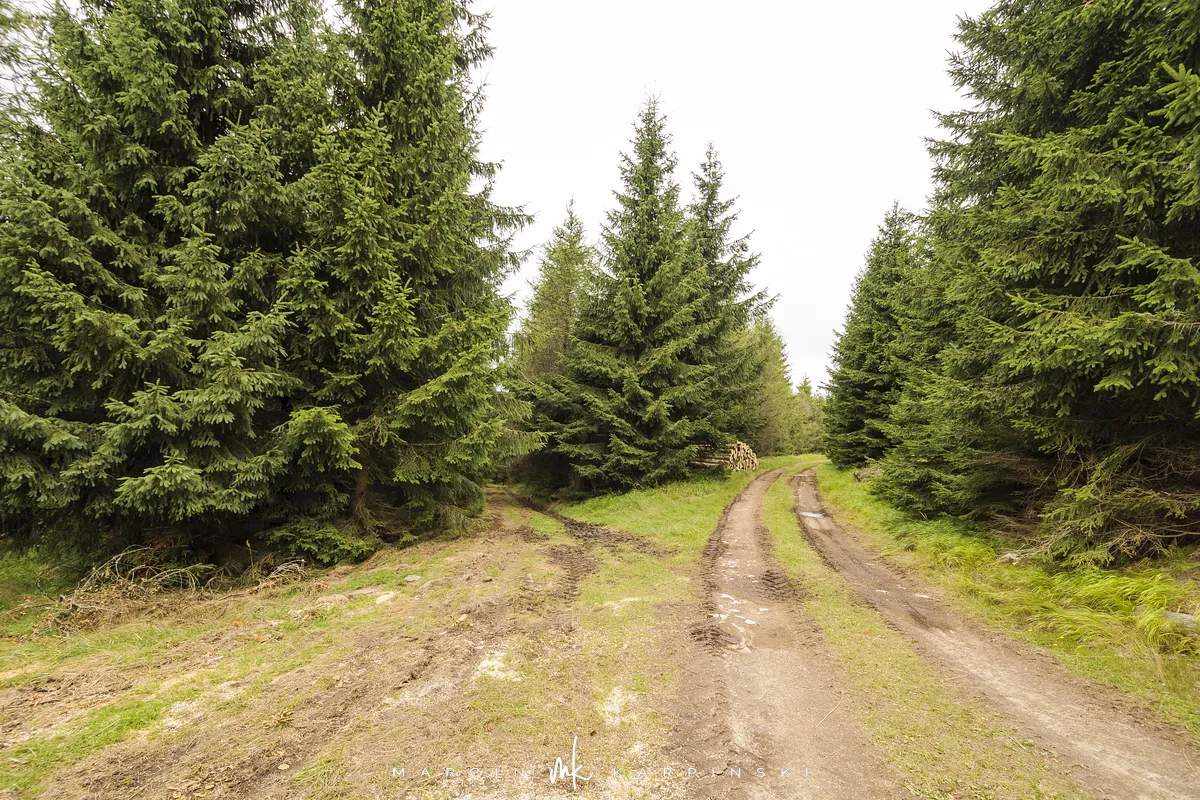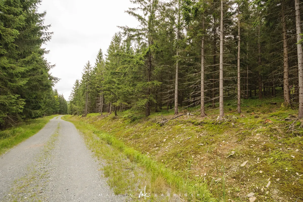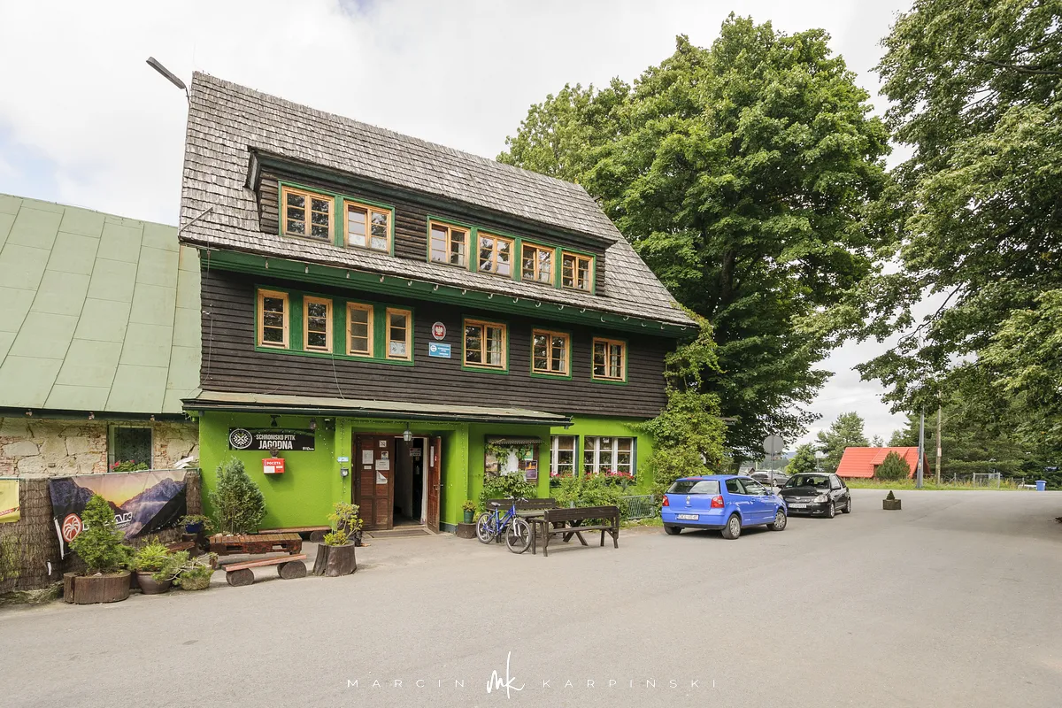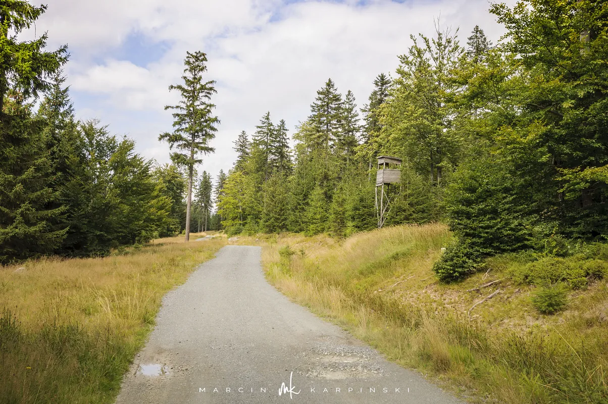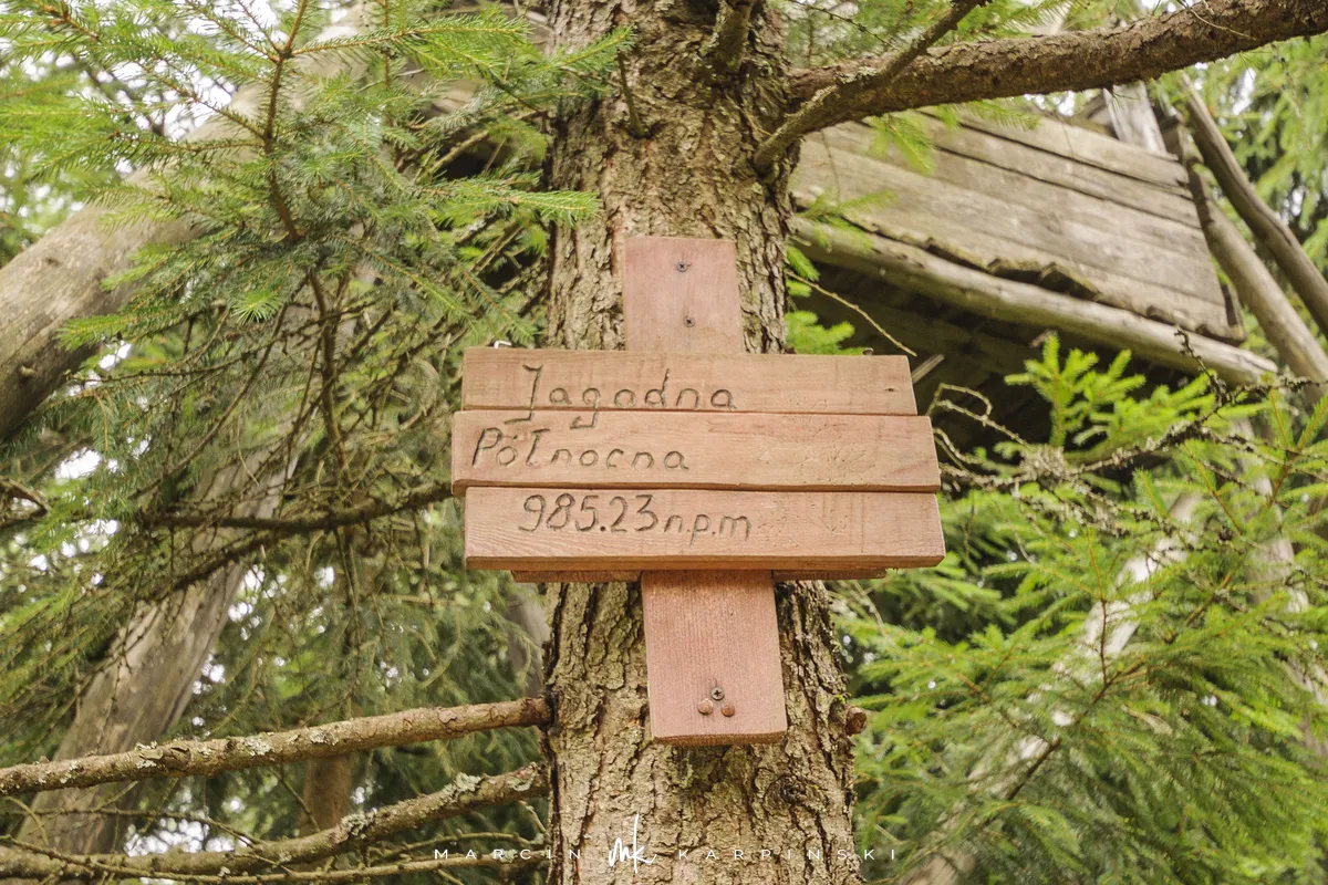 Na Jagodną można wejść dwiema trasami: od północy ze Schroniska PTTK Jagodna (808 m n.p.m.) lub od południa z Przełęczy pod Porębą (690 m n.p.m.). My wybraliśmy popularniejszy wariant spod schroniska. Samochód zostawiamy na dużym parkingu przy schronisku. Do samego budynku planujemy zajrzeć po zejściu ze szczytu. Często miejsce to bywa mylone z Przełęczą Spaloną, która faktycznie znajduje się kilkaset metrów na północny wschód. Od schroniska kierujemy się na południowy wschód, odnajdujemy oznaczenia niebieskiego szlaku, mijamy polanę i wchodzimy w las. Droga jest utwardzona i wygodna. Po kilkuset metrach szlak skręca na leśną ścieżkę, ale można również kontynuować marsz główną drogą, nie tracąc na widokach. Po drodze mijamy niewielkie wzniesienie o nazwie Sasin.