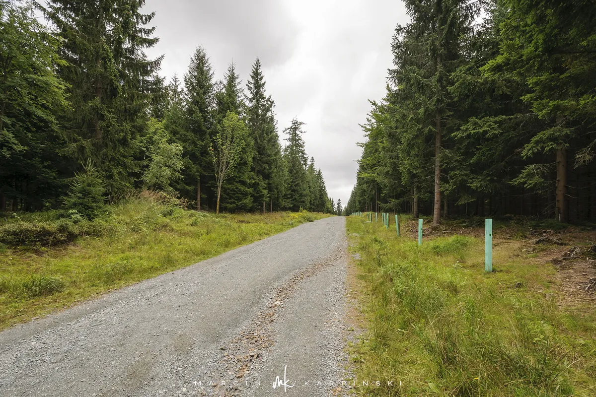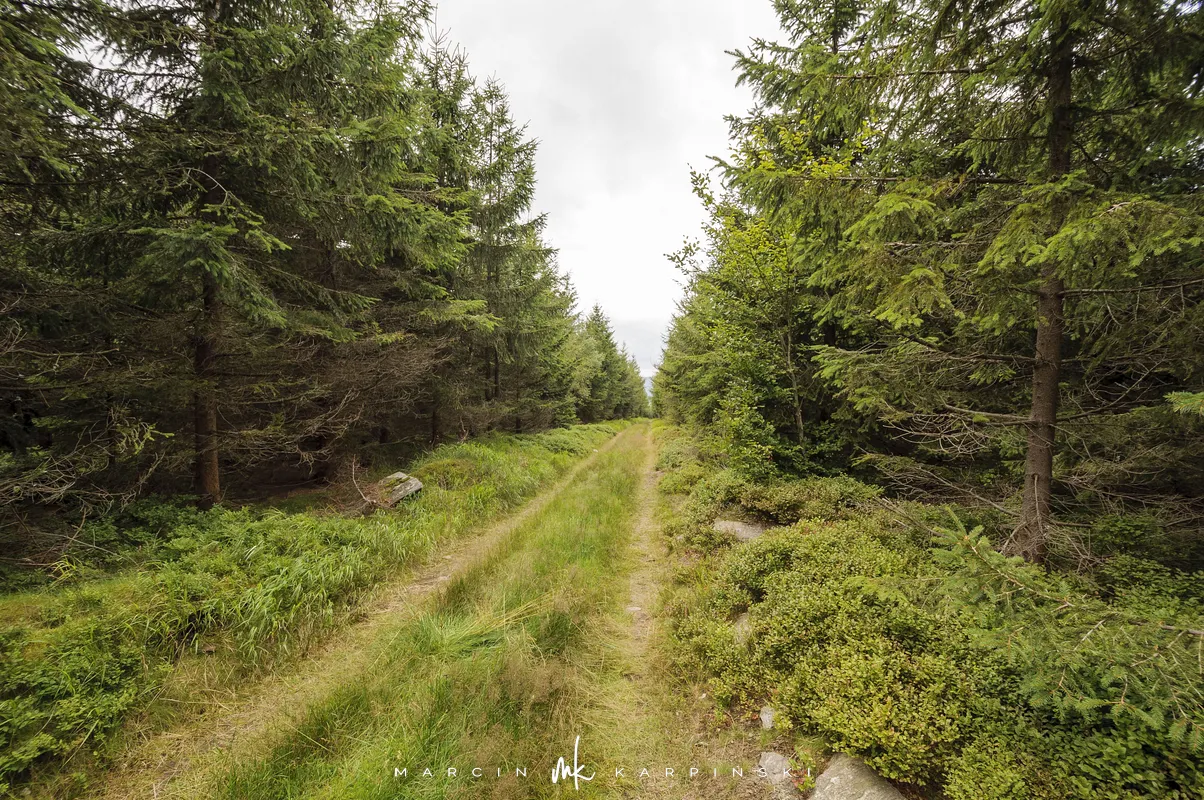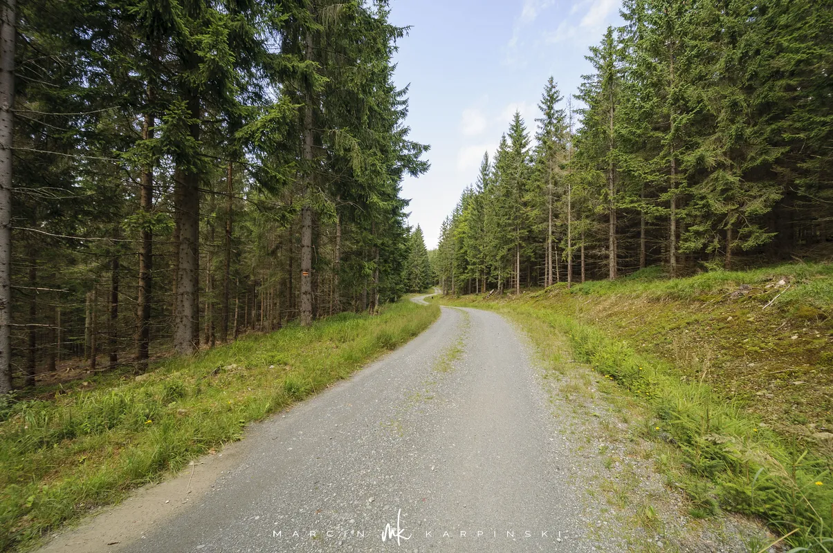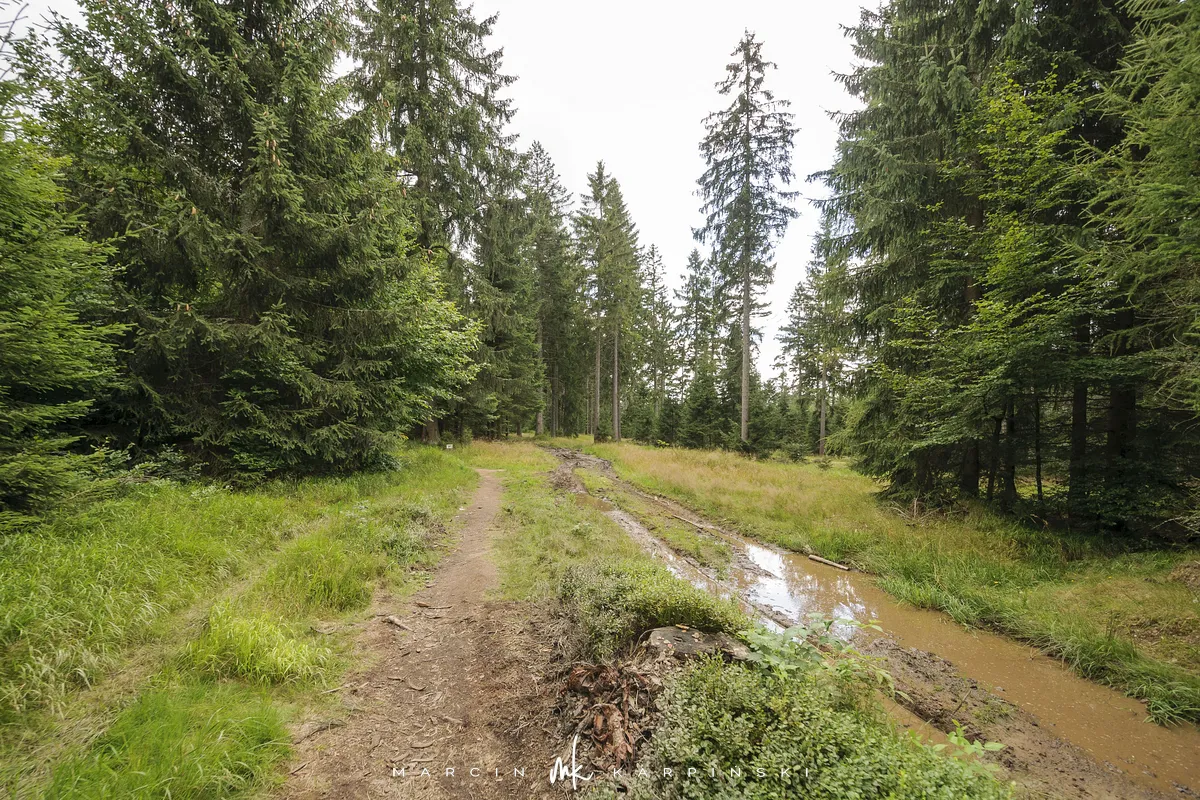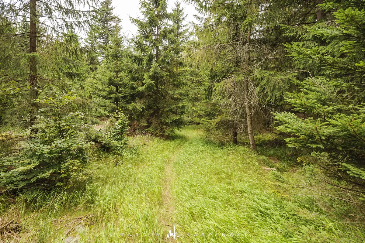Na Jagodną można wejść dwiema trasami: od północy ze Schroniska PTTK Jagodna (808 m n.p.m.) lub od południa z Przełęczy pod Porębą (690 m n.p.m.). My wybraliśmy popularniejszy wariant spod schroniska. Samochód zostawiamy na dużym parkingu przy schronisku. Do samego budynku planujemy zajrzeć po zejściu ze szczytu. Często miejsce to bywa mylone z Przełęczą Spaloną, która faktycznie znajduje się kilkaset metrów na północny wschód. Od schroniska kierujemy się na południowy wschód, odnajdujemy oznaczenia niebieskiego szlaku, mijamy polanę i wchodzimy w las. Droga jest utwardzona i wygodna. Po kilkuset metrach szlak skręca na leśną ścieżkę, ale można również kontynuować marsz główną drogą, nie tracąc na widokach. Po drodze mijamy niewielkie wzniesienie o nazwie Sasin.