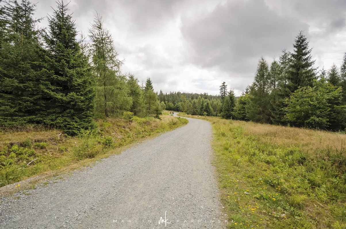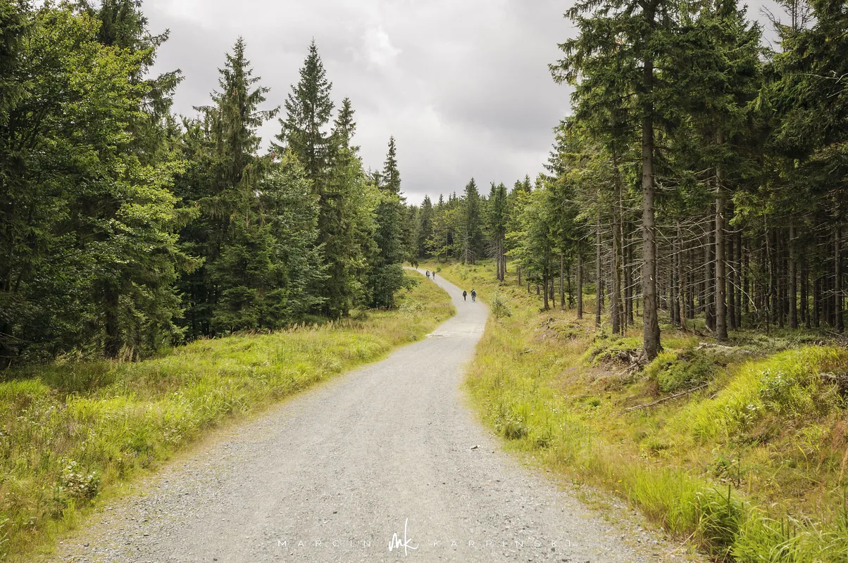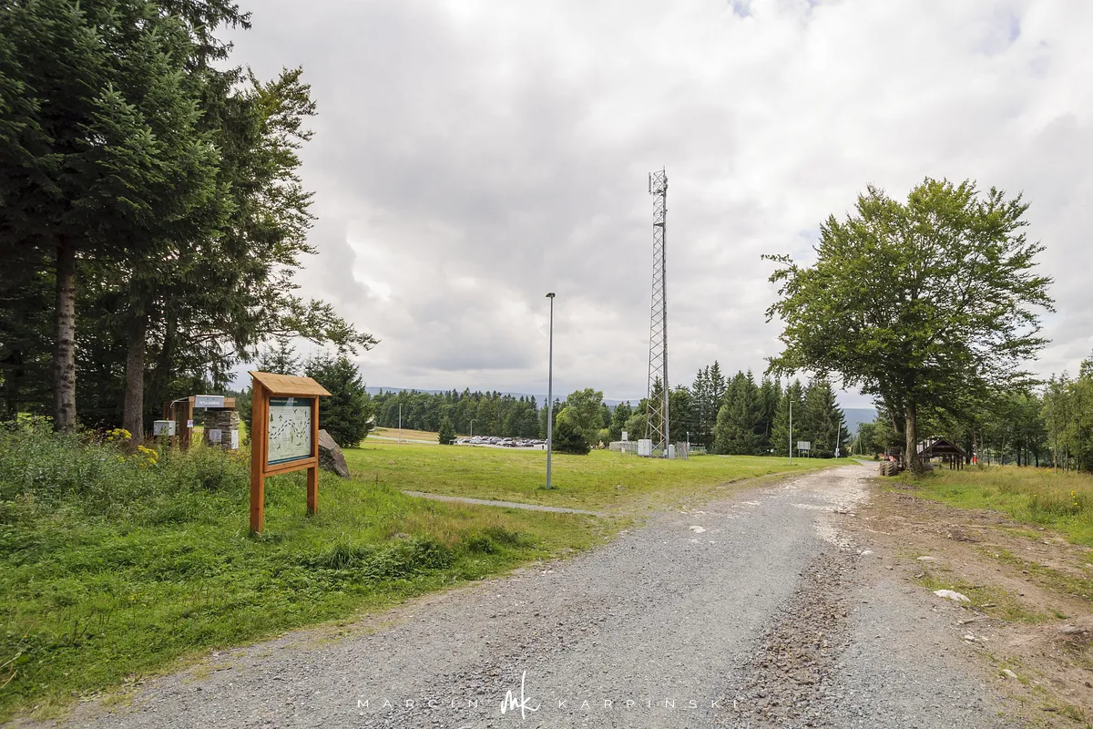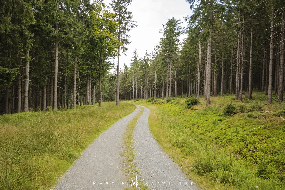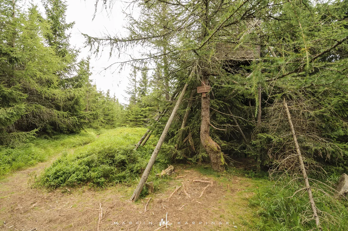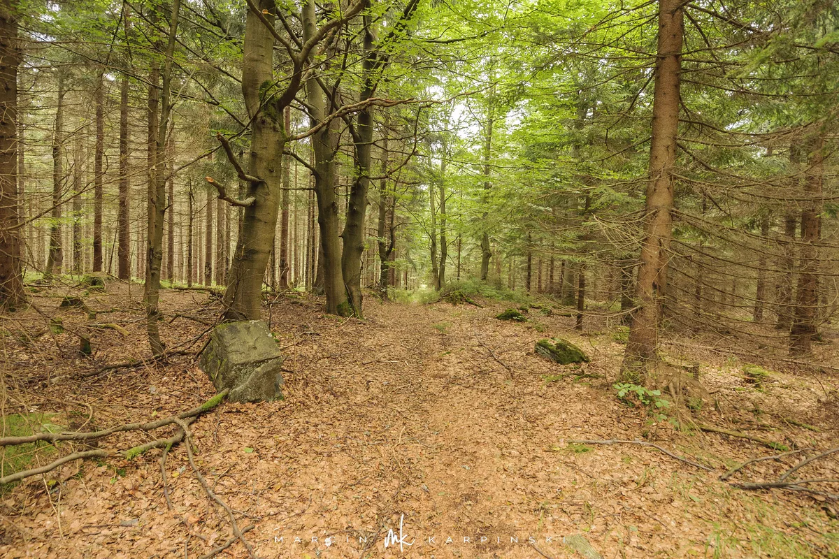 Na Jagodną można wejść dwiema trasami: od północy ze Schroniska PTTK Jagodna (808 m n.p.m.) lub od południa z Przełęczy pod Porębą (690 m n.p.m.). My wybraliśmy popularniejszy wariant spod schroniska. Samochód zostawiamy na dużym parkingu przy schronisku. Do samego budynku planujemy zajrzeć po zejściu ze szczytu. Często miejsce to bywa mylone z Przełęczą Spaloną, która faktycznie znajduje się kilkaset metrów na północny wschód. Od schroniska kierujemy się na południowy wschód, odnajdujemy oznaczenia niebieskiego szlaku, mijamy polanę i wchodzimy w las. Droga jest utwardzona i wygodna. Po kilkuset metrach szlak skręca na leśną ścieżkę, ale można również kontynuować marsz główną drogą, nie tracąc na widokach. Po drodze mijamy niewielkie wzniesienie o nazwie Sasin.