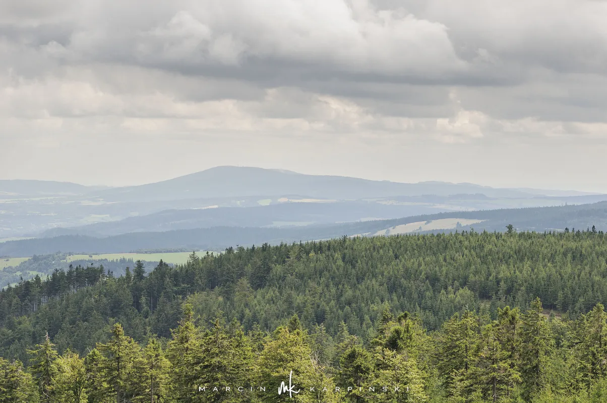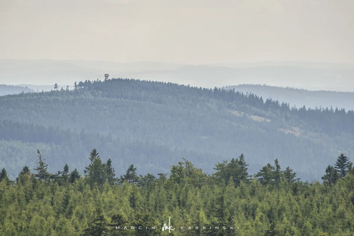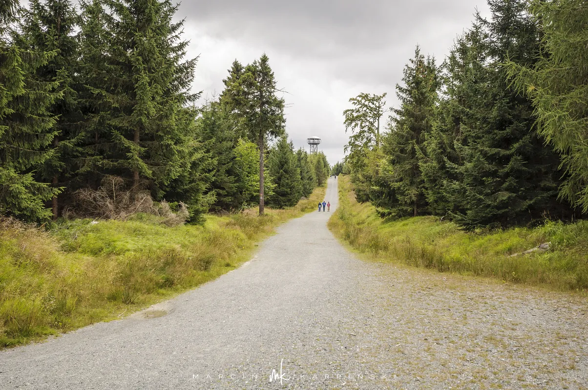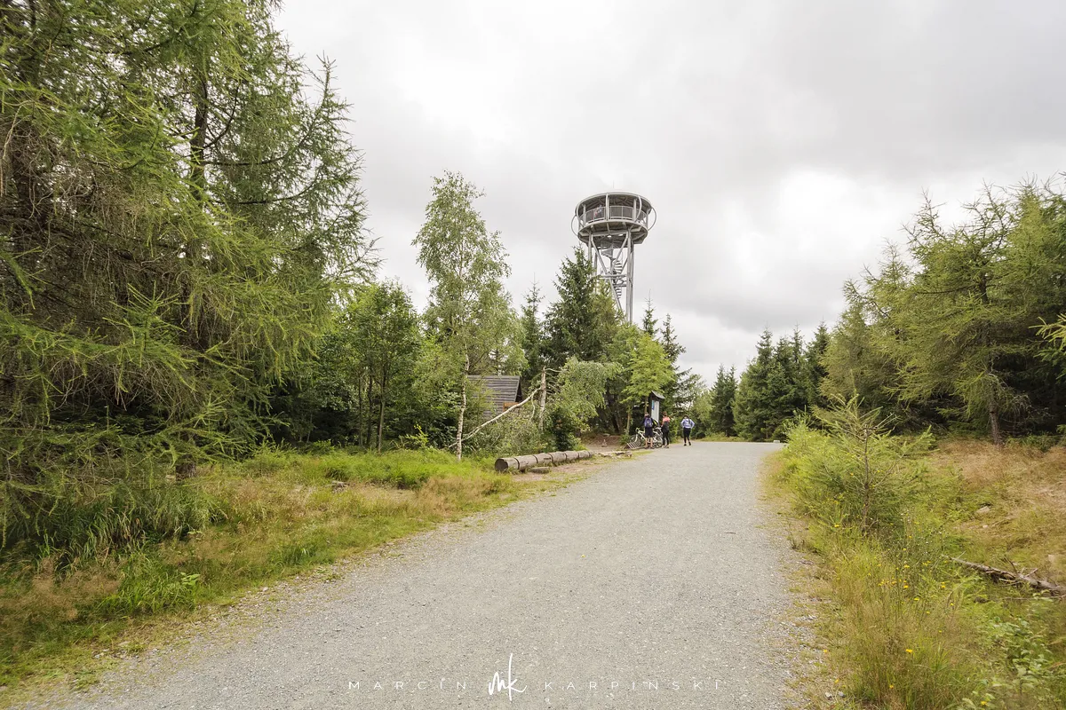 Po niespełna godzinie marszu przy słupku z numerem 158 opuszczamy szlak, skręcając w prawo na wąską leśną ścieżkę. Po kilku minutach docieramy na szczyt Jagodnej Północnej, który jest wyższym wierzchołkiem Jagodnej. Wierzchołek jest oznaczony, więc nie ma problemu z jego odnalezieniem. Po krótkim odpoczynku ruszamy dalej. Aby uniknąć powrotu tą samą drogą, wybieramy ścieżkę prowadzącą w lewo, dzięki czemu po około dziesięciu minutach ponownie wchodzimy na szlak. Z tego miejsca widać już szczyt wieży widokowej, do której docieramy po kilku minutach.