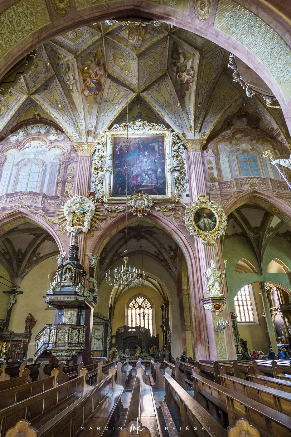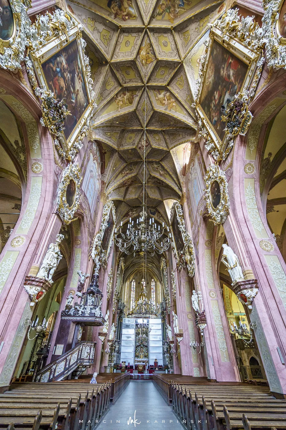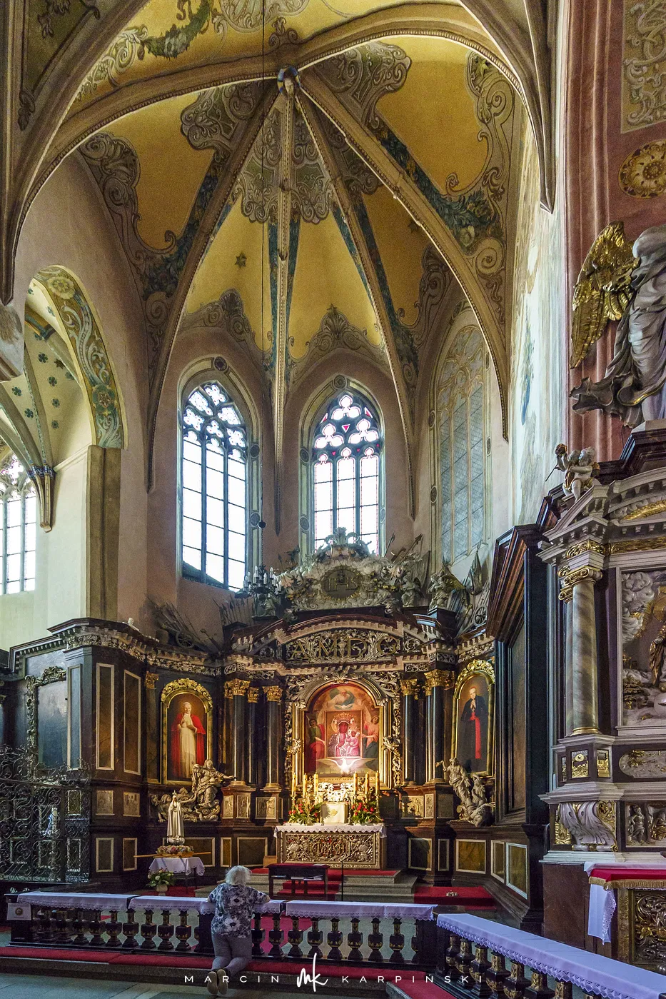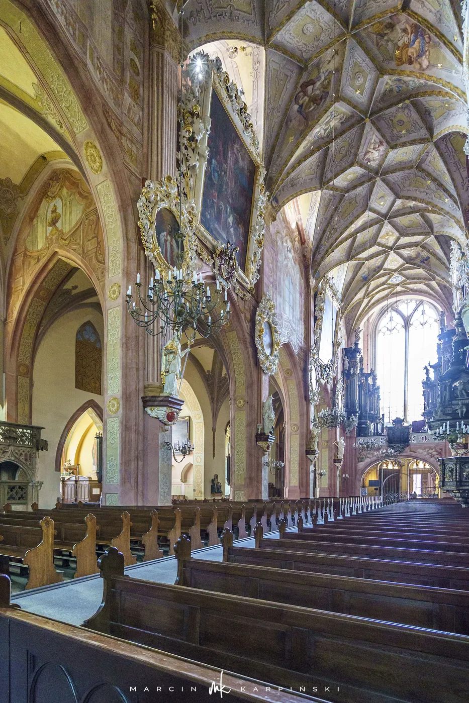 Kościół ma układ bazylikowy z trzema nawami i prezbiterium. Cechą charakterystyczną jest najwyższa wieża kościelna na Śląsku, mierząca około 103 metry. Z zewnątrz zachwyca gotyckimi portalami i dużym oknem, a w środku urzeka bogactwem barokowych ołtarzy, kaplic oraz malowideł ściennych.