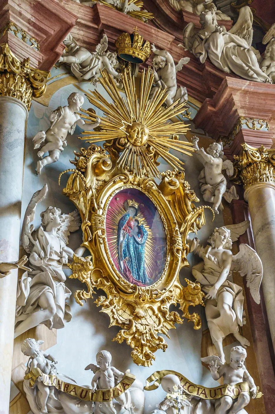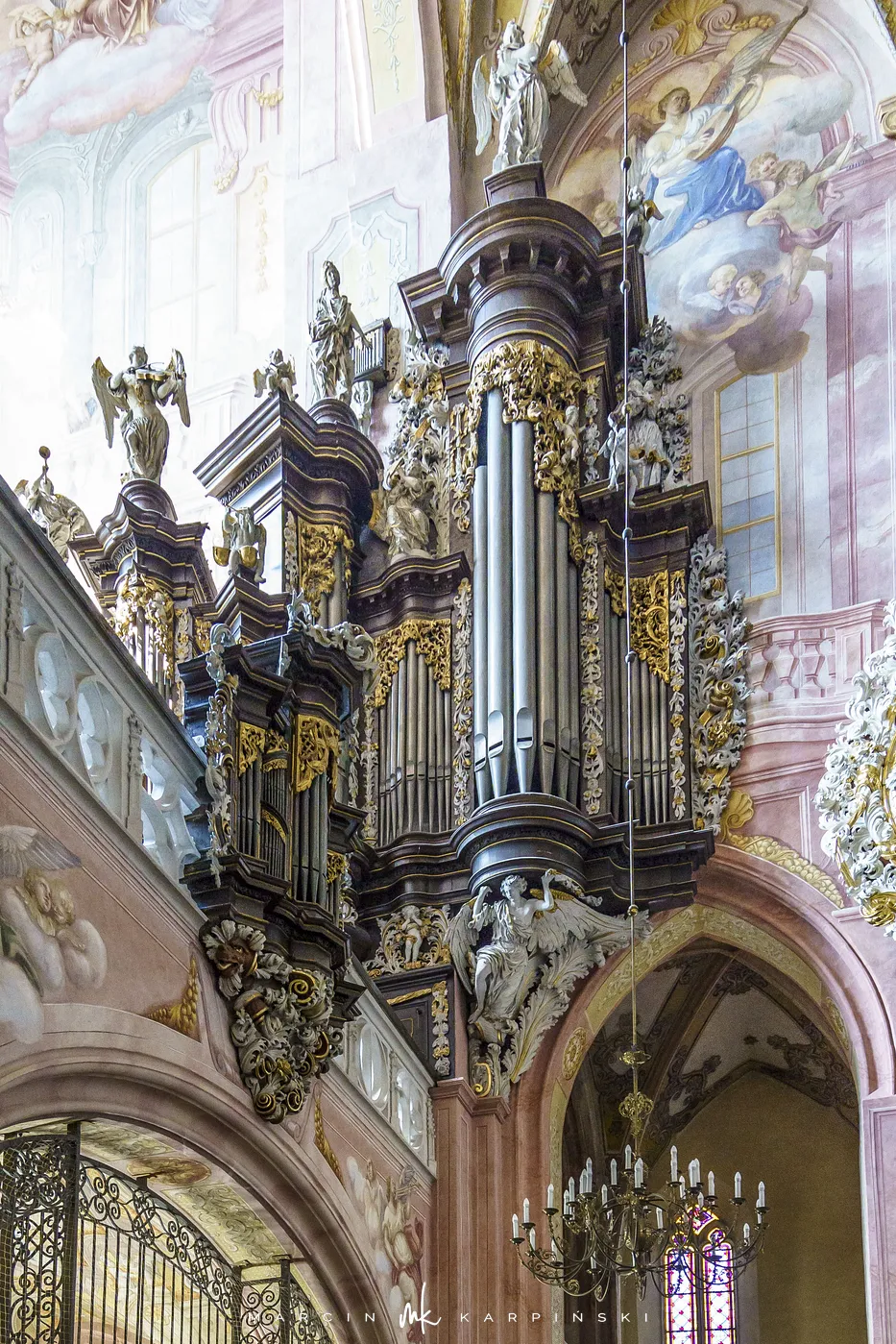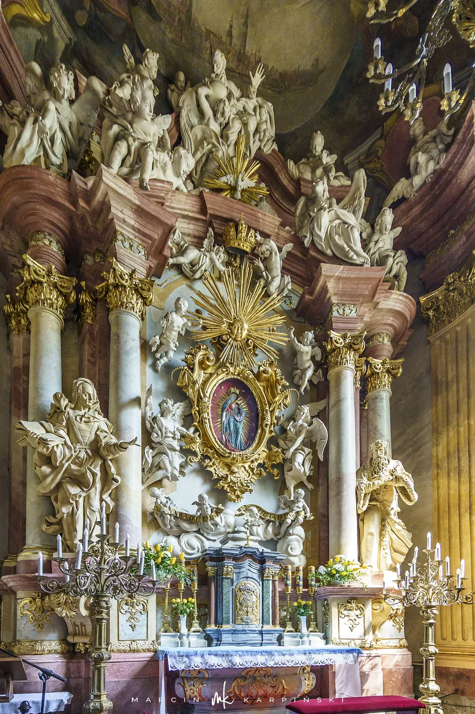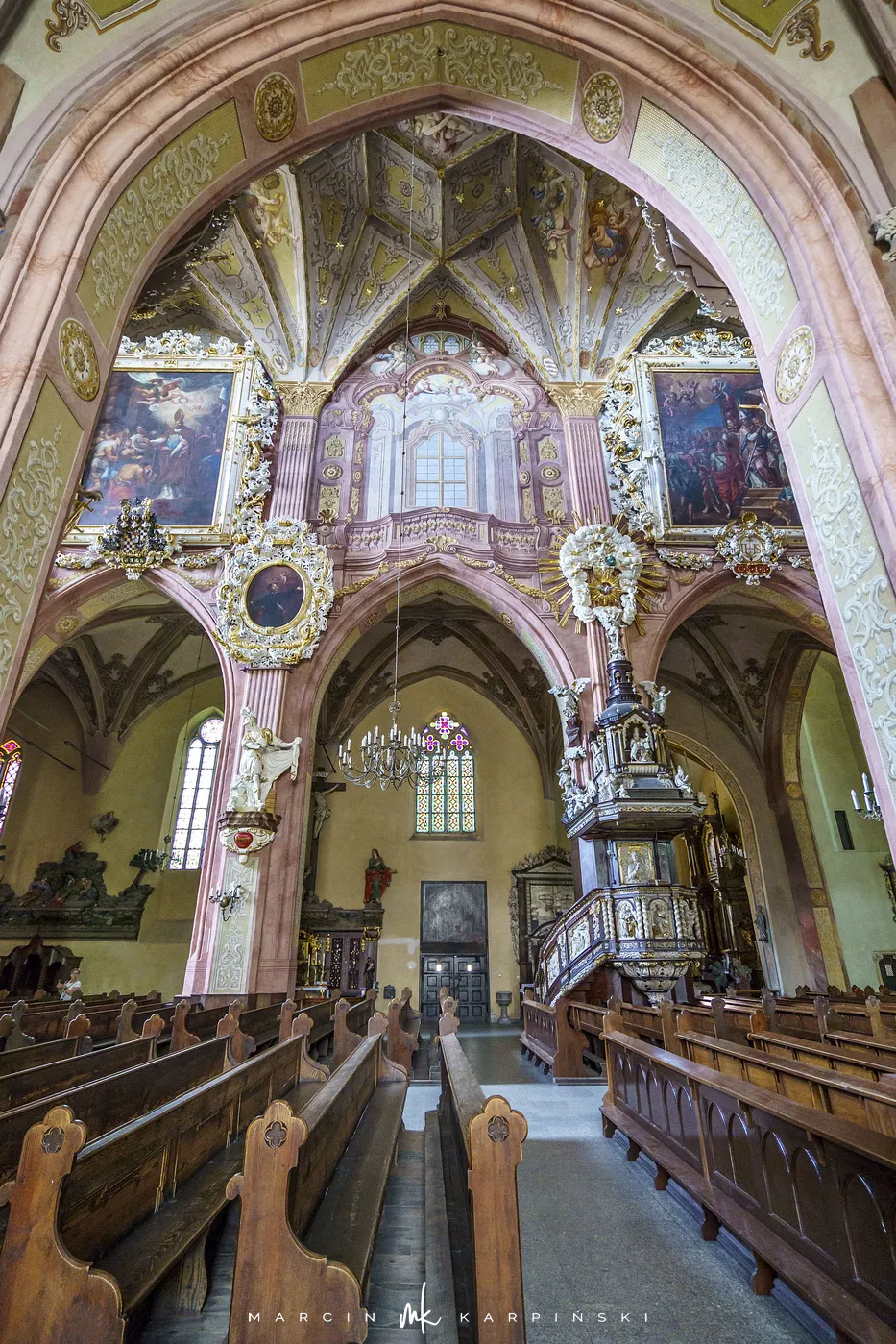 Kościół ma układ bazylikowy z trzema nawami i prezbiterium. Cechą charakterystyczną jest najwyższa wieża kościelna na Śląsku, mierząca około 103 metry. Z zewnątrz zachwyca gotyckimi portalami i dużym oknem, a w środku urzeka bogactwem barokowych ołtarzy, kaplic oraz malowideł ściennych.