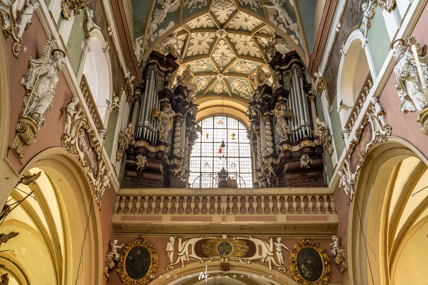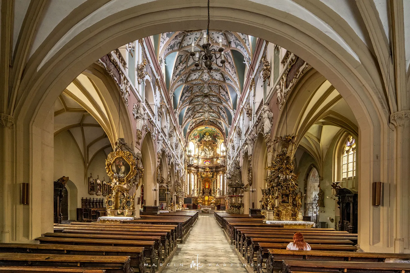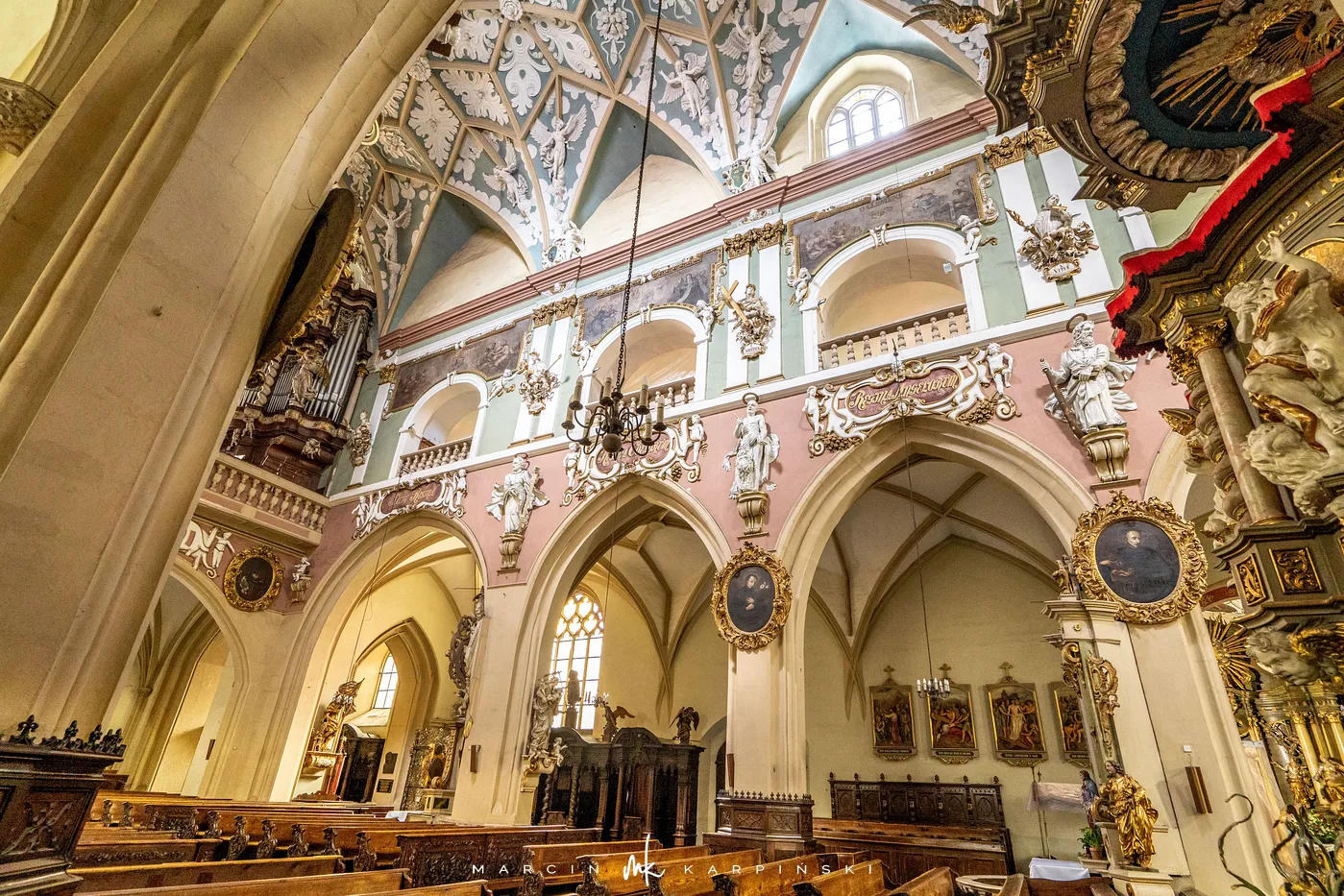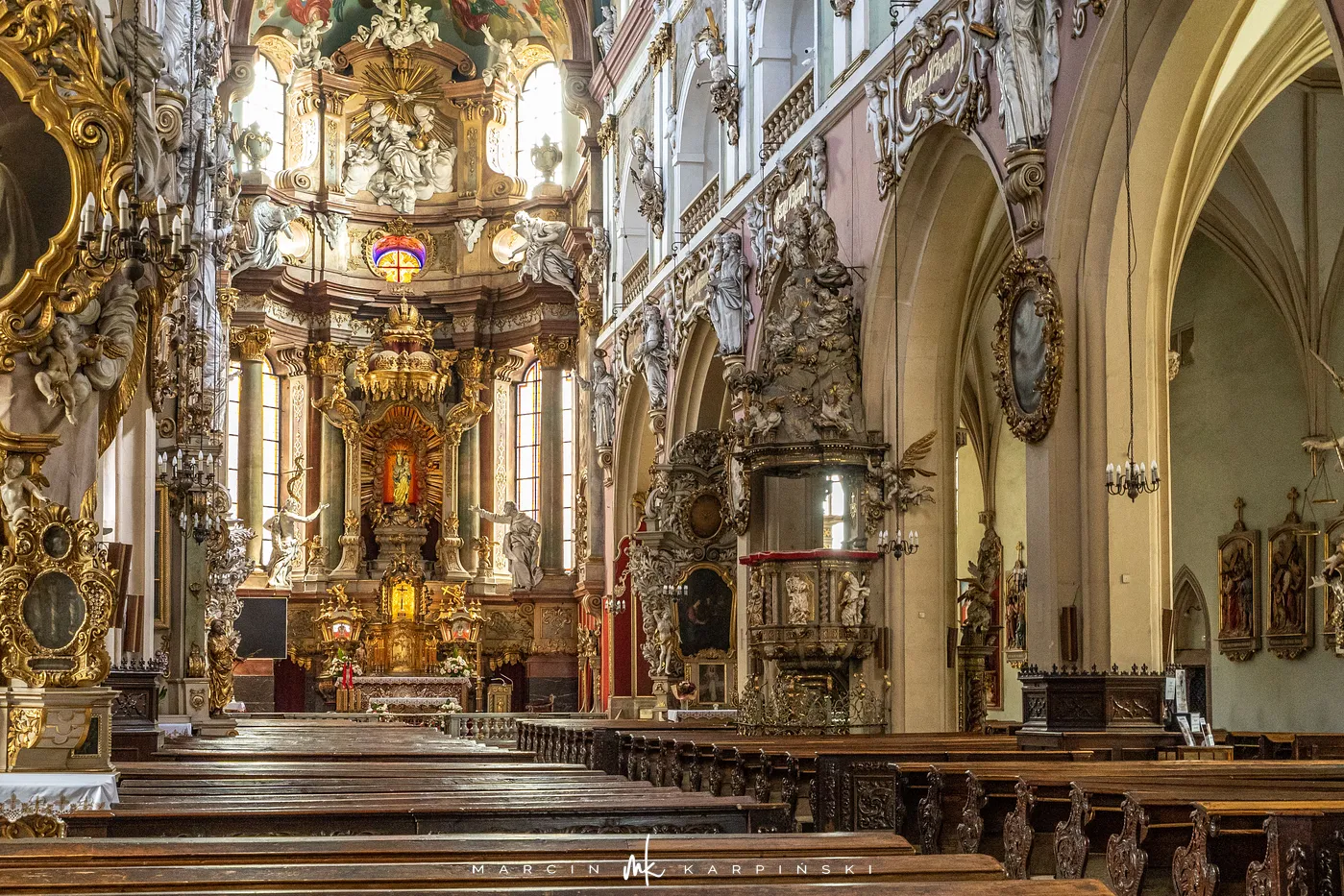Świątynia ma formę trójnawowej bazyliki. Charakterystycznym elementem są dwie wieże - południowa zwana Białą i północna nazywana Czarną. Wnętrze otrzymało w XVIII wieku bogaty wystrój barokowy. Główny ołtarz, ambona i liczne rzeźby nadają mu monumentalny charakter. W kościele zachowały się także gotyckie detale. W 2016 roku została podniesiona do rangi kolegiaty.