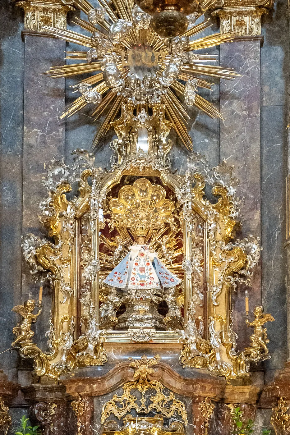 Wnętrze kościoła, przebudowane w stylu barokowym, skrywa liczne dzieła sztuki. Jednak największym skarbem jest niewielka woskowa figurka Dzieciątka Jezus, pochodząca prawdopodobnie z Hiszpanii i podarowana karmelitom w 1628 roku. Zyskała sławę cudownej dzięki licznym świadectwom łask i uzdrowień, stając się celem pielgrzymek z całego świata. Figurkę ubiera się w bogato zdobione szatki liturgiczne, które ofiarowują wierni – kolekcja liczy setki strojów, w tym dar papieży i monarchów.