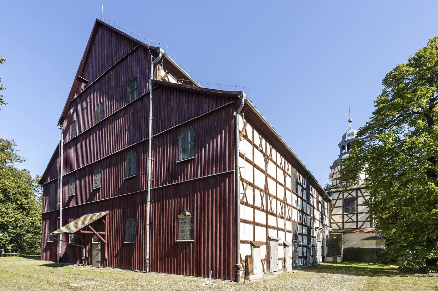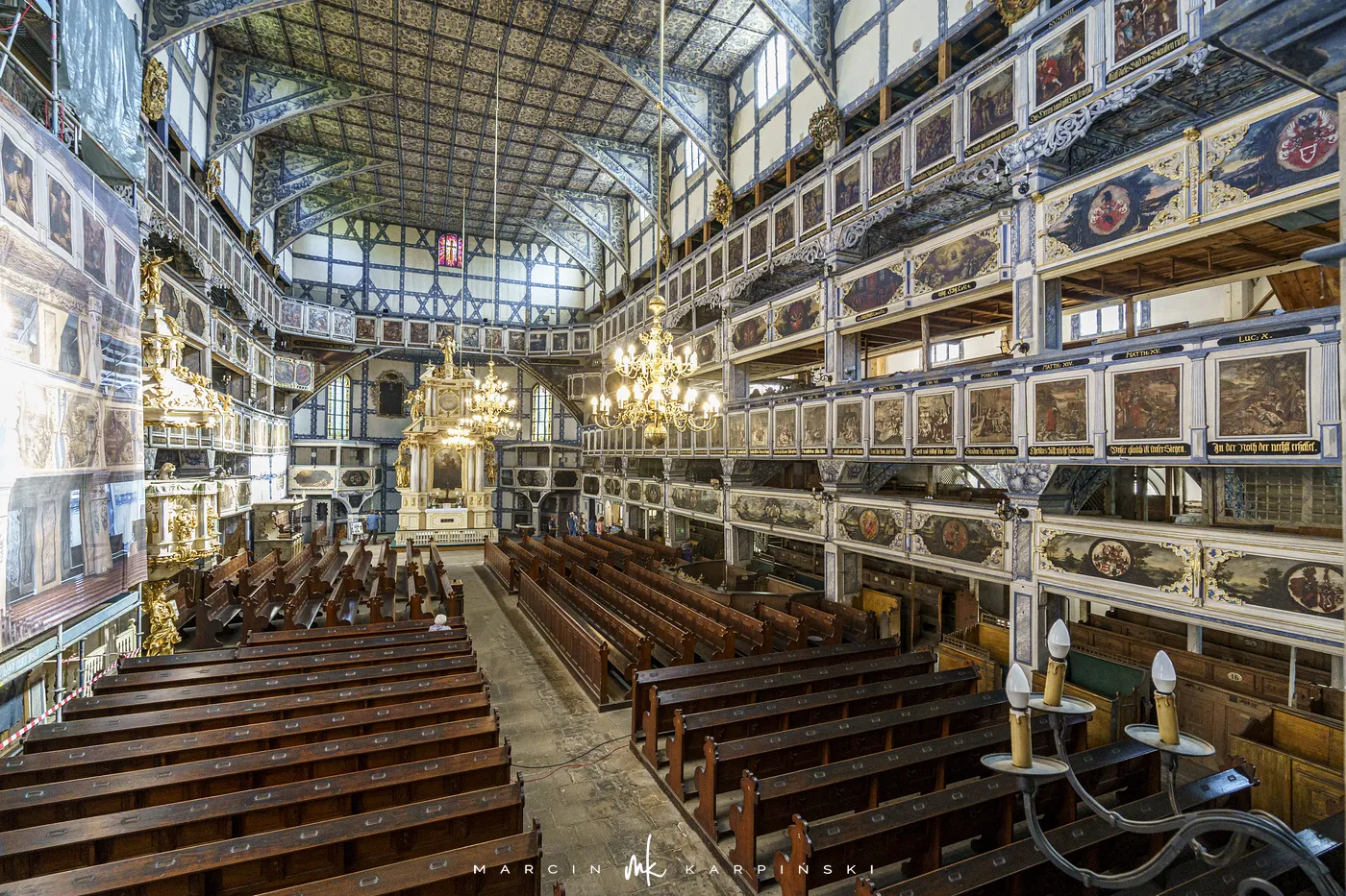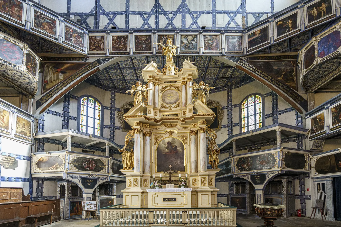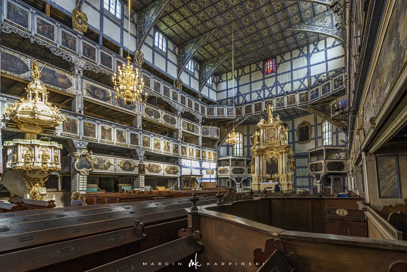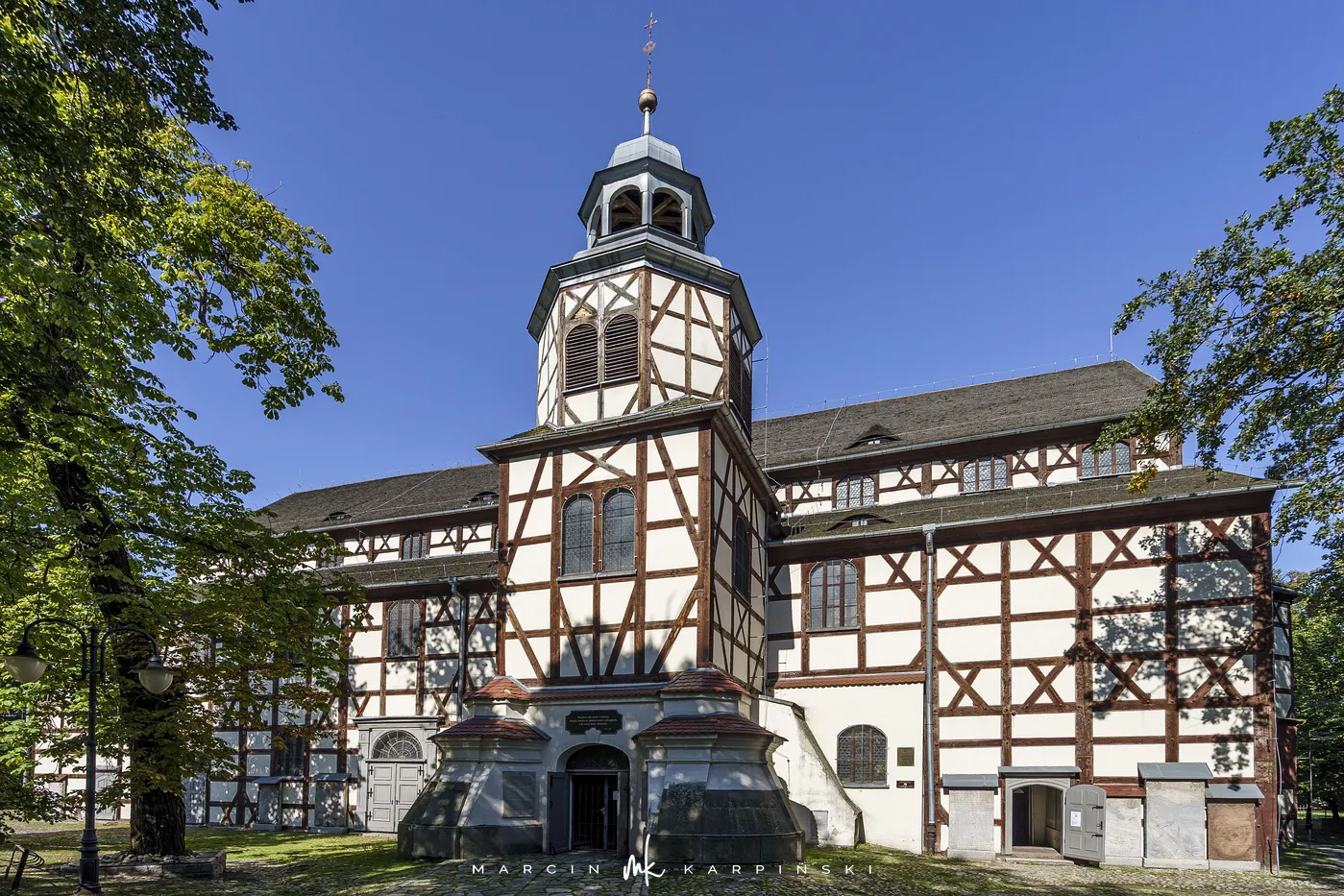 Budowa kościoła rozpoczęła się w 1654 roku, a jego wzniesienie trwało zaledwie jeden rok. Ze względu na ograniczenia narzucone przez cesarza Habsburgów, świątynia mogła być zbudowana jedynie z nietrwałych materiałów, takich jak drewno, glina i słoma, oraz znajdować się poza murami miasta. Pomimo tych restrykcji, kościół zachwyca swoją monumentalnością i bogatym barokowym wystrojem wnętrza. Budowla ma konstrukcję szachulcową i może pomieścić około 6 tysięcy wiernych. Wnętrze wyróżnia się bogatymi zdobieniami, w tym drewnianą amboną, ozdobnym ołtarzem oraz licznymi malowidłami i emporami z herbami fundatorów.