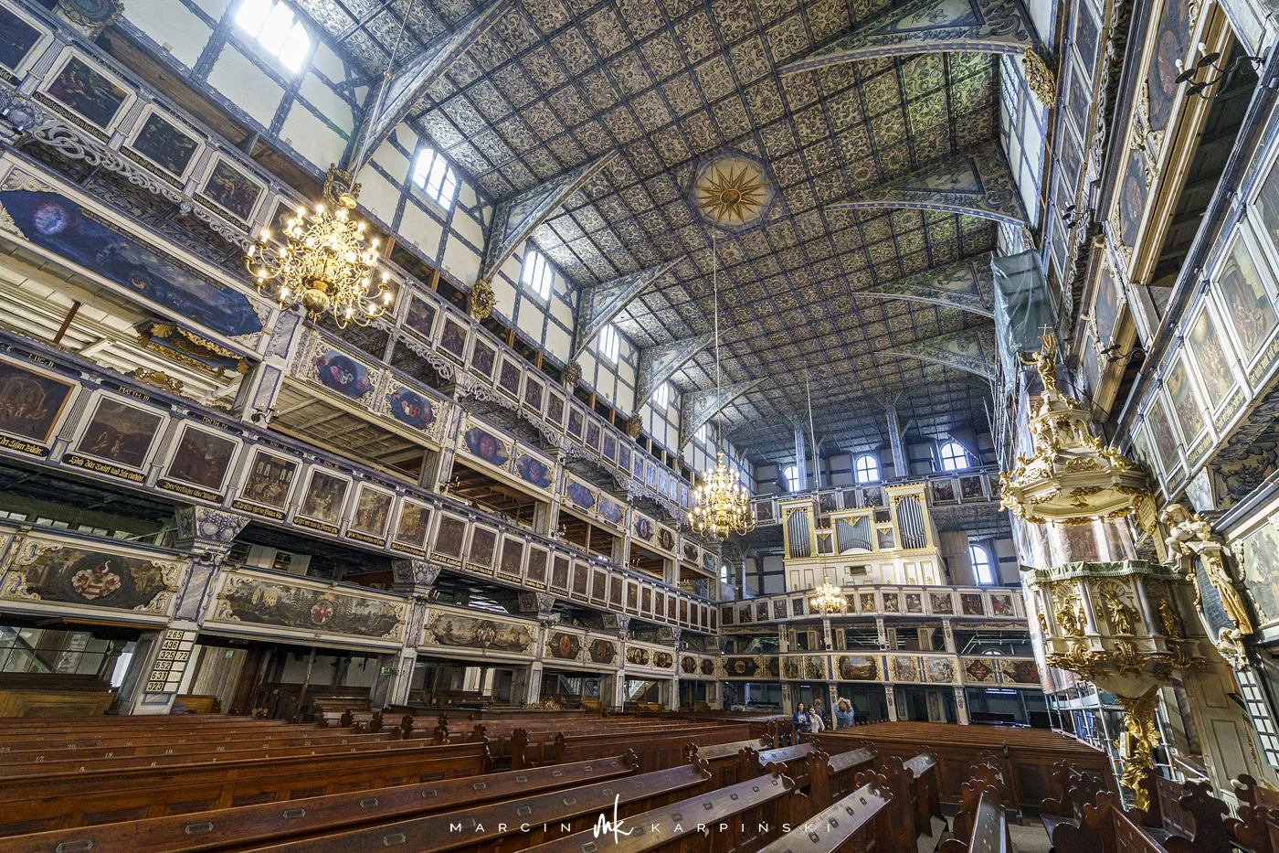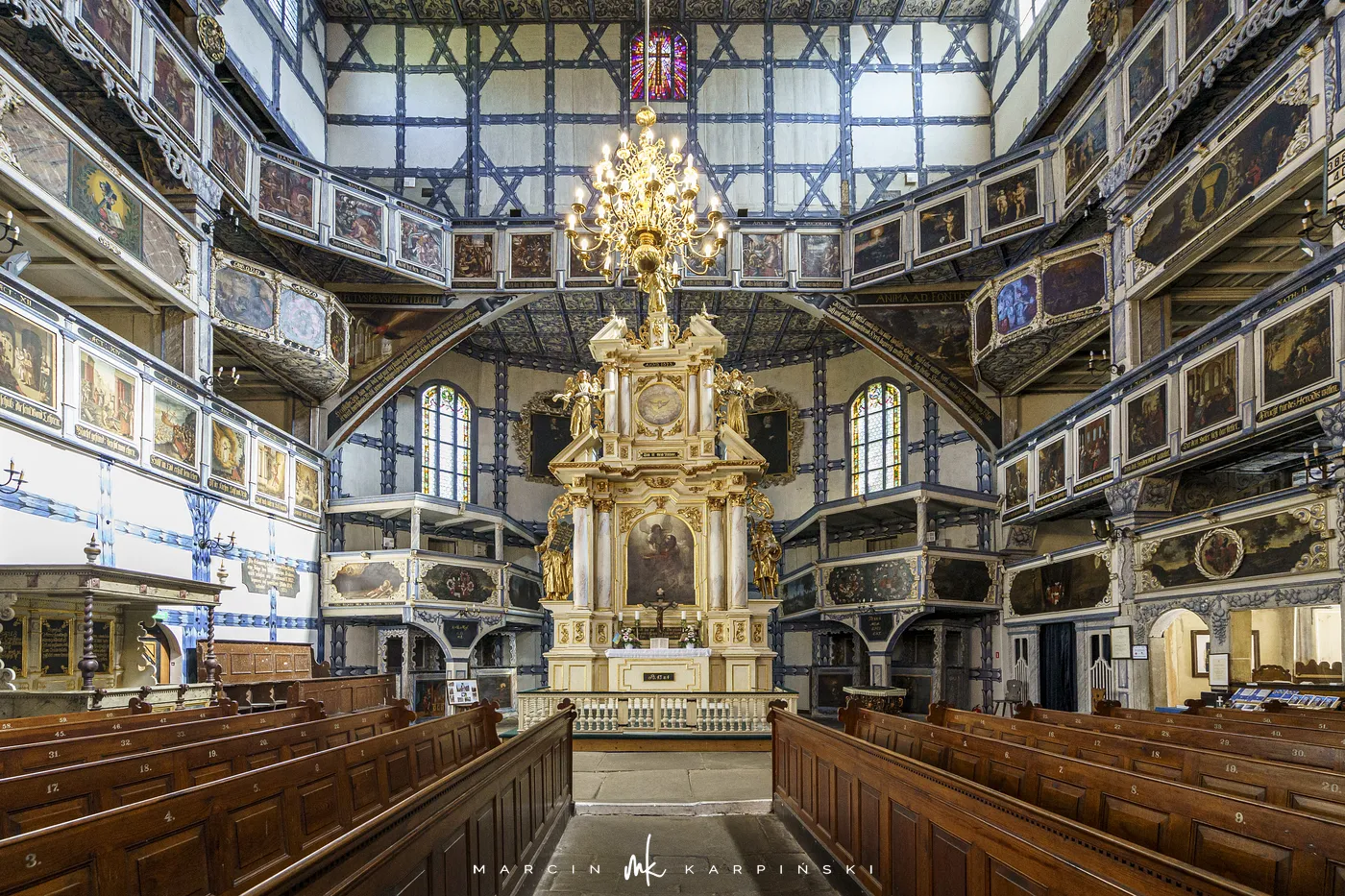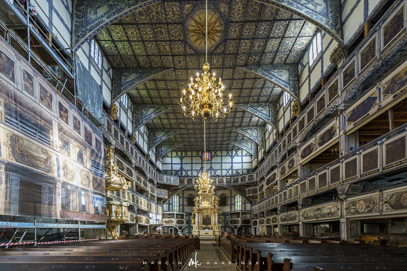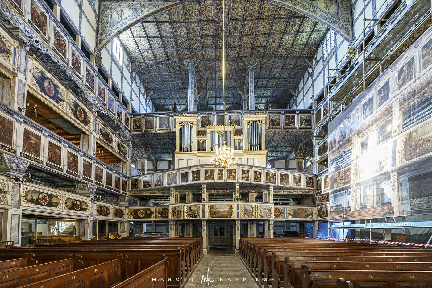 Budowa kościoła rozpoczęła się w 1654 roku, a jego wzniesienie trwało zaledwie jeden rok. Ze względu na ograniczenia narzucone przez cesarza Habsburgów, świątynia mogła być zbudowana jedynie z nietrwałych materiałów, takich jak drewno, glina i słoma, oraz znajdować się poza murami miasta. Pomimo tych restrykcji, kościół zachwyca swoją monumentalnością i bogatym barokowym wystrojem wnętrza. Budowla ma konstrukcję szachulcową i może pomieścić około 6 tysięcy wiernych. Wnętrze wyróżnia się bogatymi zdobieniami, w tym drewnianą amboną, ozdobnym ołtarzem oraz licznymi malowidłami i emporami z herbami fundatorów.