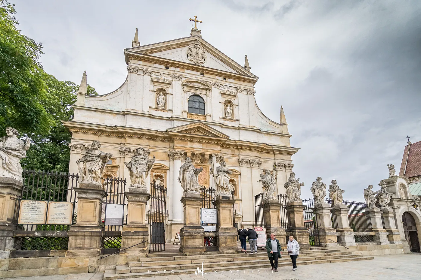 Kościół Świętych Piotra i Pawła to jedna z najokazalszych świątyń Krakowa, będąca ważnym przykładem włoskiego baroku w Polsce. Powstał w latach 1597–1619 jako kościół jezuitów, którzy sprowadzili do Krakowa nowy styl architektoniczny. Jego monumentalna fasada z kolumnami i posągami apostołów przyciąga uwagę odwiedzających. Choć wystrój wnętrza jest stosunkowo skromny, świątynia wyróżnia się doskonałą akustyką. W podziemiach znajdują się groby zasłużonych Polaków m.in.: Sławomira Mrożka, Adama Zagajewskiego oraz Krzysztofa Pendereckiego.