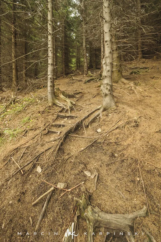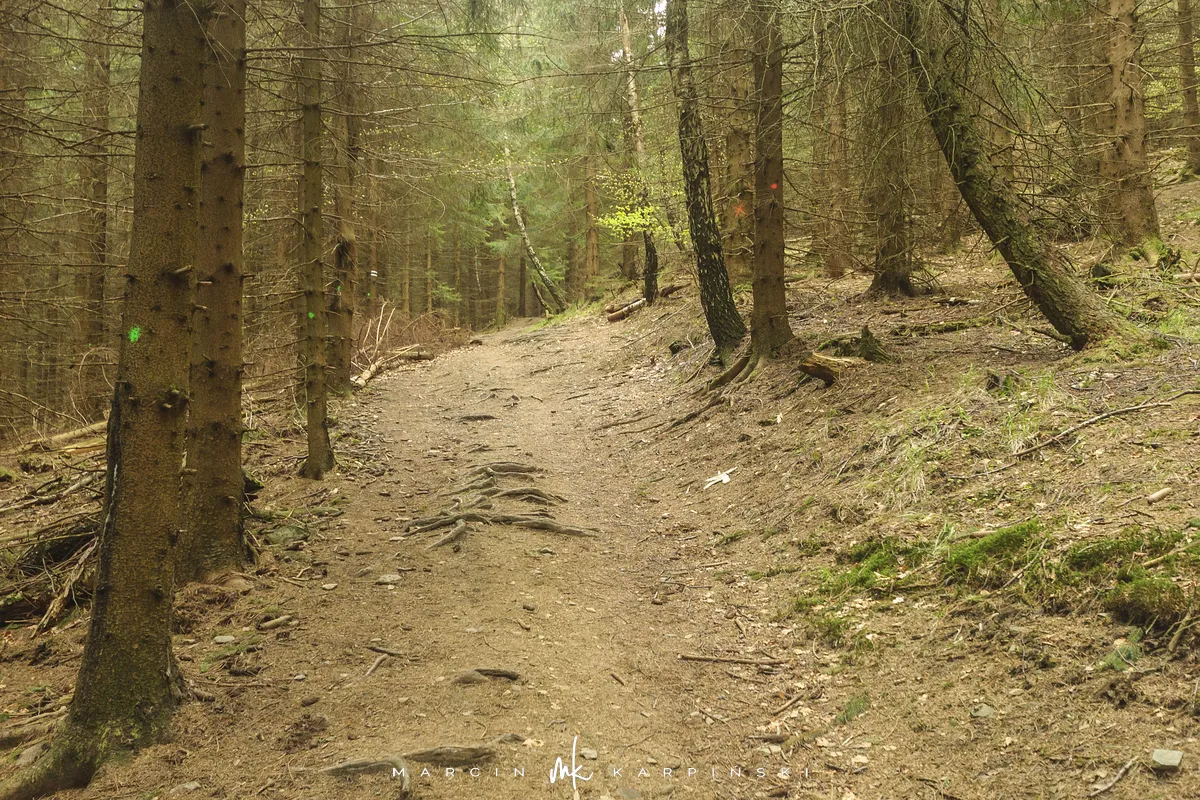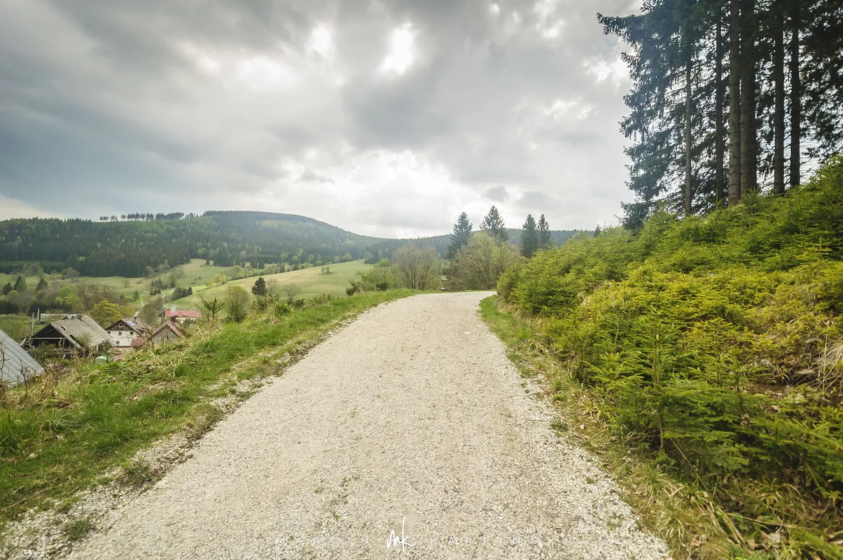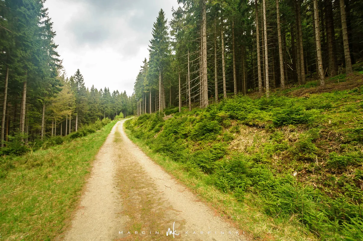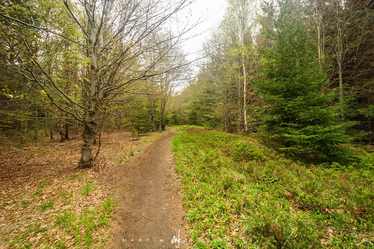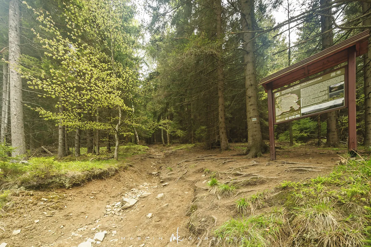 Wejście na Kowadło rozpoczynamy z malowniczo położonej wsi Bielice. Samochód zostawiamy na poboczu przy leśniczówce. Miejsc do pozostawienia samochodu nie jest tu za dużo. Choć gdyby był kłopot należy się cofnąć i trochę wcześniej zostawić pojazd. Wychodzimy przed godzina dziesiątą. Początkowo idziemy utwardzoną drogą, która od razu pnie się do góry. Po lewej stronie zostawiamy w dole zabudowania Bielic, które po chwili znikają za zakrętem. Wchodzimy w las, droga nadal nie wymaga wiele wysiłku. Po niecałych dwudziestu minutach szlak zielony, którym idziemy skręca w prawo w leśną ścieżkę. Tu podejście robi się już trudniejsze, trzeba uważać na wystające korzenie i leżące kamienie. Po dojściu do granicy z Czechami skręcamy w lewo i robi się już płasko. Jesteśmy na wysokości 900 metrów n.p.m. Nadal idziemy zielonym szlakiem i nim wejdziemy na sam szczyt. Można również iść cały czas wzdłuż granicy i wejść na Kowadło szlakiem żółtym. Ten odcinek szlaku wybierzemy schodząc ze szczytu. Ostatnie minuty podejścia również wymagają więcej wysiłku.