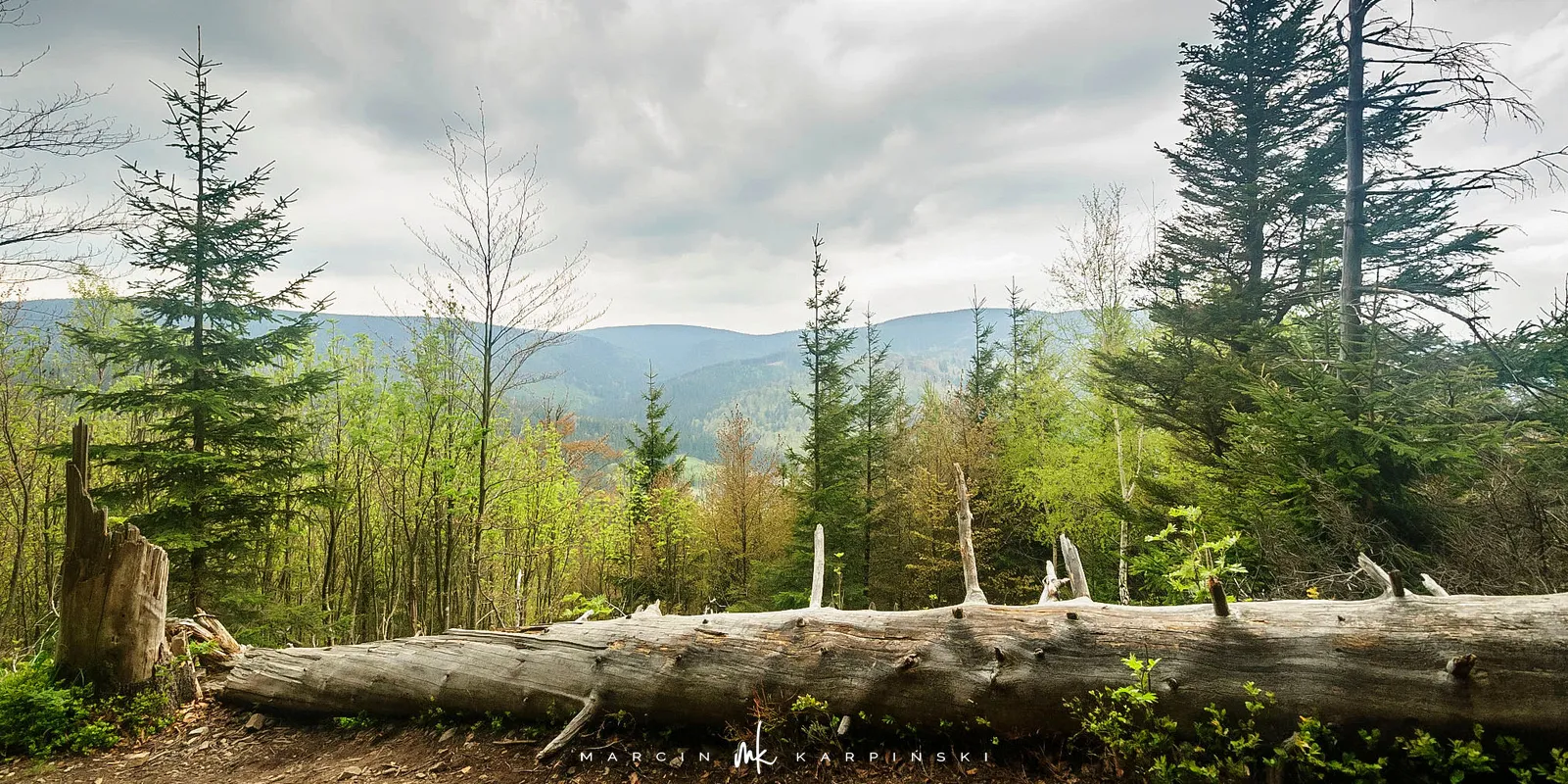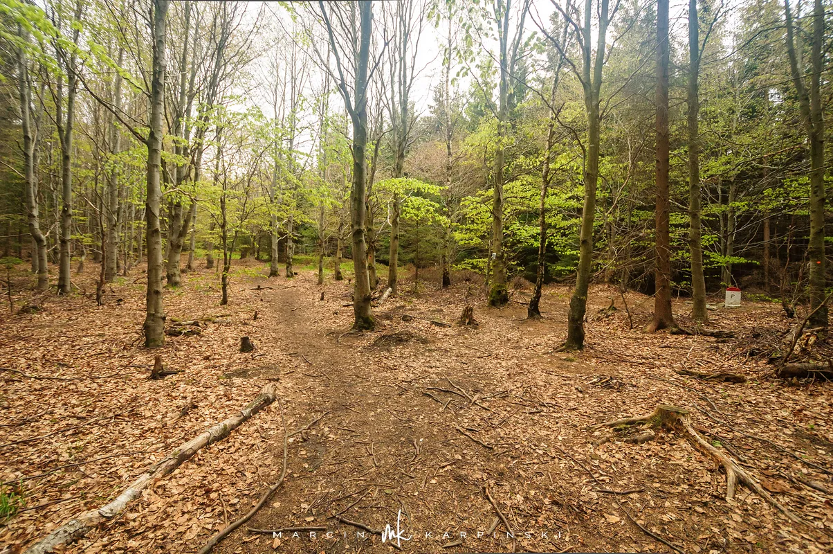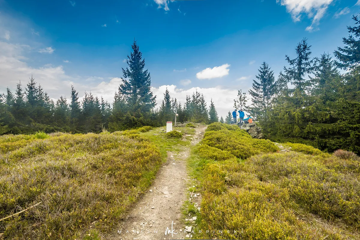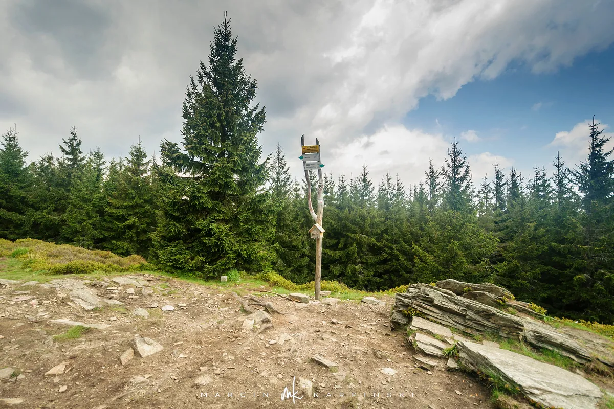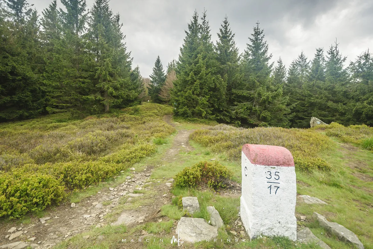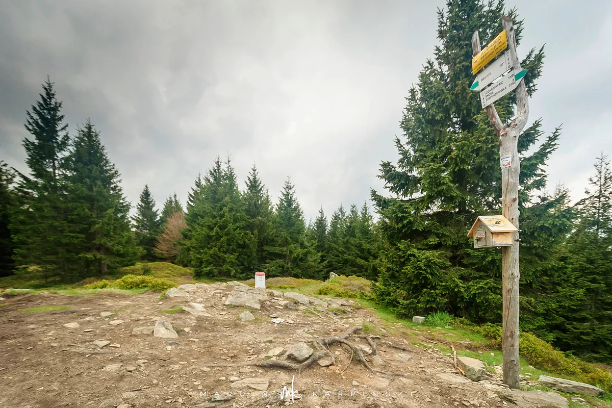 Po niecałych 45 minutach od wyjścia z Bielic jesteśmy na szczycie Kowadła. To niewielka polanka, dookoła drzewa więc widoków brak. Na górze znajdujemy skrzynkę z pieczątką Korony Gór Polski. Odpoczywamy kilka minut i ruszamy w dalszą drogę. Plan jest ambitny. Chcemy dojść do kolejnego szczytu Korony Gór Polski - Rudawca, idąc cały czas wzdłuż granicy. Dalszą cześć wyprawy można przeczytać w opisie wejścia na Rudawiec.