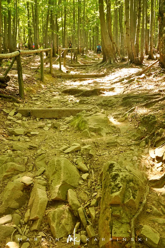 Po minięciu bacówki wchodzimy w las. Rozpoczyna się dość ciężkie podejście. Droga jest kamienista, wystają z niej liczne korzenie. Miejscami wejście ułatwiają drewniane poręcze oraz schody. Na Małej Rawce (1267 m n.p.m.) jesteśmy po godzinie od wyjścia spod bacówki. Na szczycie możemy odpocząć na jednej z drewnianych ławek, jednocześnie delektując się pięknymi widokami.