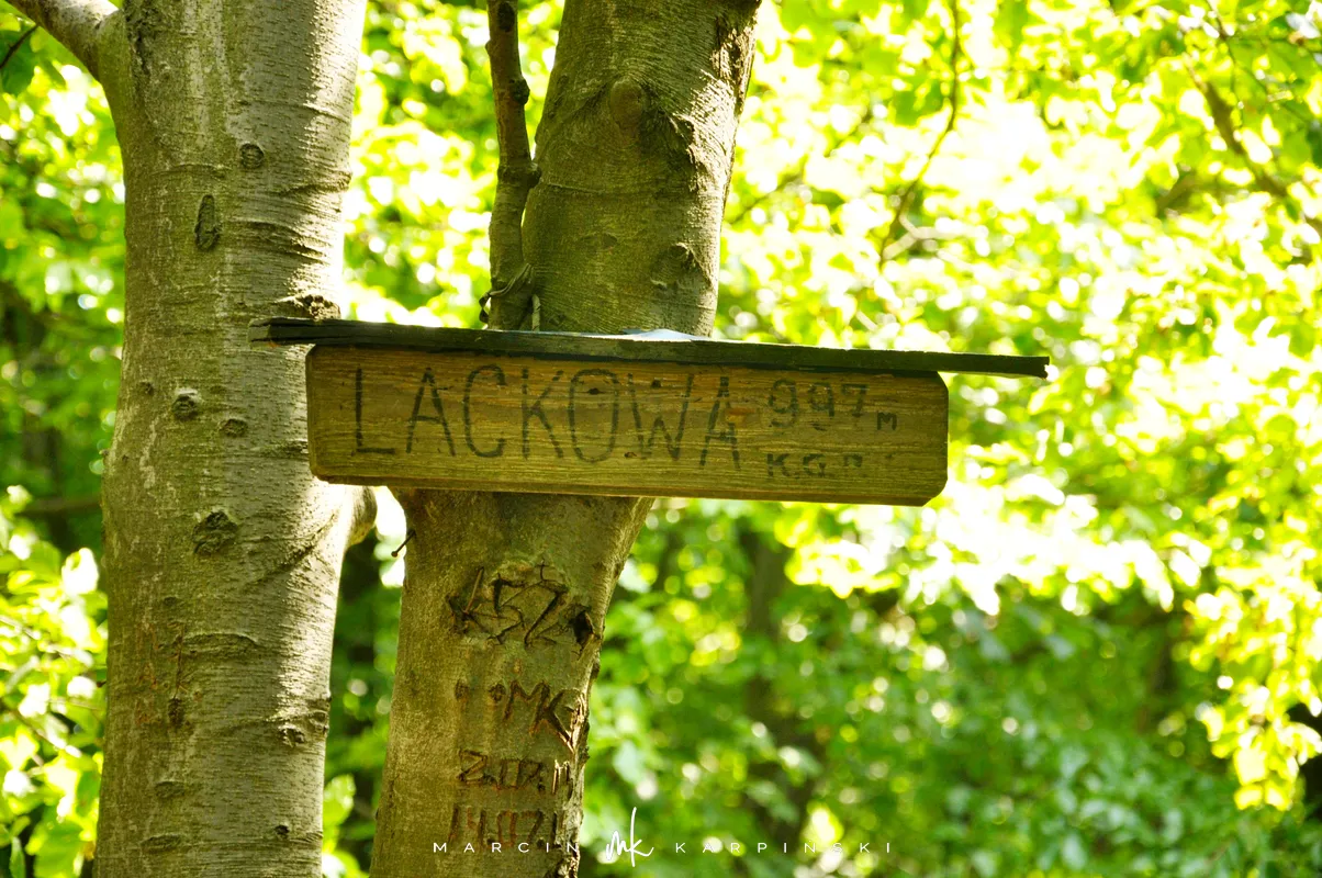 Drogę na Lackową rozpoczynamy we wsi Izby. Samochód pozostawiamy w pobliżu sklepu, przy mostku nad Białą. Asfaltową drogą dochodzimy do stadniny koni, przy której idąc prosto wchodzimy na gruntowa drogę. Łagodnym podejściem wśród pól wędrujemy kilkanaście minut. Gdy już wejdziemy w las dochodzimy do niewielkiej polanki, gdzie musimy skręcić w lewo, w niepozorną leśną ścieżkę. Od tego momentu na sam szczyt Lackowej będziemy szli wzdłuż granicy ze Słowacją. Pierwsze 20 minut wędrówki nie zwiastuje trudnego podejścia. Jednak im dalej tym bardziej stromo. Są momenty kiedy trzeba się chwytać tego co jest pod ręką, aby wejść wyżej. Po ponad trzydziestu minutach mozolnego podejścia, z kilkoma przystankami na odpoczynek, szlak robi się bardziej przyjazny i wkrótce naszym oczom ukazuje się szczyt Lackowej. Po wejściu na Lackową możemy czuć się trochę zawiedzeni, gdyż trud podejścia nie jest nam wynagrodzony widokami. Na szczycie oprócz tabliczek informujących gdzie jesteśmy i dokąd możemy pójść znaleźliśmy również czerwoną skrzyneczkę, a w niej pieczątkę z nazwą góry.