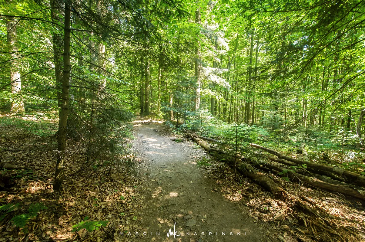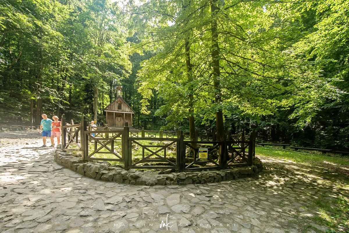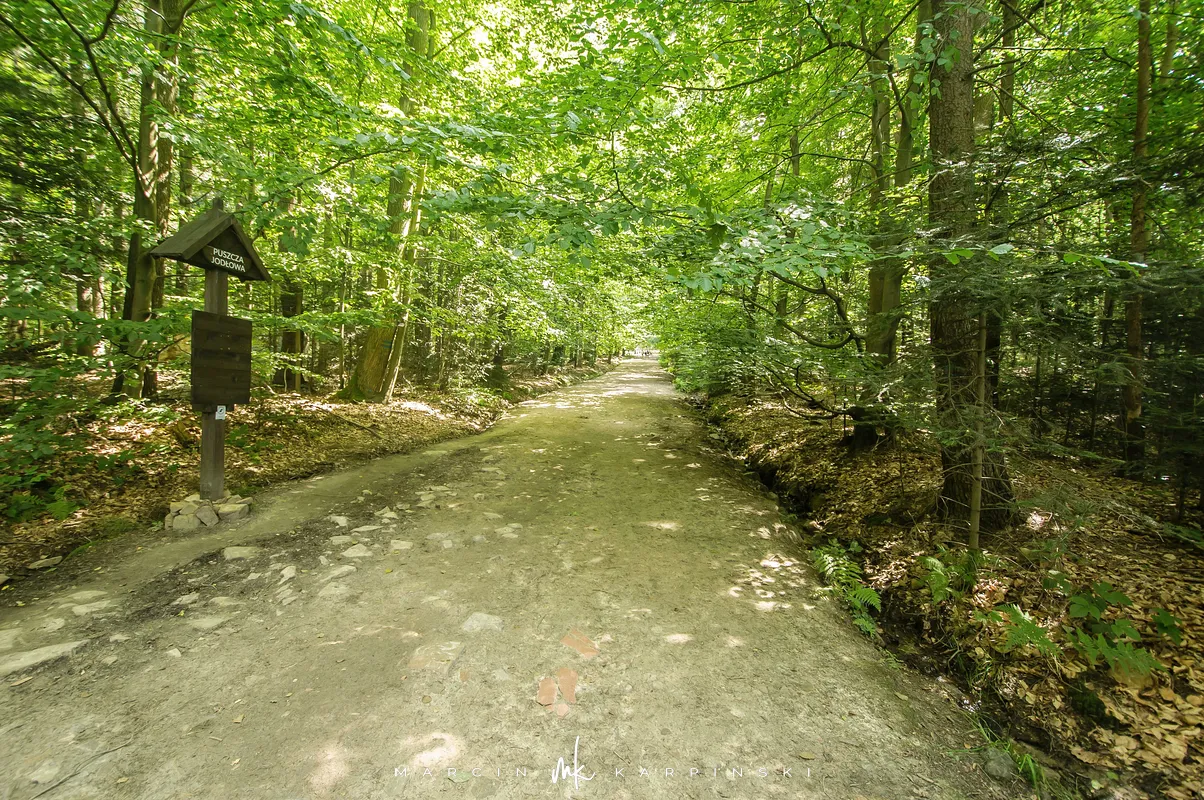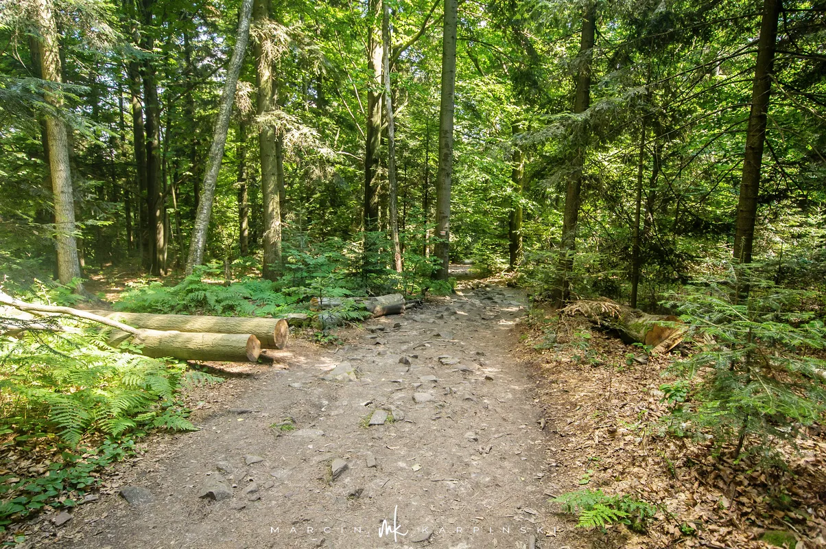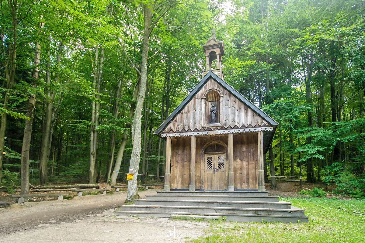 Wejście rozpoczynamy w Świętej Katarzynie. Po znalezieniu oznaczenia czerwonego szlaku prowadzącego na szczyt odbijamy na chwilę w prawo, by zobaczyć położoną na skraju lasu kapliczkę. Na jednej ze ścian w 1882 roku podpisał się Stefan Żeromski. Napis zachował się po dziś dzień. Wracamy na szlak. Mijamy po lewej stronie kościół i wchodzimy przez bramę na teren Świętokrzyskiego Parku Narodowego. Biletów wstępu nie musimy kupować, gdyż wcześniej kupiliśmy wchodząc na Łysą Górę. Tabliczka informuje nas, że na Łysicę dojdziemy w godzinę.