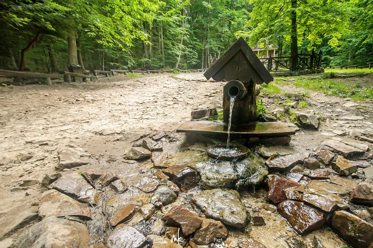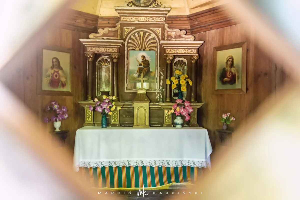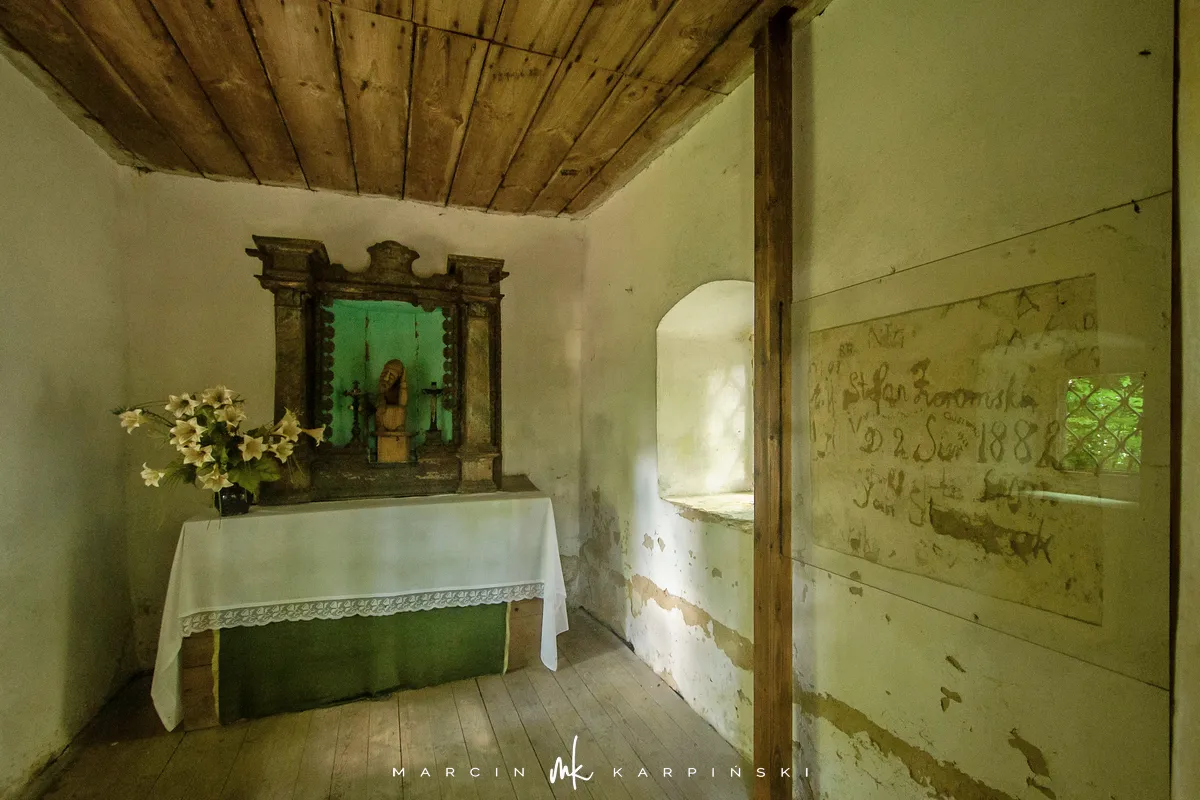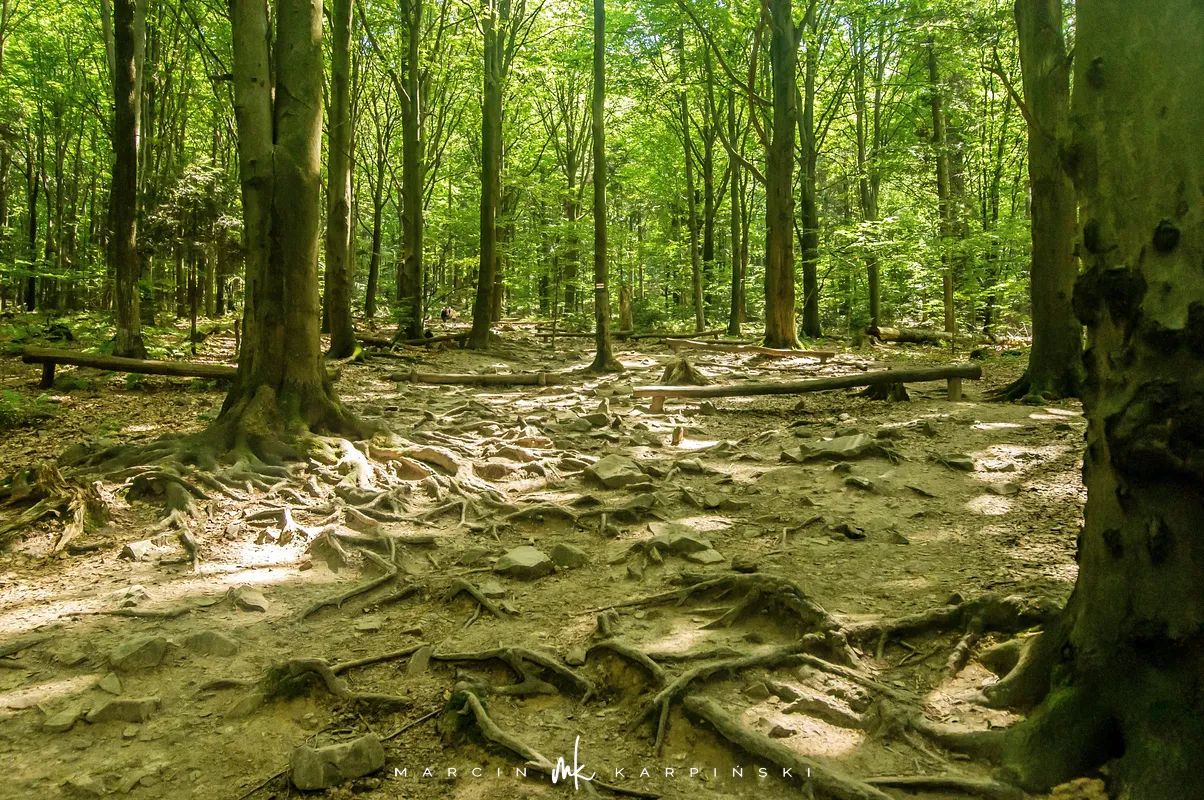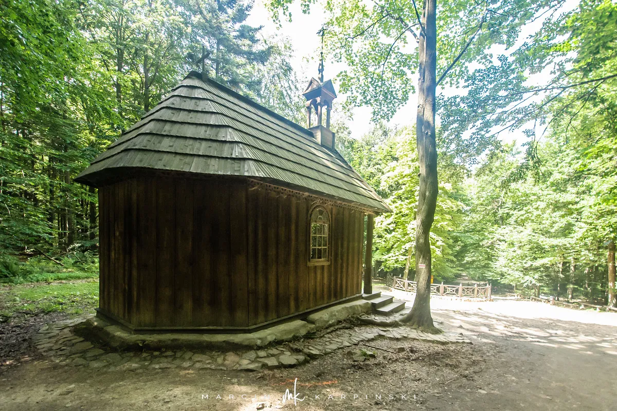 Wejście rozpoczynamy w Świętej Katarzynie. Po znalezieniu oznaczenia czerwonego szlaku prowadzącego na szczyt odbijamy na chwilę w prawo, by zobaczyć położoną na skraju lasu kapliczkę. Na jednej ze ścian w 1882 roku podpisał się Stefan Żeromski. Napis zachował się po dziś dzień. Wracamy na szlak. Mijamy po lewej stronie kościół i wchodzimy przez bramę na teren Świętokrzyskiego Parku Narodowego. Biletów wstępu nie musimy kupować, gdyż wcześniej kupiliśmy wchodząc na Łysą Górę. Tabliczka informuje nas, że na Łysicę dojdziemy w godzinę.