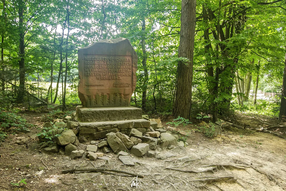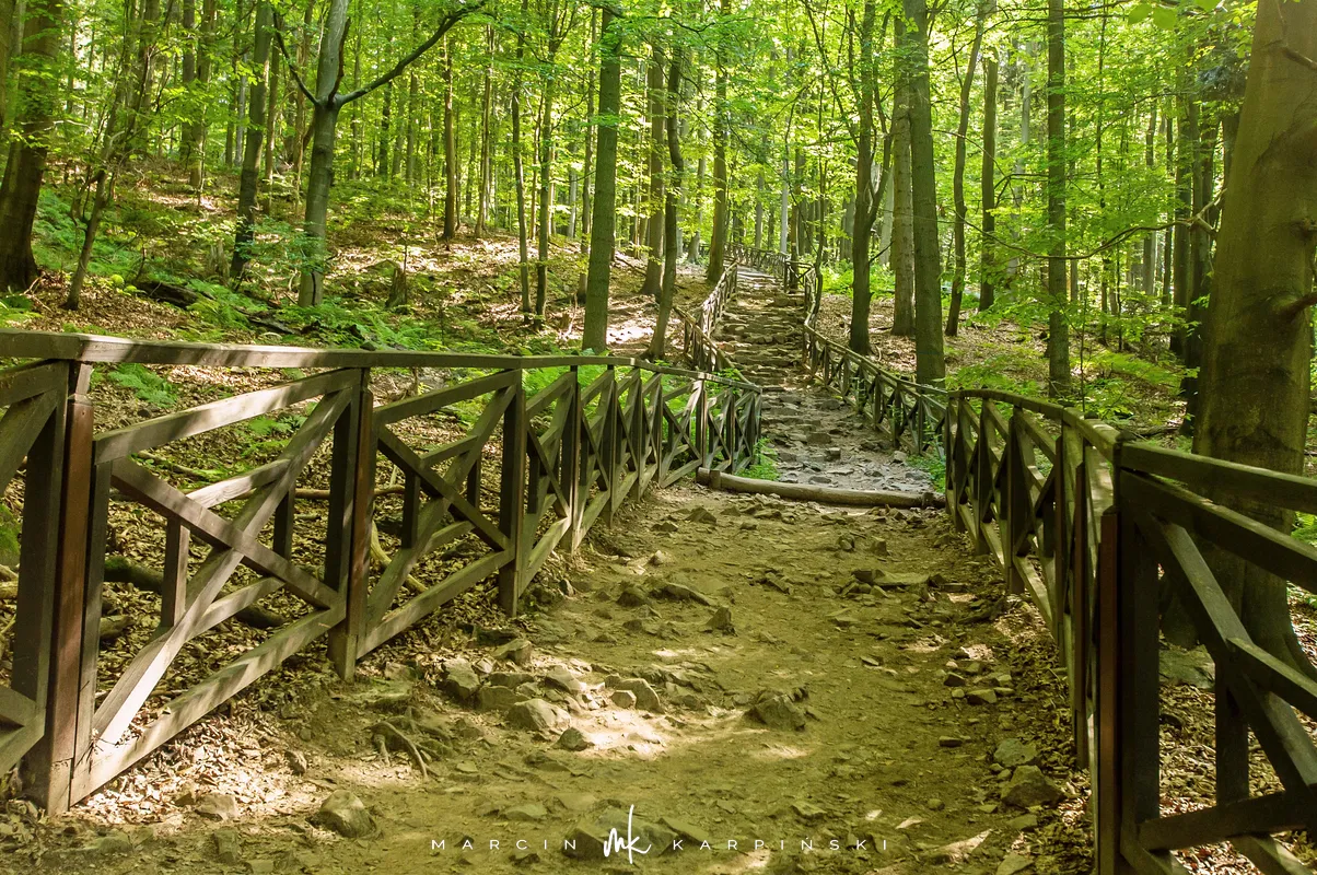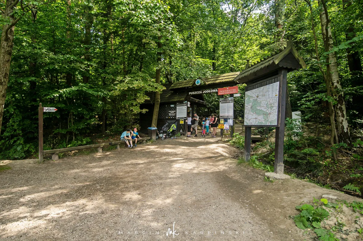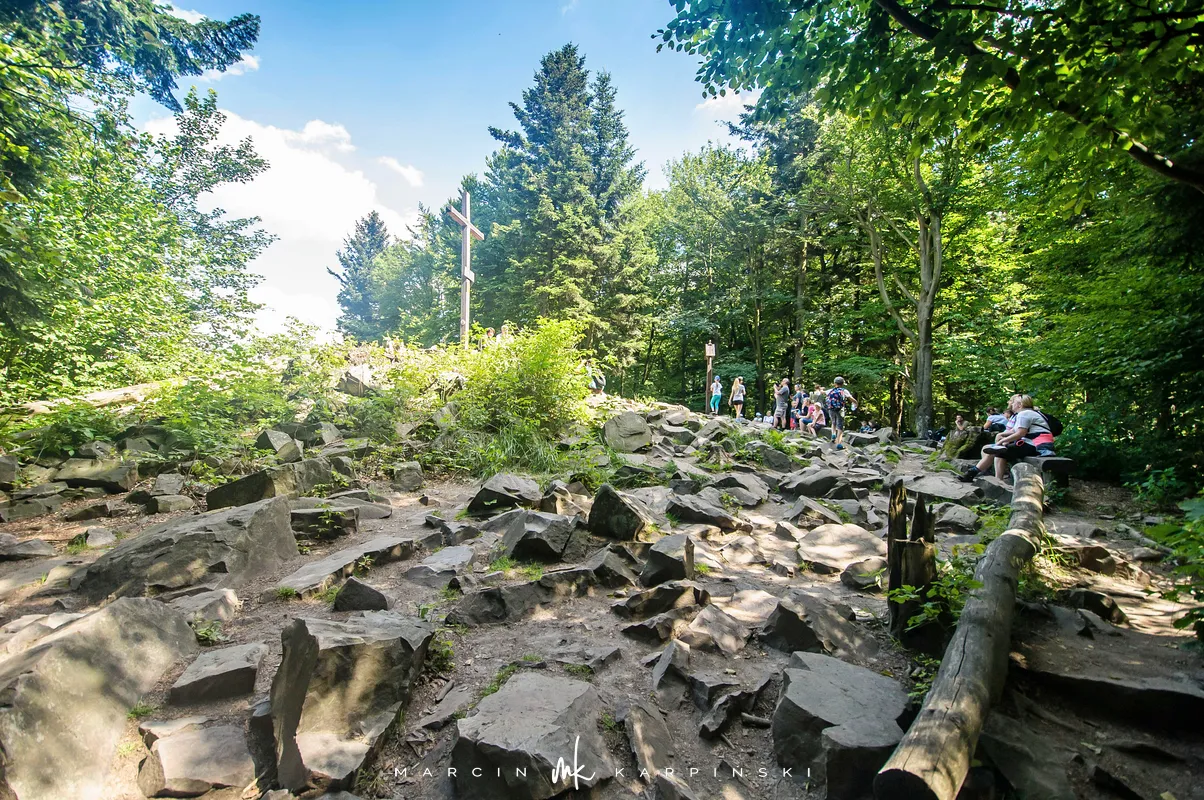 Zaraz po wejściu do Puszczy Jodłowej warto przystanąć przy obeliskach i mogiłach pomordowanych przez Niemców żołnierzy i okolicznych mieszkańców. Po kilkuset metrach dochodzimy do niewielkiej polanki z kapliczką Świętego Franciszka i znajdującego się obok źródełka. Od tego miejsca szlak zaczyna piąć się w górę. Nie jest może wymagający, jednak męczące może być to, iż do samego szczytu nie ma miejsc, gdy jest płasko. Po drodze jest kilka przygotowanych ławek, gdzie można usiąść i odpocząć.