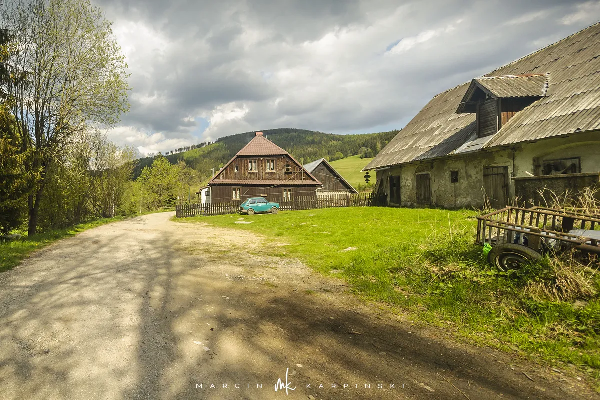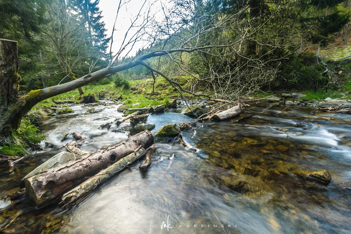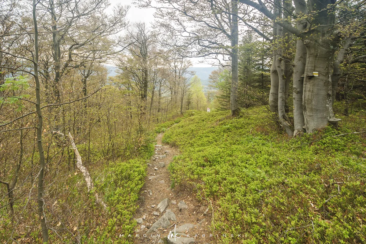 Po przejściu kilkuset metrów naszym oczom ukazuje się kolejny ze szczytów - Brusek. Jest dobrym punktem widokowym, widok zasłaniają tylko nieliczne wysokie drzewa. Idziemy dalej do kolejnego szczytu - najwyższego w polskiej części Gór Złotych - Postawnej. Aby do niego dojść przy słupku III/45 odbijamy w prawo. Nie znajdziemy tu wydeptanej ścieżki. Trzeba wyglądać w oddali tabliczki na drzewie. Nam pomógł GPS i mapa w telefonie. Po piętnastu minutach od ponownego wejścia na szlak jesteśmy w miejscu, gdzie granica zakręca pod kątem prostym. Od tego momentu idziemy na północny-wschód. Do Rudawca mamy niecałą godzinę marszu. Po drodze zaczyna padać deszcz. Mijamy szczyt Iwinka, jednocześnie wchodzimy ponownie na zielony szlak. Zaprowadzi nas na Rudawiec, a w powrotnej drodze do Bielic. Przed Rudawcem przestaje padać deszcz. Do tej pory po drodze od Kowadła spotkaliśmy kilkanaście osób, w większości Czechów. Po wejściu na szlak zielony zrobiło się już tłoczniej. Na szczycie na słupku oprócz tabliczek z oznaczeniem szlaku i szczytu znajdziemy drewnianą skrzynkę z pieczątką. Widoków ze szczytu niestety nie uświadczymy. Zejście do Bielic zajmuje nam godzinę z kwadransem. Po drodze przechodzimy przez Rezerwat przyrody Puszcza Śnieżnej Białki, a w ostatnim odcinku idziemy malowniczą doliną, przez którą przepływa rzeka Biała Lądecka.