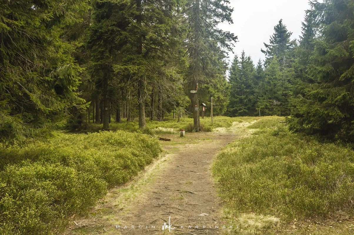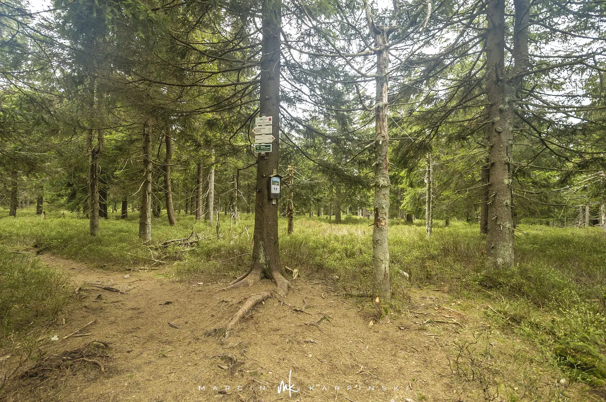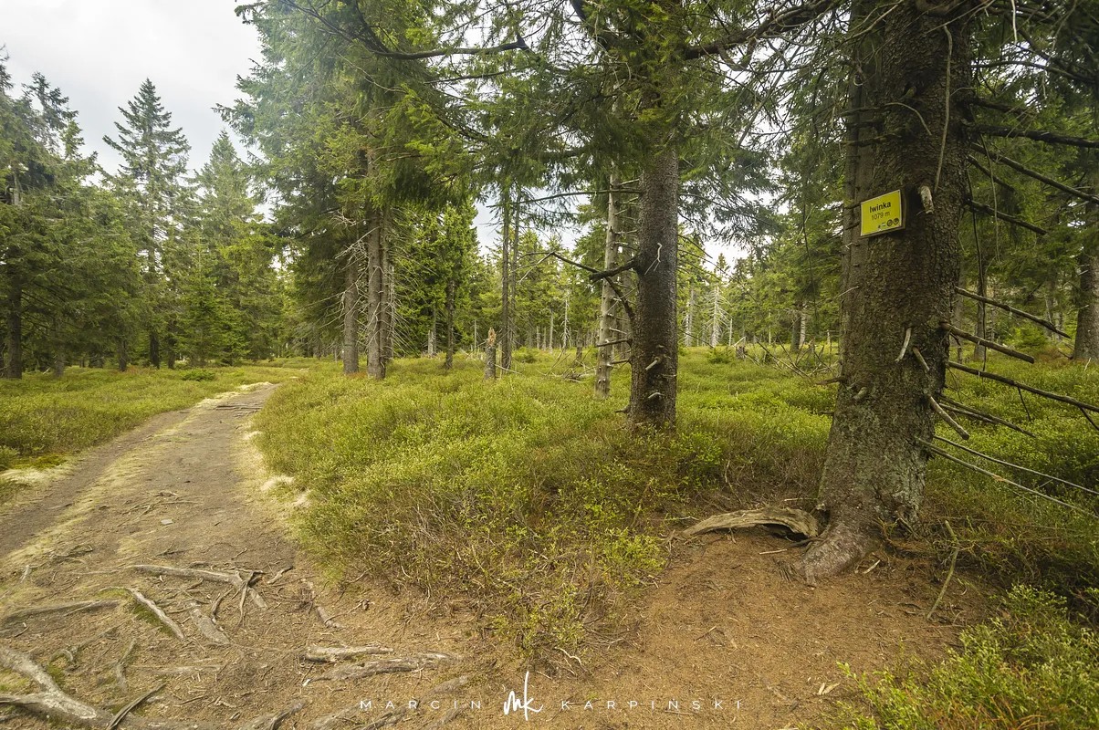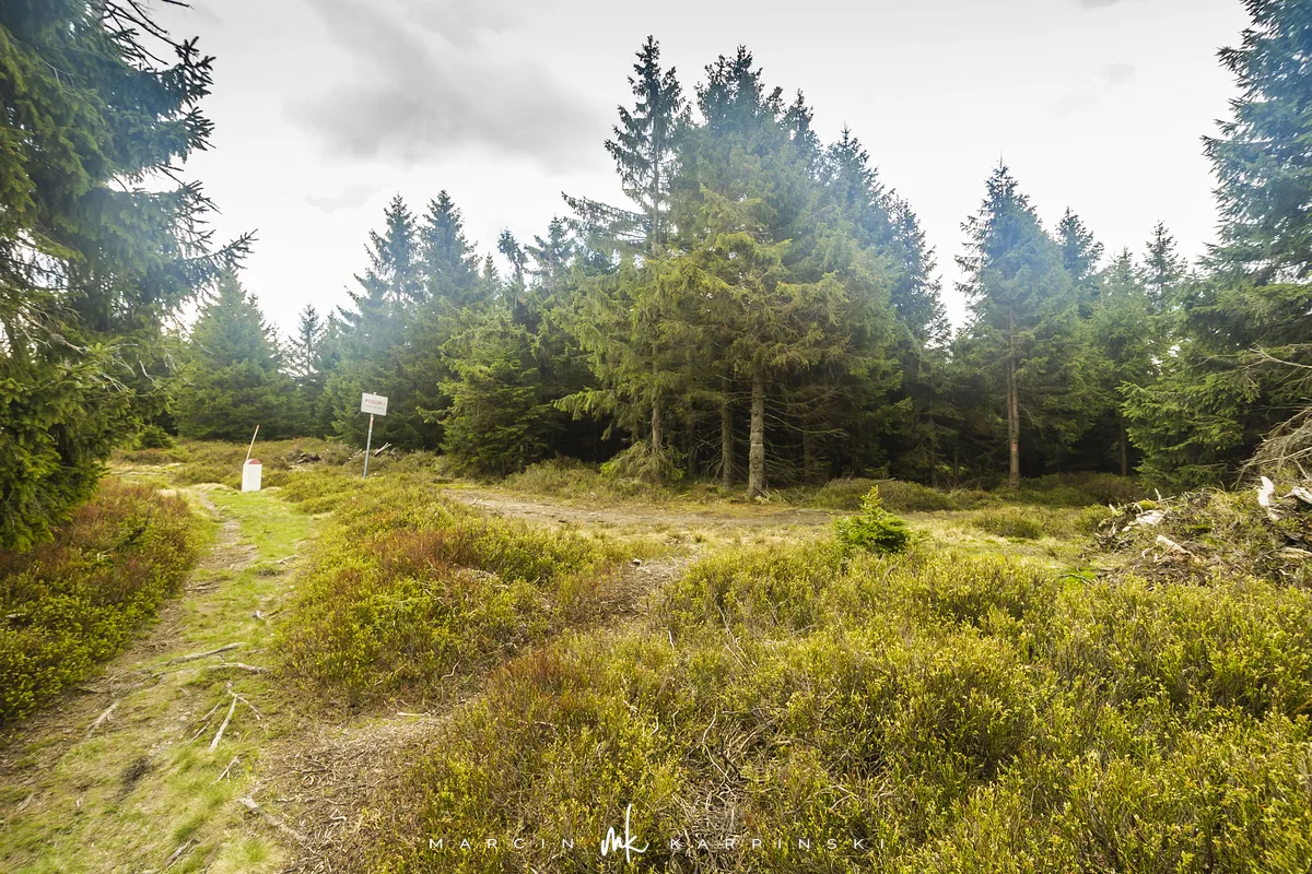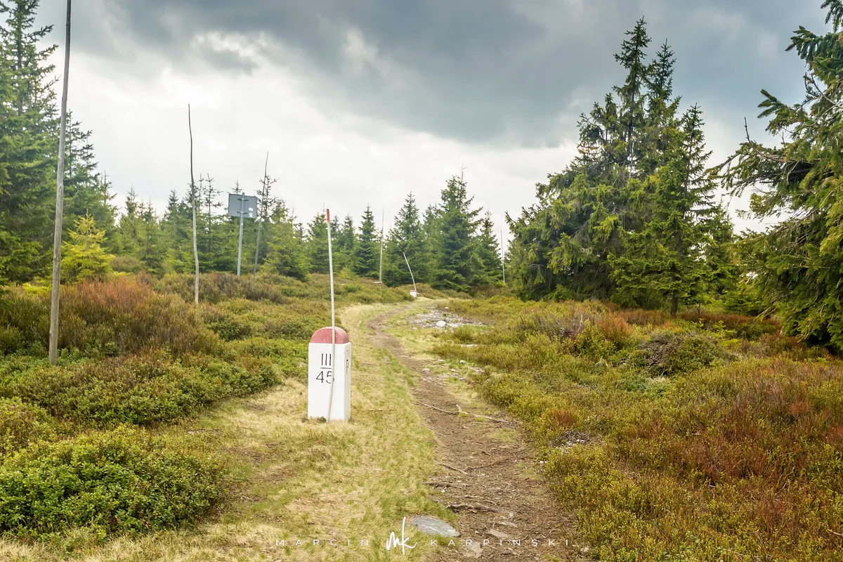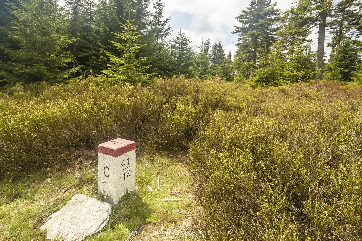 Z Kowadła schodzimy już żółtym, czeskim szlakiem wzdłuż granicy. Zejście jest początkowo dość strome, idziemy po kamienistej ścieżce wśród drzew. Po piętnastu minutach robi się już płasko. Idziemy nadal lasem. Po kolejnym kwadransie wychodzimy na otwarty teren, a to za sprawą wyciętych, a może i wcześniej połamanych przez wiatr drzew. Kolejną godzinę marszu idziemy lasem, nie ma większych podejść, ani zejść. Dochodzimy do słupka granicznego 41/14. Od niego odchodzimy w prawo kilka metrów i jesteśmy na Smreku Trójkrajnym. Tutaj pierwszy od Kowadła odpoczynek. Idąc dalej po dziesięciu minutach dochodzimy do Przełęczy Trzech Granic. W miejscu tym schodziły się granice Moraw, Śląska i ziemi kłodzkiej. Nie zatrzymując się wchodzimy na czerwony szlak, który zaprowadzi nas do najwyższego punktu Gór Złotych, leżącego w Czechach szczytu Smrk. Dojście do niego zajmuje nam niecałe 10 minut, choć w końcowym odcinku droga robi się podmokła i grząska. Wracamy do przełęczy i dalej już bez szlaku idziemy wzdłuż granicy na południowy-zachód.