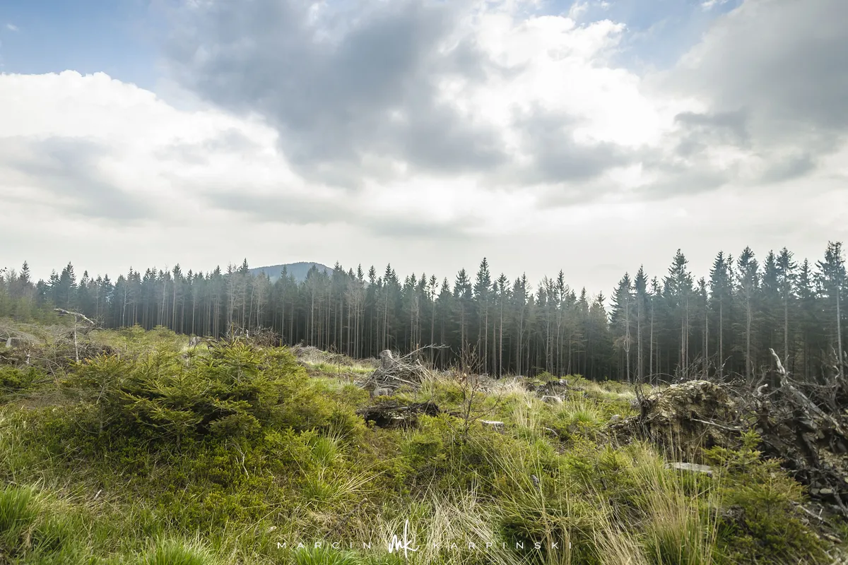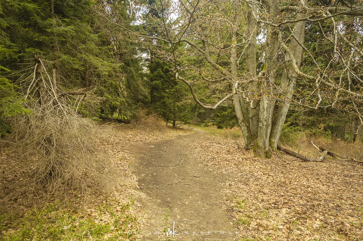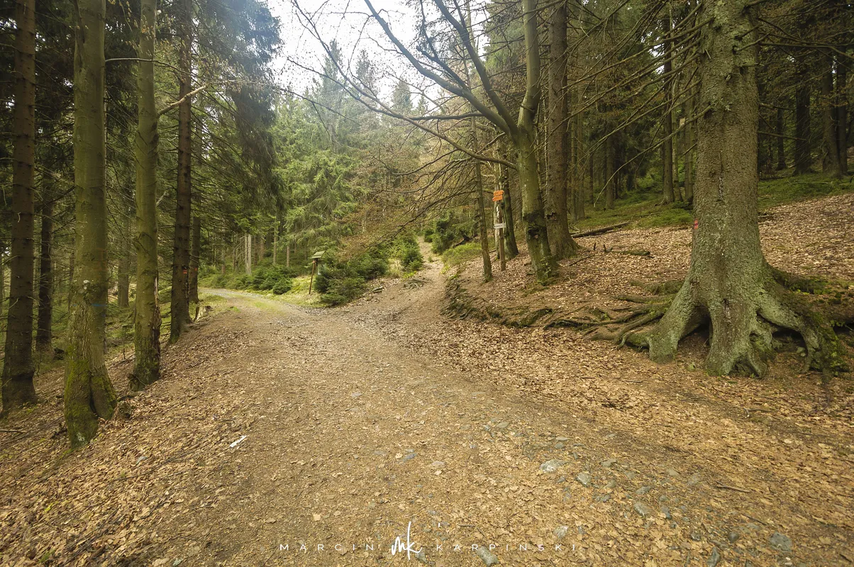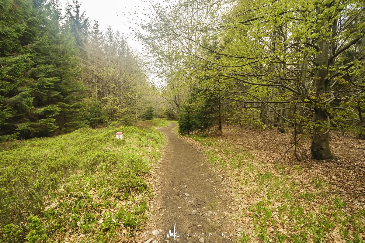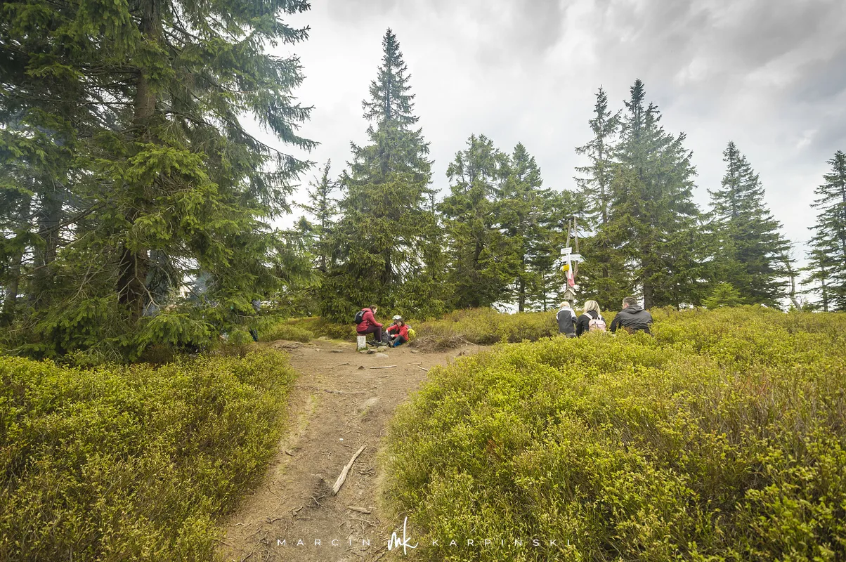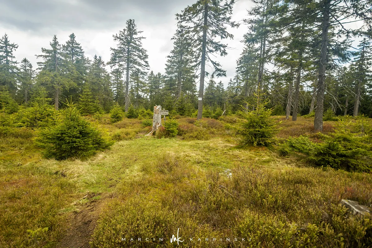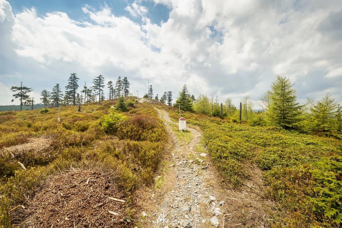 Z Kowadła schodzimy już żółtym, czeskim szlakiem wzdłuż granicy. Zejście jest początkowo dość strome, idziemy po kamienistej ścieżce wśród drzew. Po piętnastu minutach robi się już płasko. Idziemy nadal lasem. Po kolejnym kwadransie wychodzimy na otwarty teren, a to za sprawą wyciętych, a może i wcześniej połamanych przez wiatr drzew. Kolejną godzinę marszu idziemy lasem, nie ma większych podejść, ani zejść. Dochodzimy do słupka granicznego 41/14. Od niego odchodzimy w prawo kilka metrów i jesteśmy na Smreku Trójkrajnym. Tutaj pierwszy od Kowadła odpoczynek. Idąc dalej po dziesięciu minutach dochodzimy do Przełęczy Trzech Granic. W miejscu tym schodziły się granice Moraw, Śląska i ziemi kłodzkiej. Nie zatrzymując się wchodzimy na czerwony szlak, który zaprowadzi nas do najwyższego punktu Gór Złotych, leżącego w Czechach szczytu Smrk. Dojście do niego zajmuje nam niecałe 10 minut, choć w końcowym odcinku droga robi się podmokła i grząska. Wracamy do przełęczy i dalej już bez szlaku idziemy wzdłuż granicy na południowy-zachód.