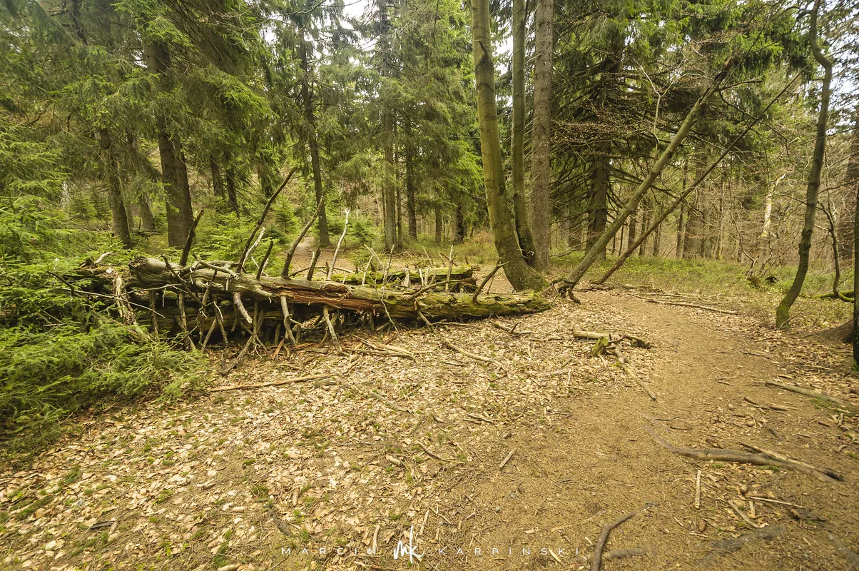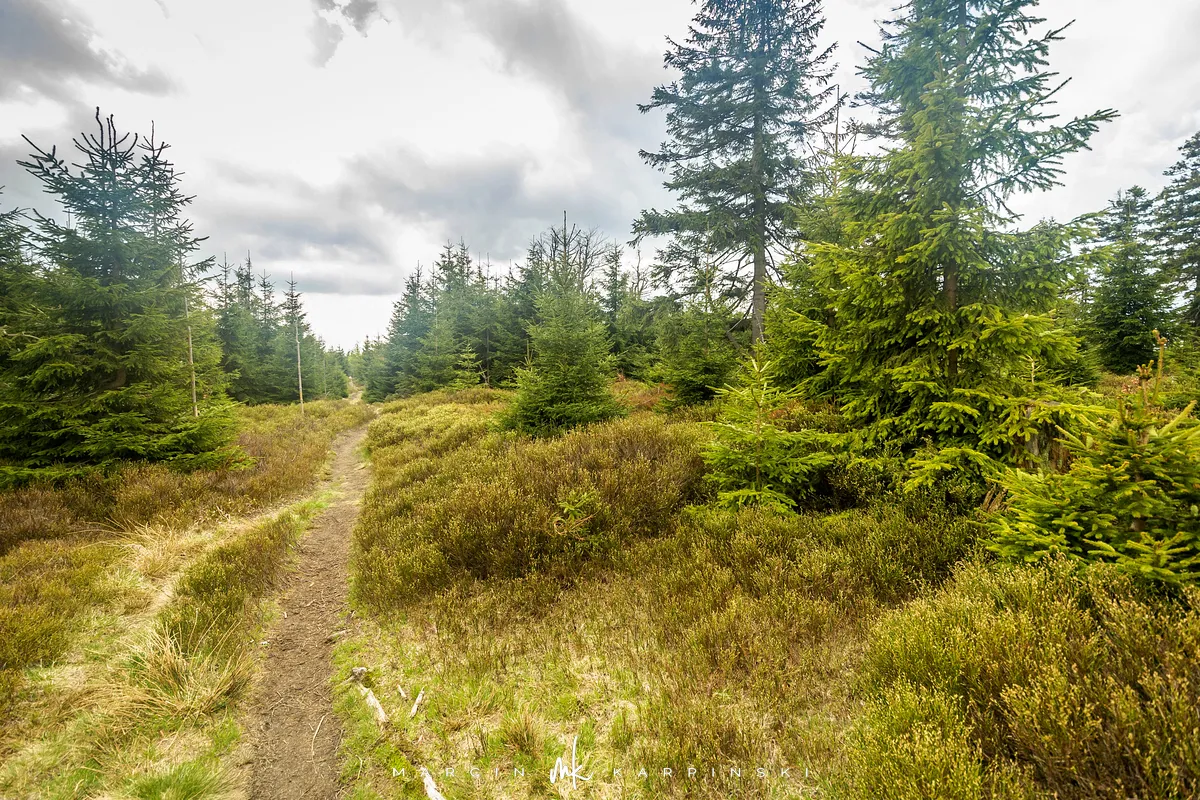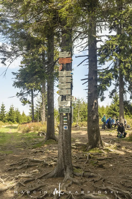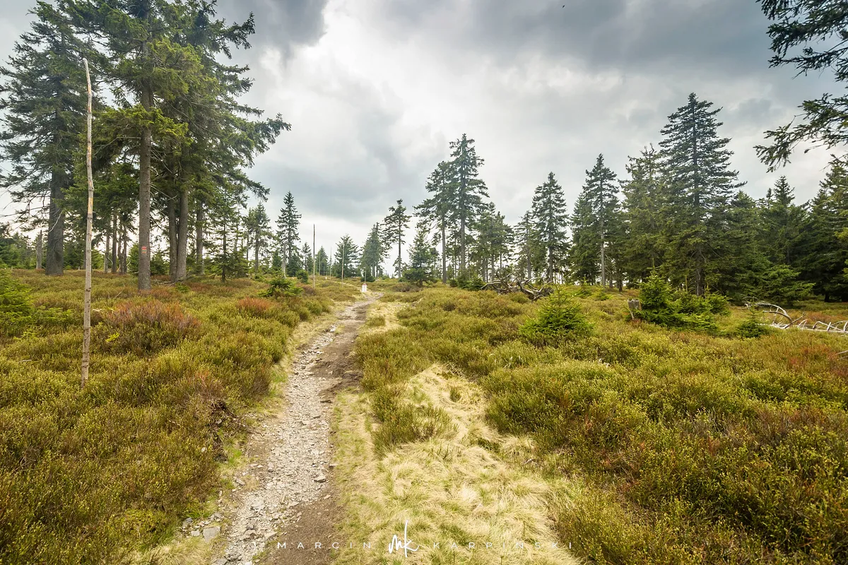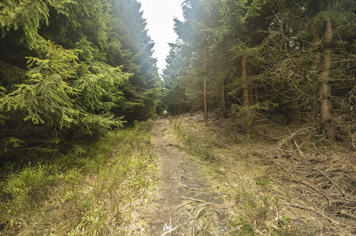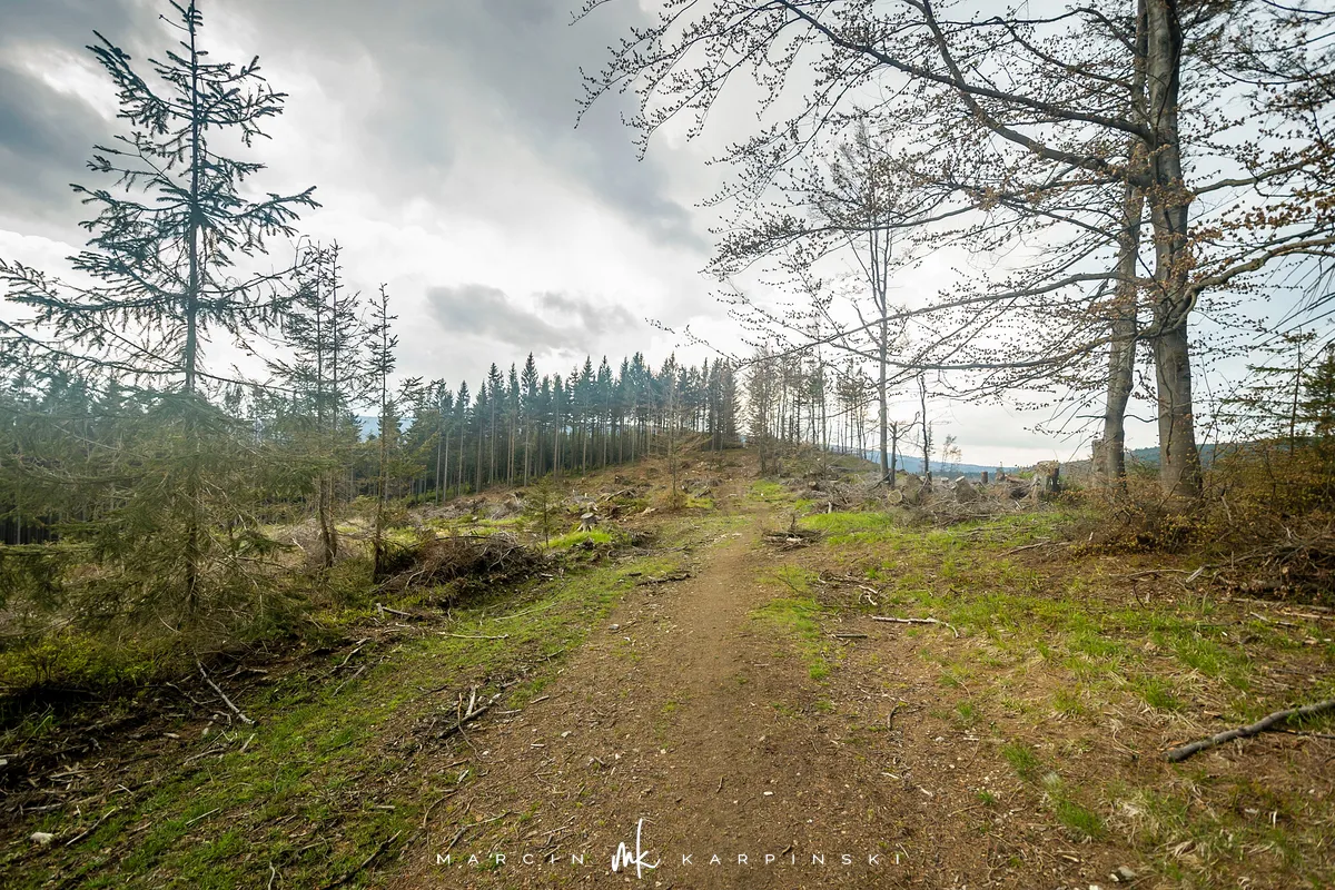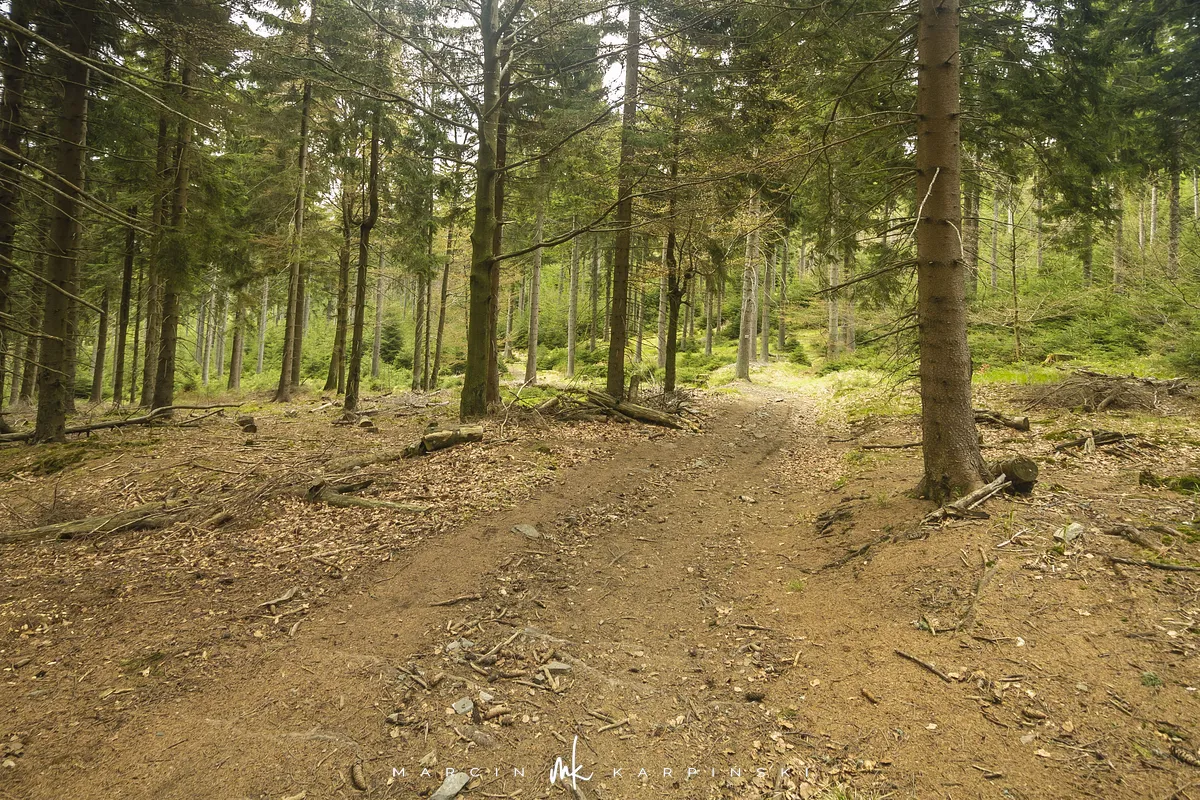 Z Kowadła schodzimy już żółtym, czeskim szlakiem wzdłuż granicy. Zejście jest początkowo dość strome, idziemy po kamienistej ścieżce wśród drzew. Po piętnastu minutach robi się już płasko. Idziemy nadal lasem. Po kolejnym kwadransie wychodzimy na otwarty teren, a to za sprawą wyciętych, a może i wcześniej połamanych przez wiatr drzew. Kolejną godzinę marszu idziemy lasem, nie ma większych podejść, ani zejść. Dochodzimy do słupka granicznego 41/14. Od niego odchodzimy w prawo kilka metrów i jesteśmy na Smreku Trójkrajnym. Tutaj pierwszy od Kowadła odpoczynek. Idąc dalej po dziesięciu minutach dochodzimy do Przełęczy Trzech Granic. W miejscu tym schodziły się granice Moraw, Śląska i ziemi kłodzkiej. Nie zatrzymując się wchodzimy na czerwony szlak, który zaprowadzi nas do najwyższego punktu Gór Złotych, leżącego w Czechach szczytu Smrk. Dojście do niego zajmuje nam niecałe 10 minut, choć w końcowym odcinku droga robi się podmokła i grząska. Wracamy do przełęczy i dalej już bez szlaku idziemy wzdłuż granicy na południowy-zachód.