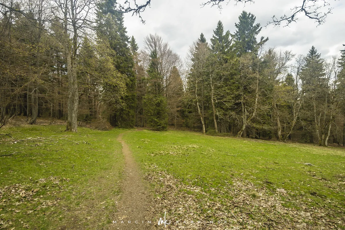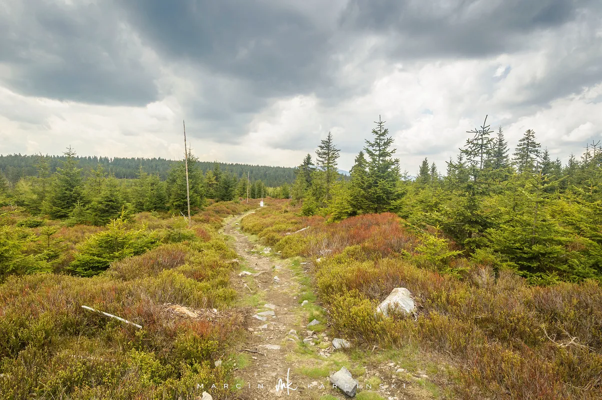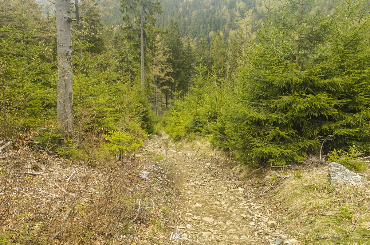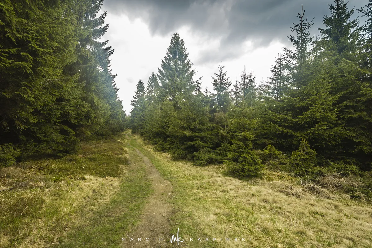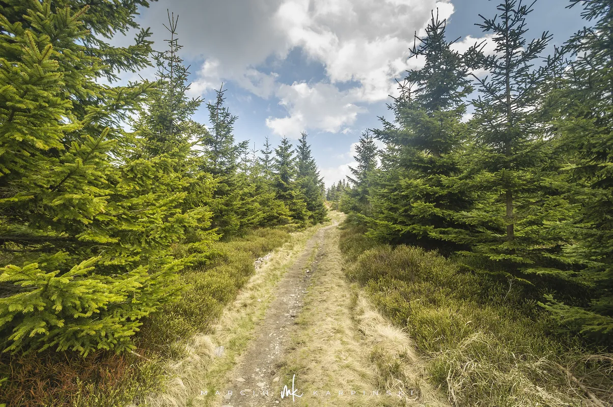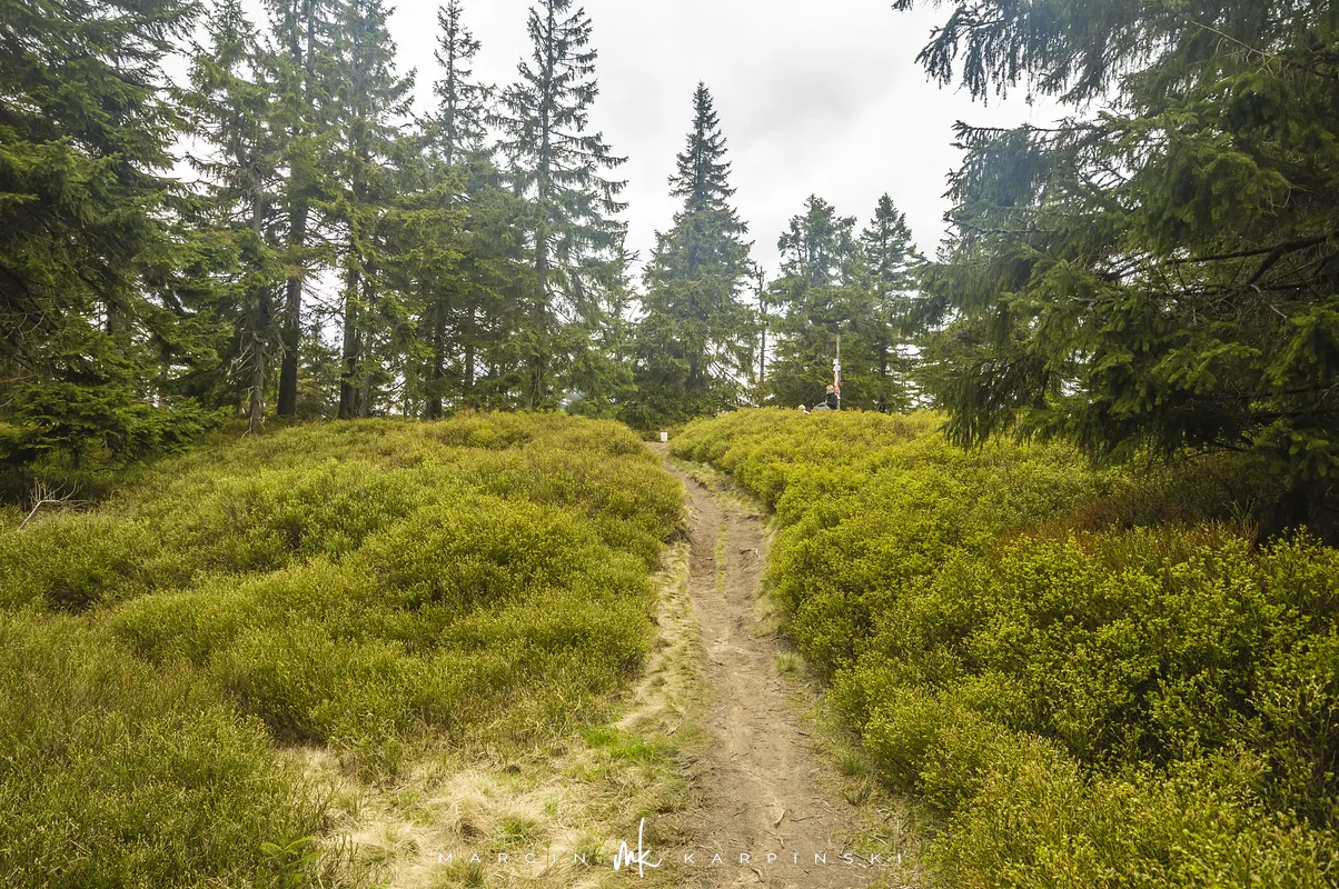 Z Kowadła schodzimy już żółtym, czeskim szlakiem wzdłuż granicy. Zejście jest początkowo dość strome, idziemy po kamienistej ścieżce wśród drzew. Po piętnastu minutach robi się już płasko. Idziemy nadal lasem. Po kolejnym kwadransie wychodzimy na otwarty teren, a to za sprawą wyciętych, a może i wcześniej połamanych przez wiatr drzew. Kolejną godzinę marszu idziemy lasem, nie ma większych podejść, ani zejść. Dochodzimy do słupka granicznego 41/14. Od niego odchodzimy w prawo kilka metrów i jesteśmy na Smreku Trójkrajnym. Tutaj pierwszy od Kowadła odpoczynek. Idąc dalej po dziesięciu minutach dochodzimy do Przełęczy Trzech Granic. W miejscu tym schodziły się granice Moraw, Śląska i ziemi kłodzkiej. Nie zatrzymując się wchodzimy na czerwony szlak, który zaprowadzi nas do najwyższego punktu Gór Złotych, leżącego w Czechach szczytu Smrk. Dojście do niego zajmuje nam niecałe 10 minut, choć w końcowym odcinku droga robi się podmokła i grząska. Wracamy do przełęczy i dalej już bez szlaku idziemy wzdłuż granicy na południowy-zachód.