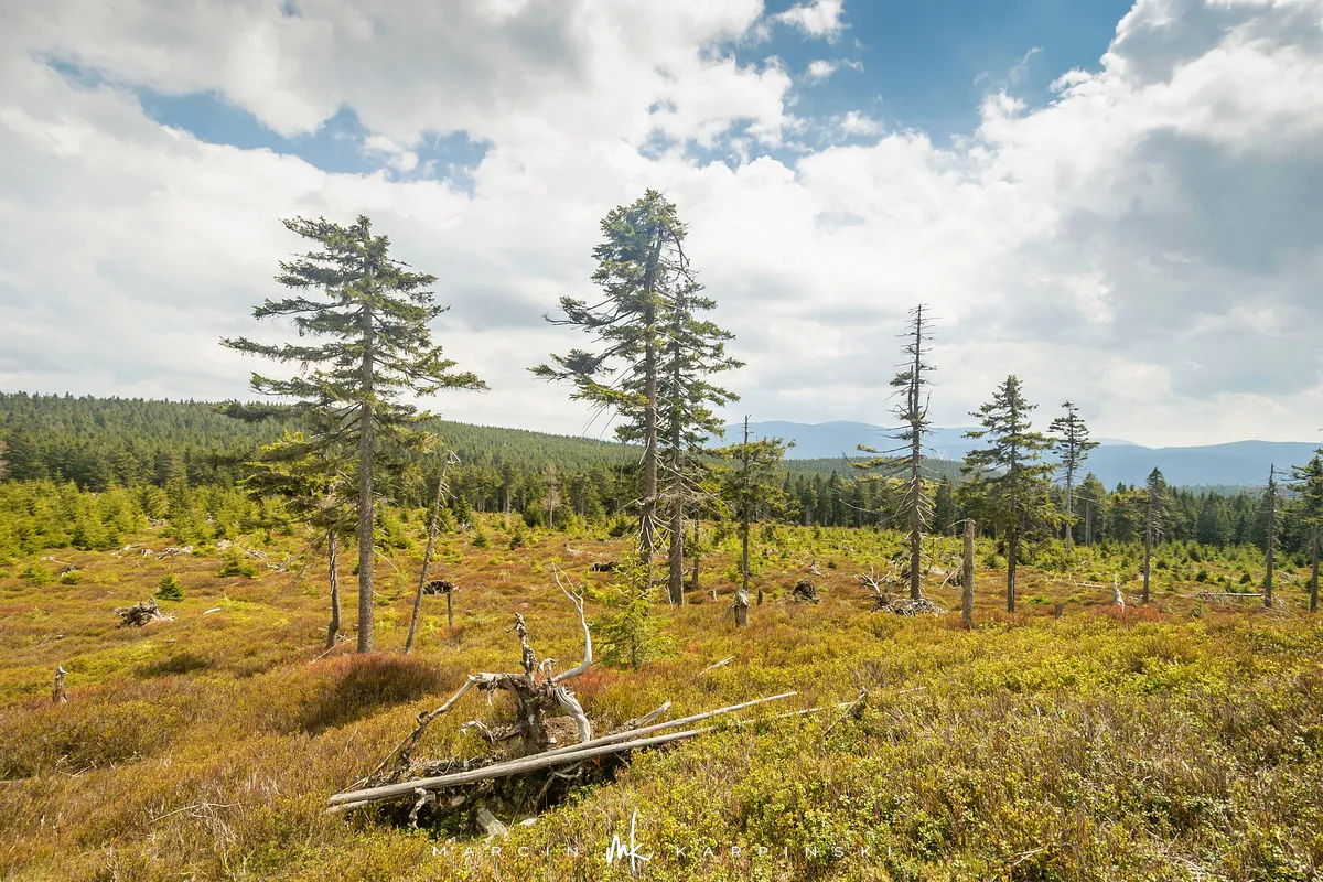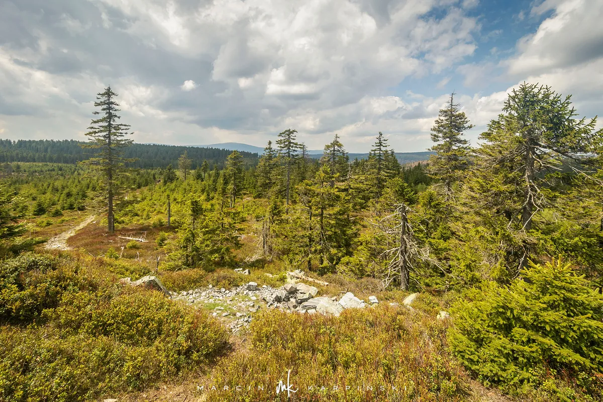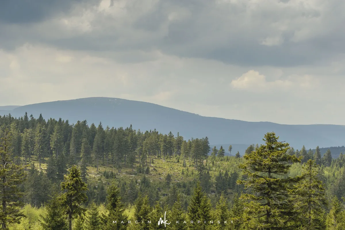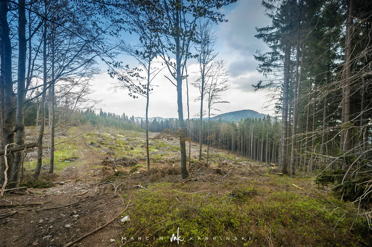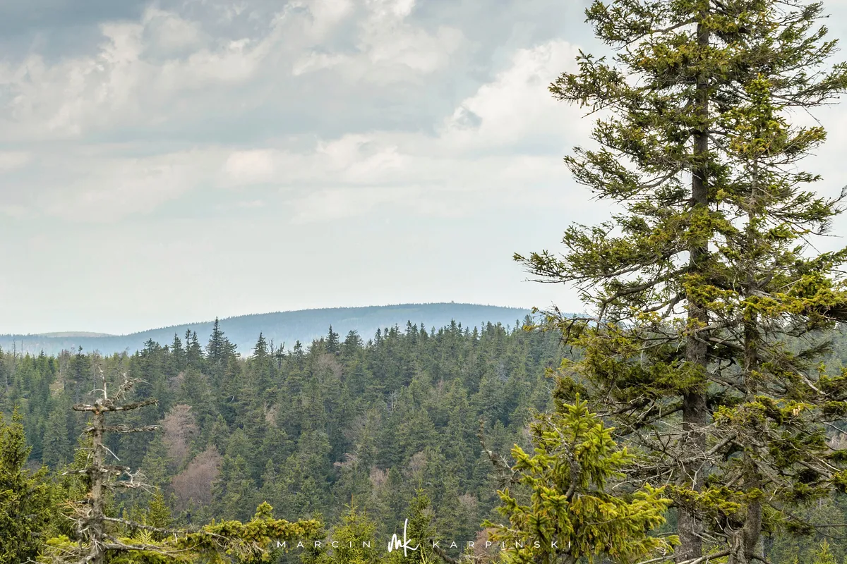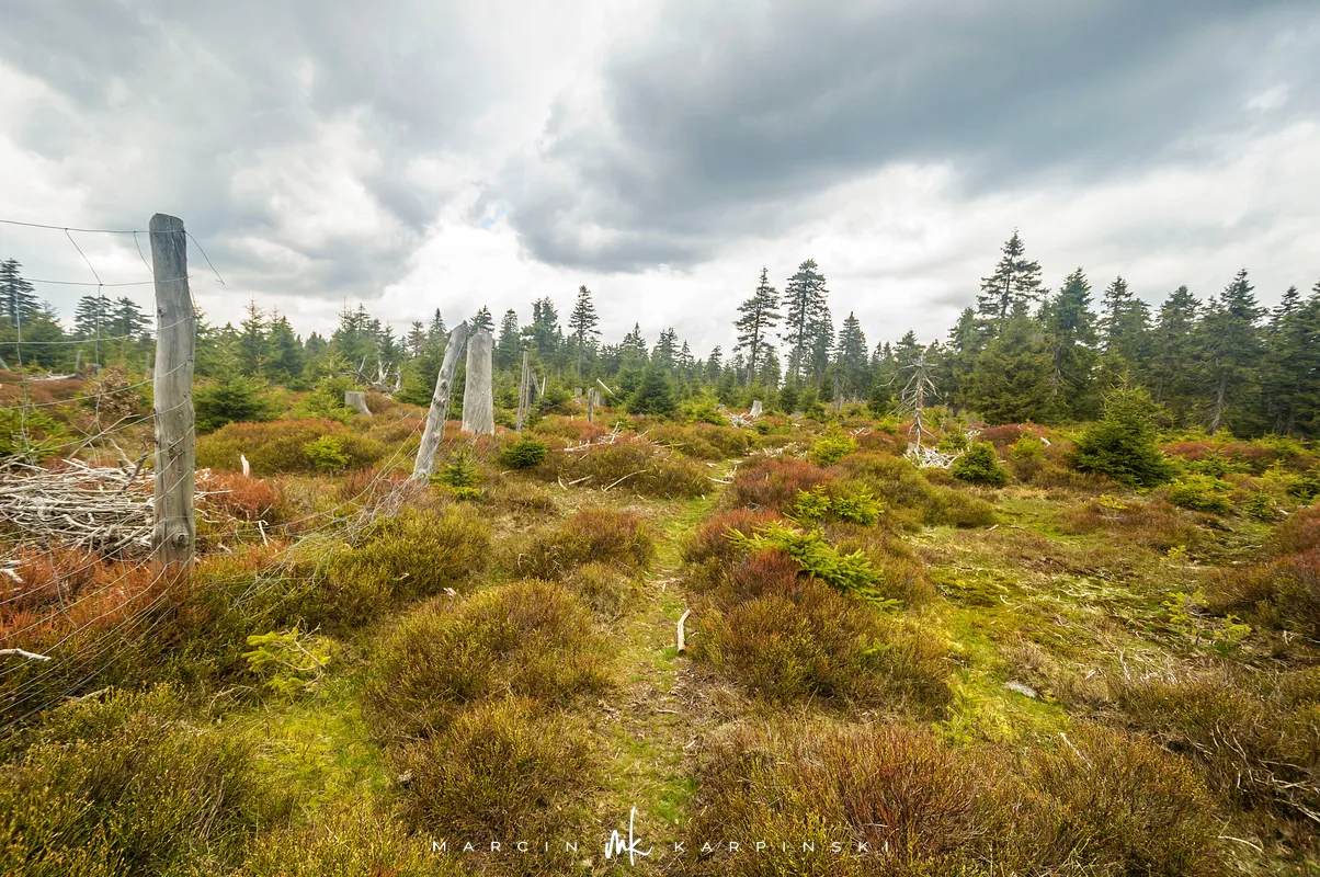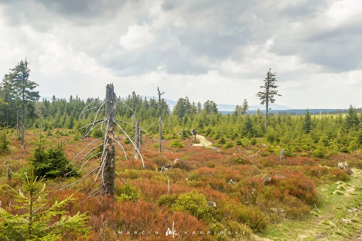 Z Kowadła schodzimy już żółtym, czeskim szlakiem wzdłuż granicy. Zejście jest początkowo dość strome, idziemy po kamienistej ścieżce wśród drzew. Po piętnastu minutach robi się już płasko. Idziemy nadal lasem. Po kolejnym kwadransie wychodzimy na otwarty teren, a to za sprawą wyciętych, a może i wcześniej połamanych przez wiatr drzew. Kolejną godzinę marszu idziemy lasem, nie ma większych podejść, ani zejść. Dochodzimy do słupka granicznego 41/14. Od niego odchodzimy w prawo kilka metrów i jesteśmy na Smreku Trójkrajnym. Tutaj pierwszy od Kowadła odpoczynek. Idąc dalej po dziesięciu minutach dochodzimy do Przełęczy Trzech Granic. W miejscu tym schodziły się granice Moraw, Śląska i ziemi kłodzkiej. Nie zatrzymując się wchodzimy na czerwony szlak, który zaprowadzi nas do najwyższego punktu Gór Złotych, leżącego w Czechach szczytu Smrk. Dojście do niego zajmuje nam niecałe 10 minut, choć w końcowym odcinku droga robi się podmokła i grząska. Wracamy do przełęczy i dalej już bez szlaku idziemy wzdłuż granicy na południowy-zachód.