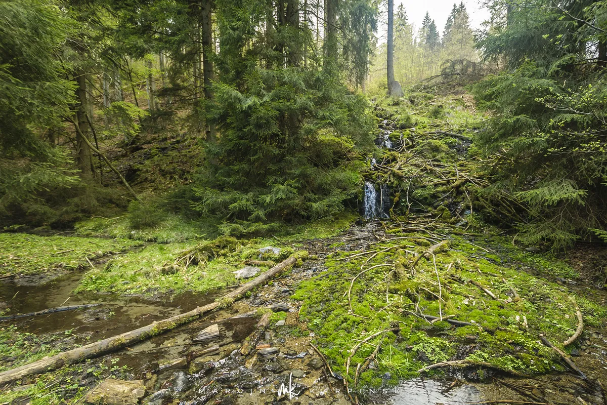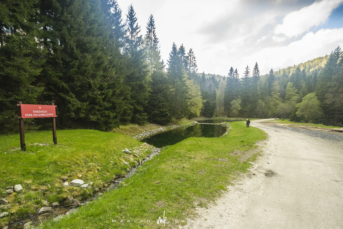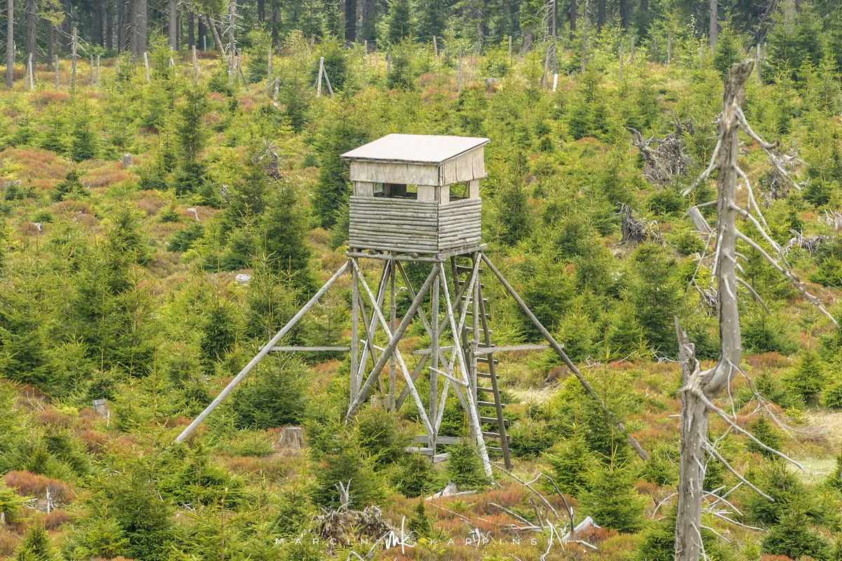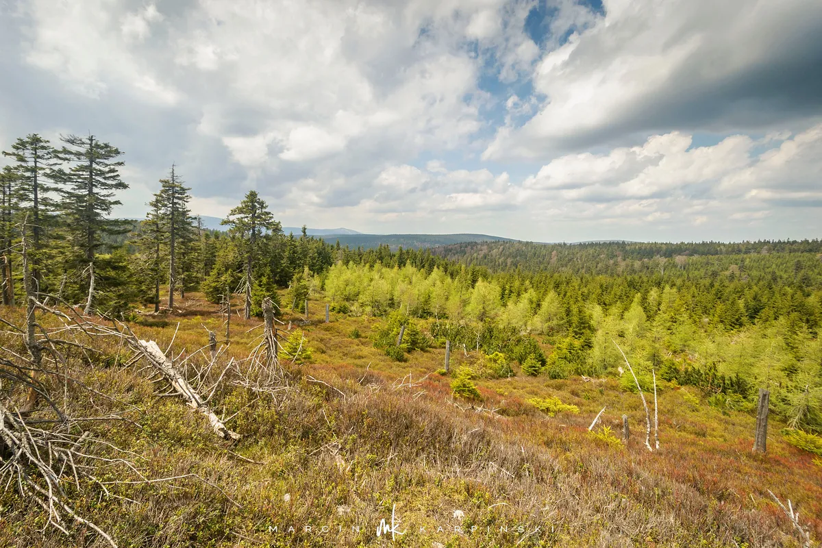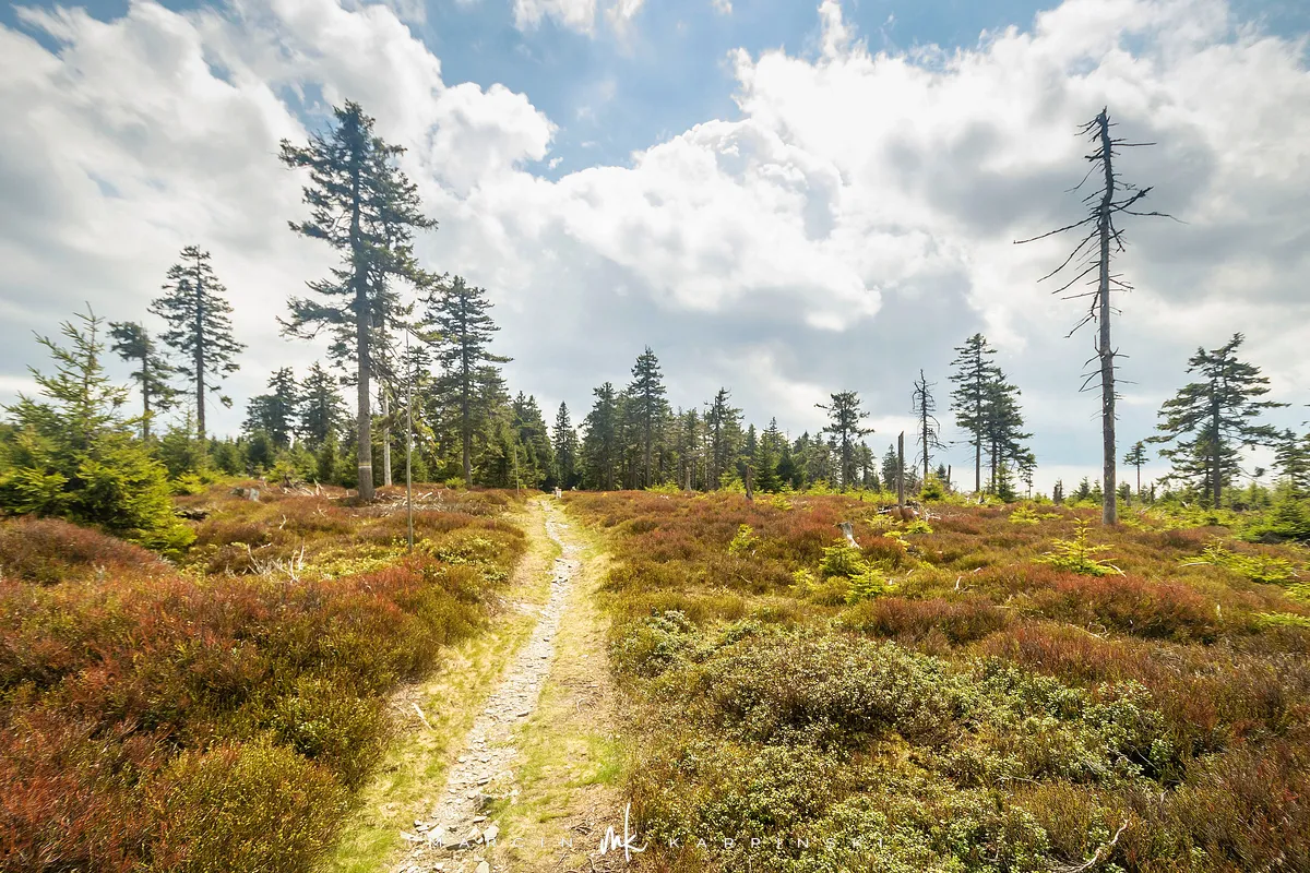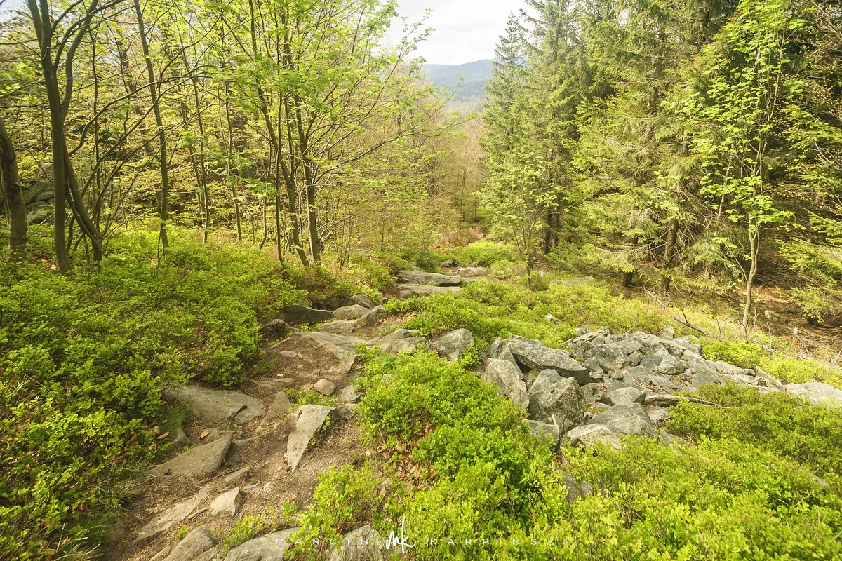 Z Kowadła schodzimy już żółtym, czeskim szlakiem wzdłuż granicy. Zejście jest początkowo dość strome, idziemy po kamienistej ścieżce wśród drzew. Po piętnastu minutach robi się już płasko. Idziemy nadal lasem. Po kolejnym kwadransie wychodzimy na otwarty teren, a to za sprawą wyciętych, a może i wcześniej połamanych przez wiatr drzew. Kolejną godzinę marszu idziemy lasem, nie ma większych podejść, ani zejść. Dochodzimy do słupka granicznego 41/14. Od niego odchodzimy w prawo kilka metrów i jesteśmy na Smreku Trójkrajnym. Tutaj pierwszy od Kowadła odpoczynek. Idąc dalej po dziesięciu minutach dochodzimy do Przełęczy Trzech Granic. W miejscu tym schodziły się granice Moraw, Śląska i ziemi kłodzkiej. Nie zatrzymując się wchodzimy na czerwony szlak, który zaprowadzi nas do najwyższego punktu Gór Złotych, leżącego w Czechach szczytu Smrk. Dojście do niego zajmuje nam niecałe 10 minut, choć w końcowym odcinku droga robi się podmokła i grząska. Wracamy do przełęczy i dalej już bez szlaku idziemy wzdłuż granicy na południowy-zachód.
