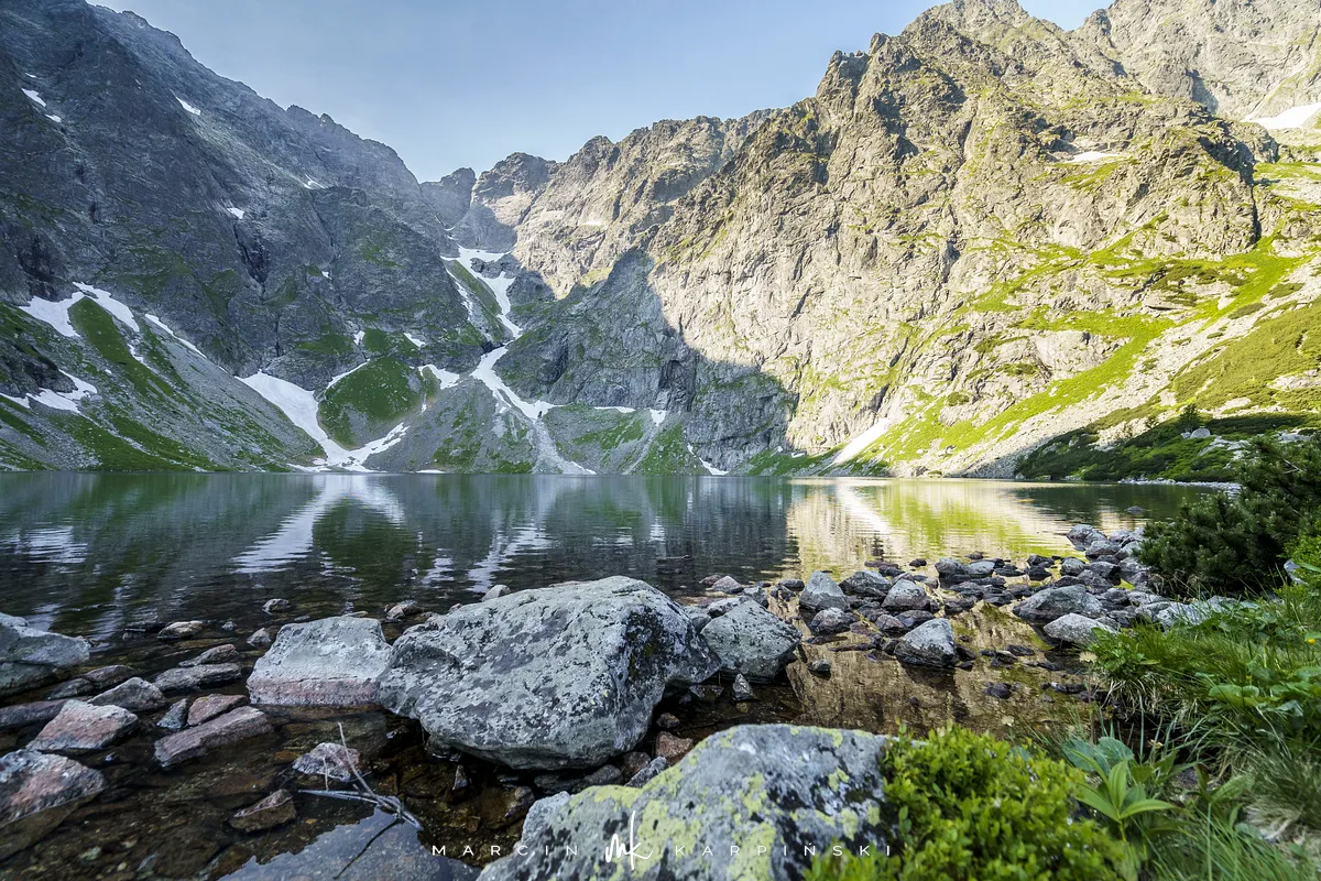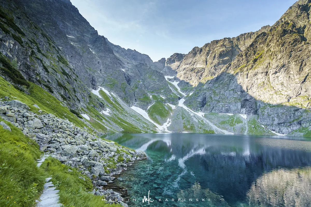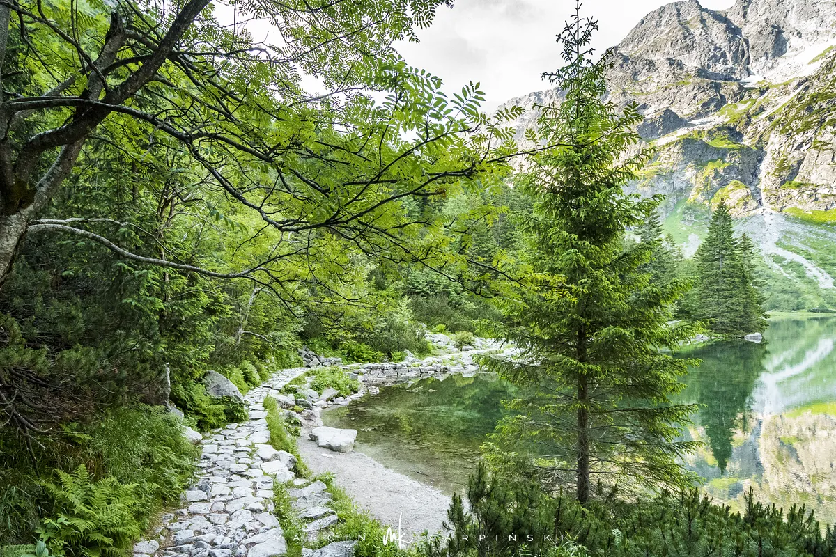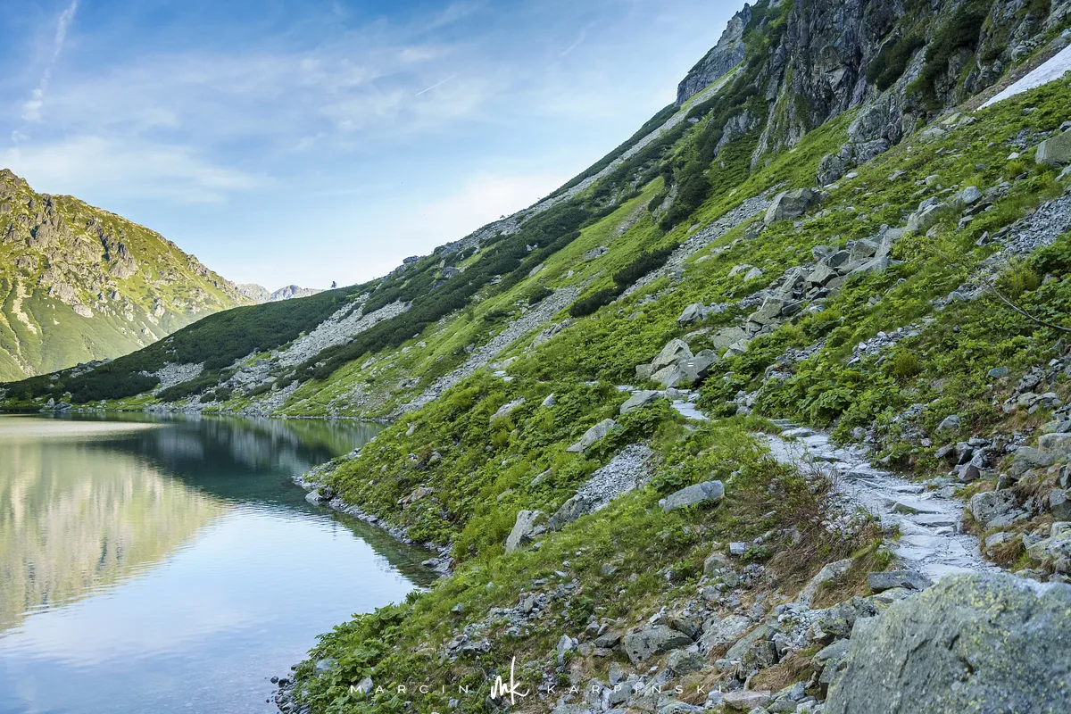 Kolejnym punktem na trasie jest Czarny Staw pod Rysami. Zgodnie z oznaczeniami, dotarcie do niego powinno zająć godzinę. Początkowy odcinek szlaku biegnie wzdłuż wschodniego brzegu Morskiego Oka. Miejsce to jest szczególnie malownicze o poranku, gdy słońce oświetla jedynie górne partie otaczających nas szczytów. Po obejściu stawu docieramy do rozwidlenia, gdzie czerwony szlak prowadzi w górę do Czarnego Stawu. Skręcamy w lewo – gdybyśmy poszli prosto, zatoczylibyśmy pętlę wokół Morskiego Oka i wrócili do schroniska. Dotychczasowa wędrówka nie sprawiała trudności. Od parkingu pokonaliśmy 9 kilometrów i 400 metrów przewyższenia. Teraz czeka nas prawie 200-metrowe podejście. Ścieżka jest wyłożona kamieniami i głazami, a podejście zajmuje nam 15 minut.