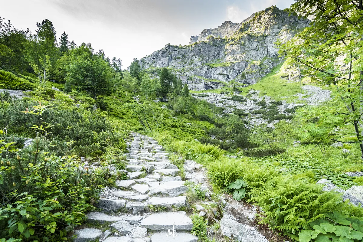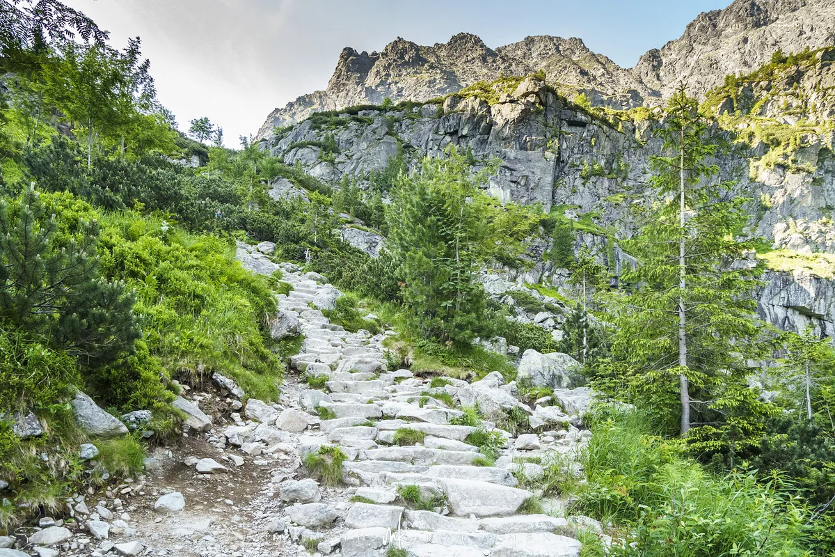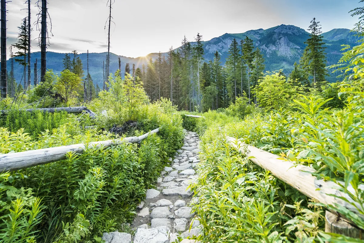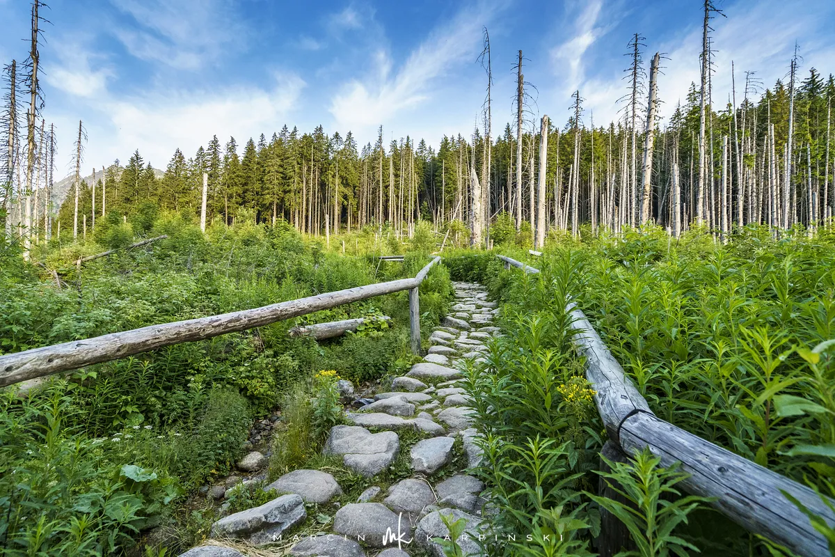 Kolejnym punktem na trasie jest Czarny Staw pod Rysami. Zgodnie z oznaczeniami, dotarcie do niego powinno zająć godzinę. Początkowy odcinek szlaku biegnie wzdłuż wschodniego brzegu Morskiego Oka. Miejsce to jest szczególnie malownicze o poranku, gdy słońce oświetla jedynie górne partie otaczających nas szczytów. Po obejściu stawu docieramy do rozwidlenia, gdzie czerwony szlak prowadzi w górę do Czarnego Stawu. Skręcamy w lewo – gdybyśmy poszli prosto, zatoczylibyśmy pętlę wokół Morskiego Oka i wrócili do schroniska. Dotychczasowa wędrówka nie sprawiała trudności. Od parkingu pokonaliśmy 9 kilometrów i 400 metrów przewyższenia. Teraz czeka nas prawie 200-metrowe podejście. Ścieżka jest wyłożona kamieniami i głazami, a podejście zajmuje nam 15 minut.