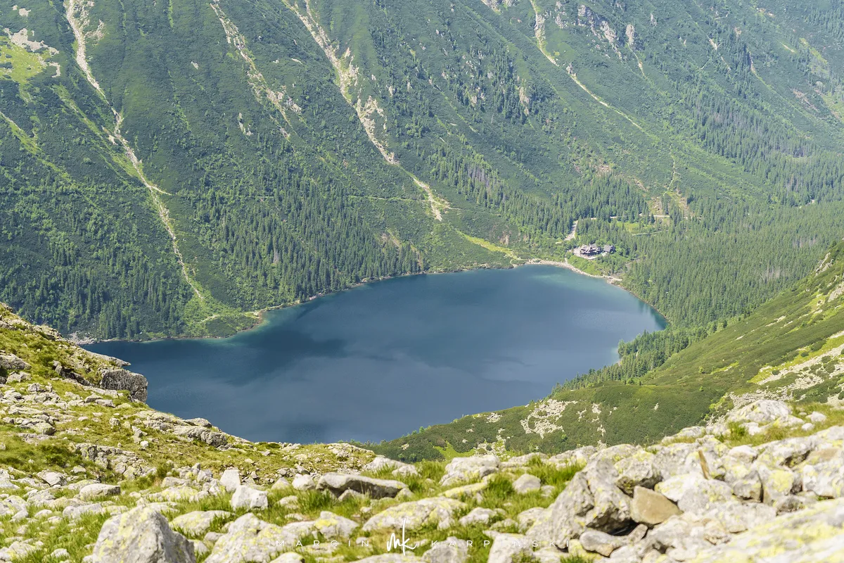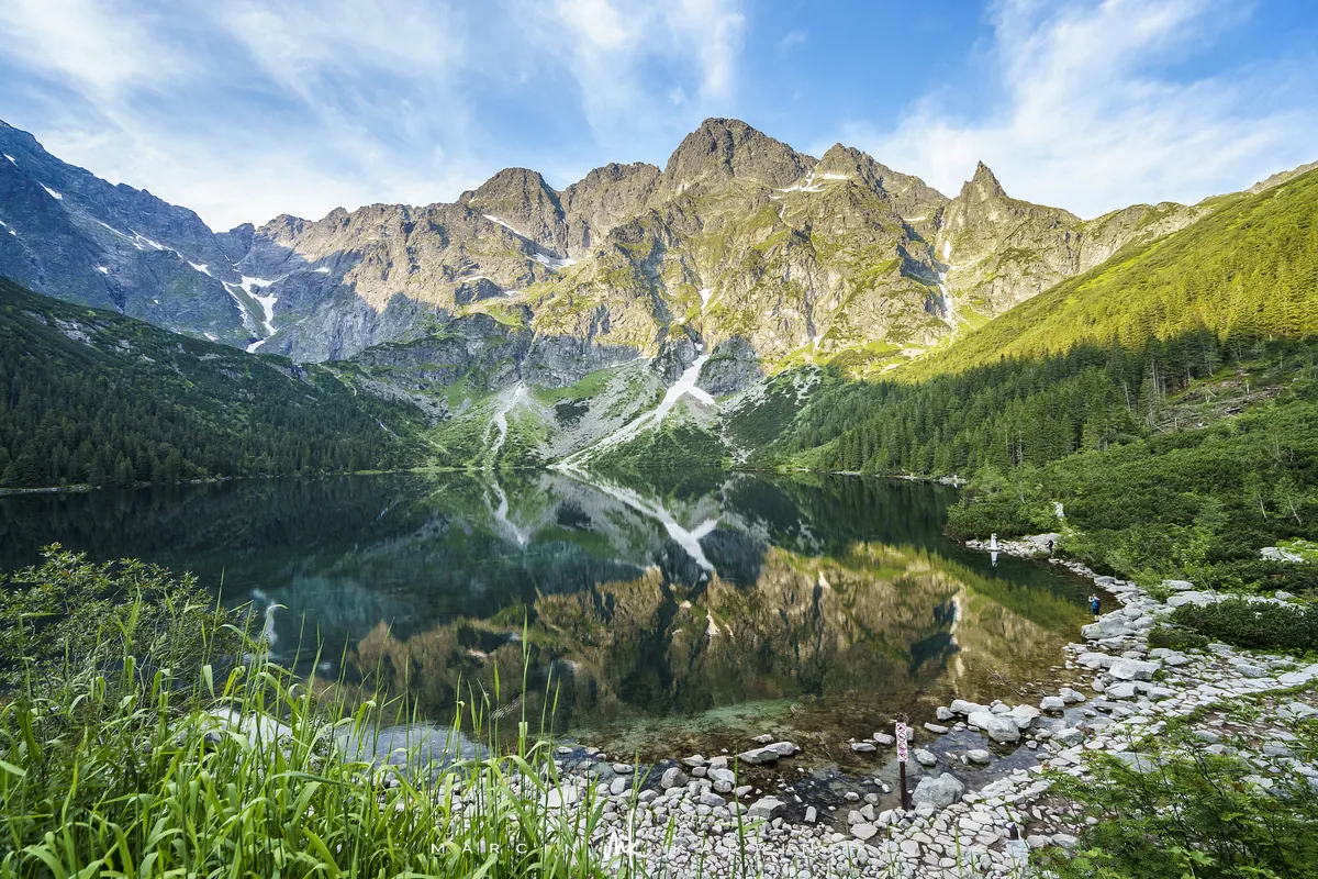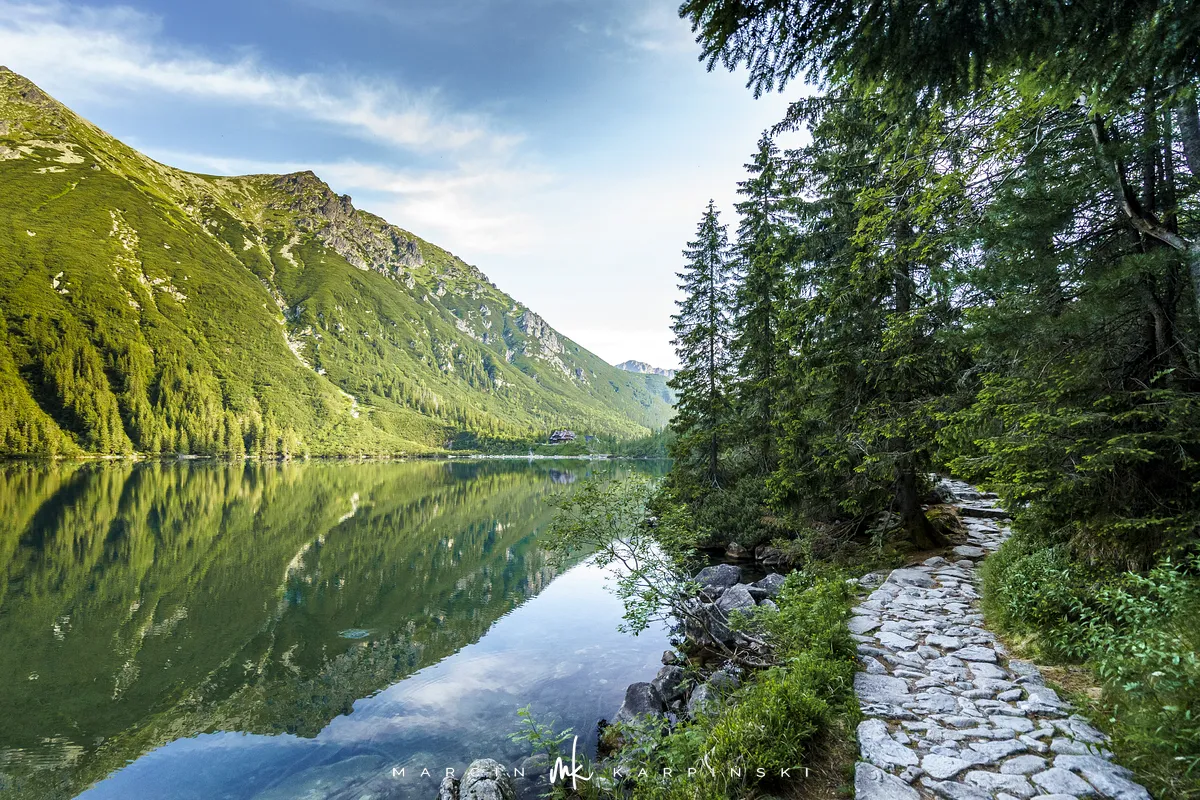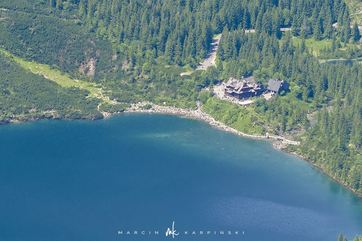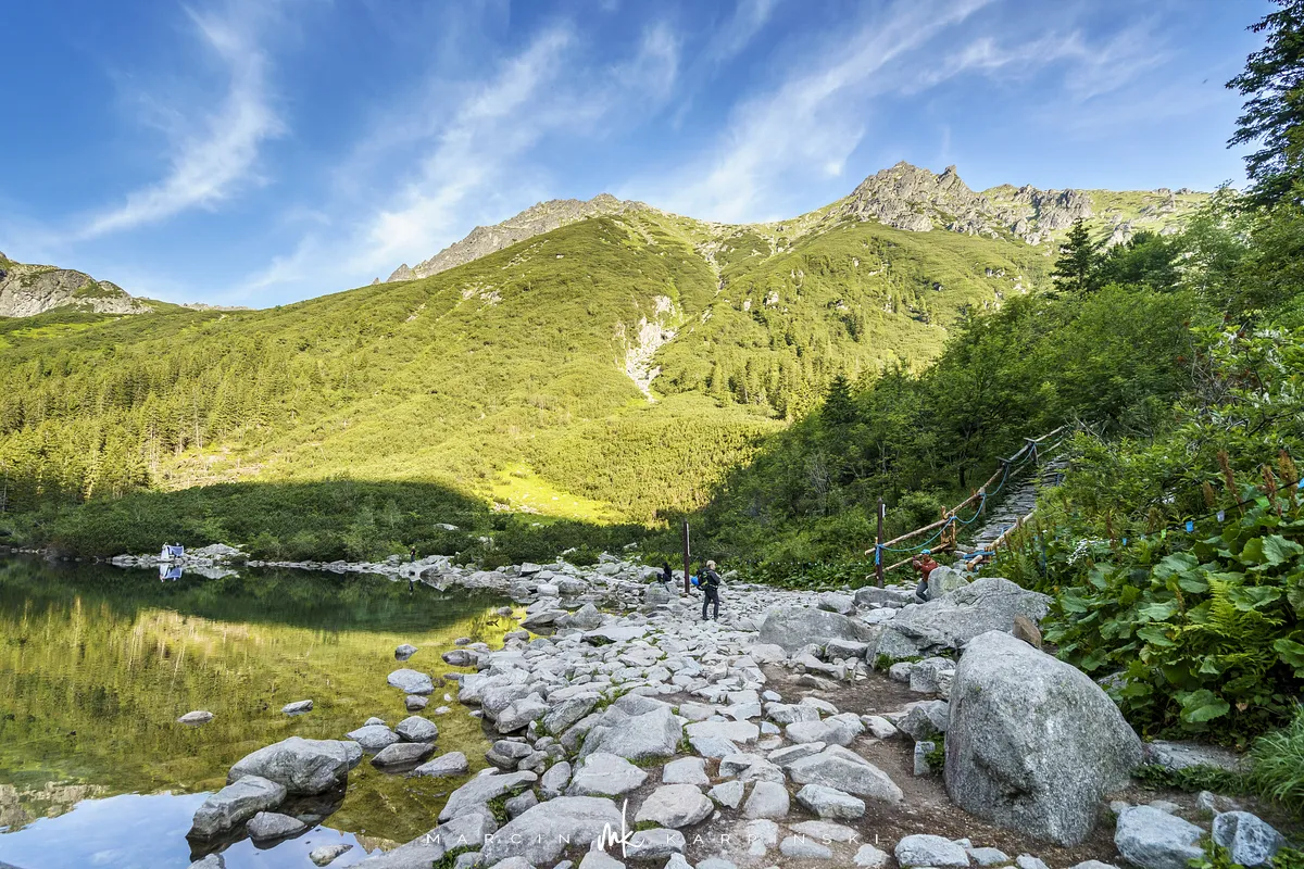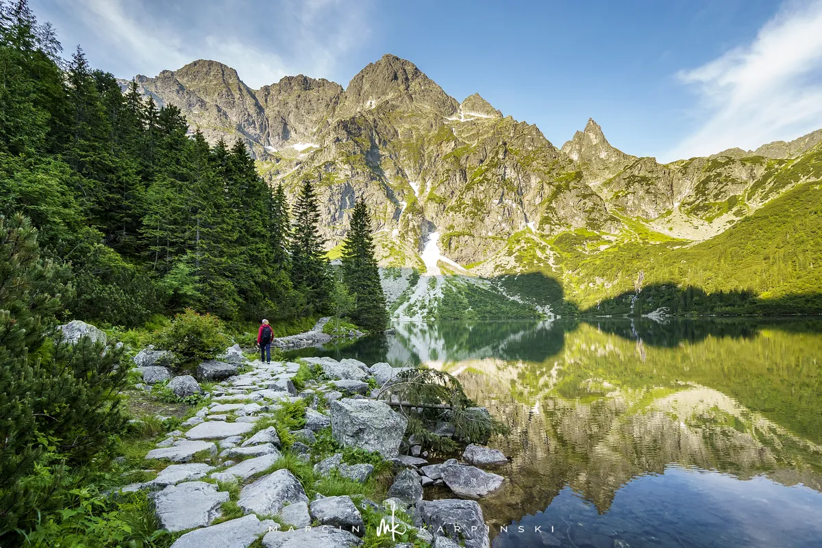 Morskie Oko to najsłynniejszy tatrzański staw. Do niedawna uznawano je również za największe pod względem powierzchni, jednak według najnowszych pomiarów większy jest Wielki Staw Polski w Dolinie Pięciu Stawów Polskich. Tafla wody Morskiego Oka znajduje się na wysokości około 1410 m n.p.m. Stojąc nad brzegiem jeziora, na pierwszy plan wysuwają się trzy wierzchołki Mięguszowieckich Szczytów, które przewyższają taflę wody o ponad kilometr. Charakterystyczna jest także sylwetka Mnicha, widoczna na prawo od Mięguszowieckich Szczytów. Cel naszej wyprawy, czyli Rysy, to niewyróżniający się szczyt po lewej stronie. Od Morskiego Oka ruszamy o 7:10.