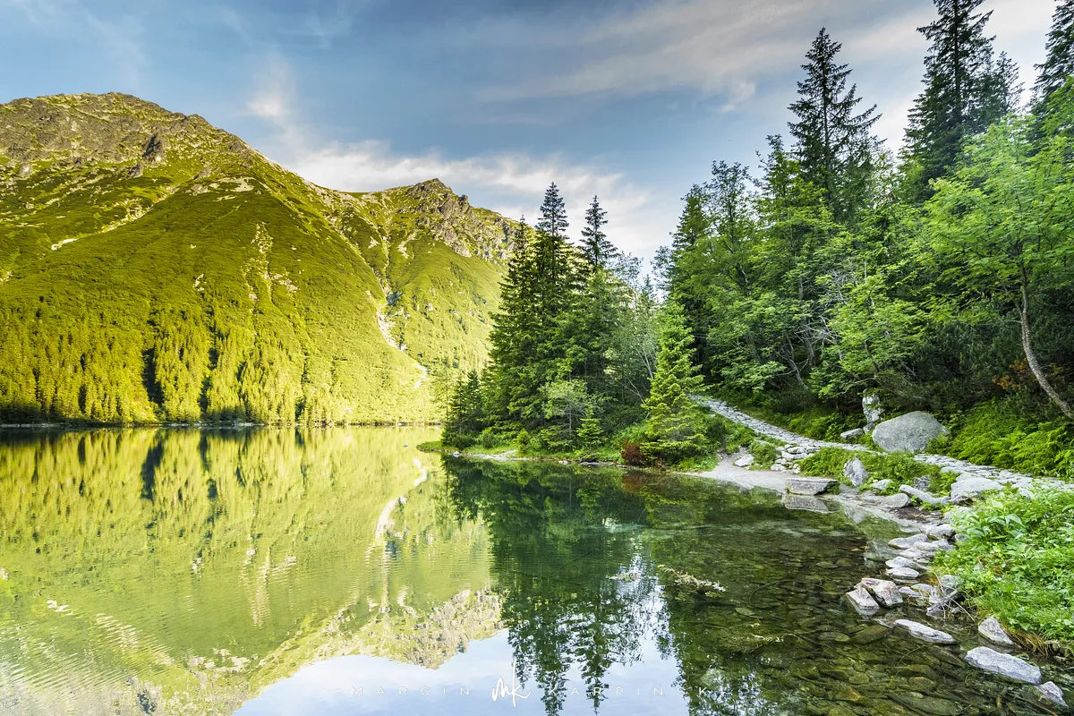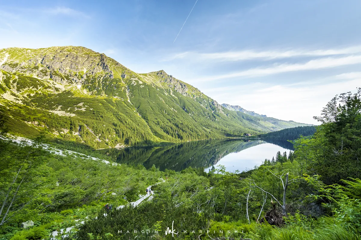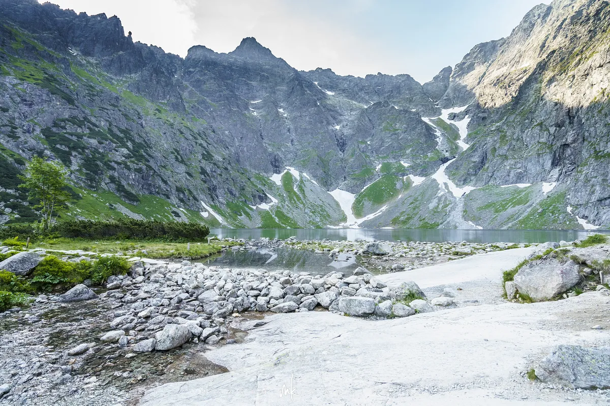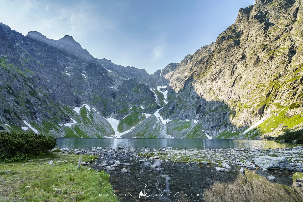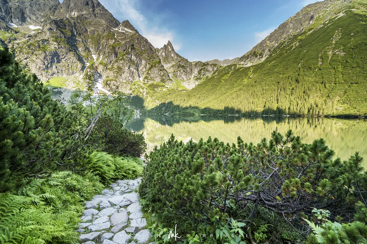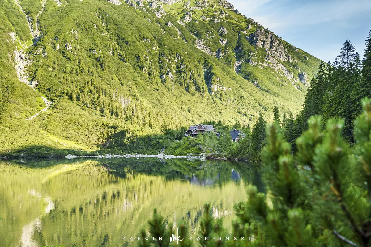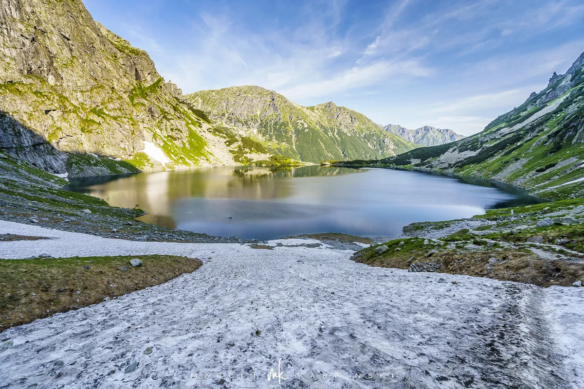 Morskie Oko to najsłynniejszy tatrzański staw. Do niedawna uznawano je również za największe pod względem powierzchni, jednak według najnowszych pomiarów większy jest Wielki Staw Polski w Dolinie Pięciu Stawów Polskich. Tafla wody Morskiego Oka znajduje się na wysokości około 1410 m n.p.m. Stojąc nad brzegiem jeziora, na pierwszy plan wysuwają się trzy wierzchołki Mięguszowieckich Szczytów, które przewyższają taflę wody o ponad kilometr. Charakterystyczna jest także sylwetka Mnicha, widoczna na prawo od Mięguszowieckich Szczytów. Cel naszej wyprawy, czyli Rysy, to niewyróżniający się szczyt po lewej stronie. Od Morskiego Oka ruszamy o 7:10.