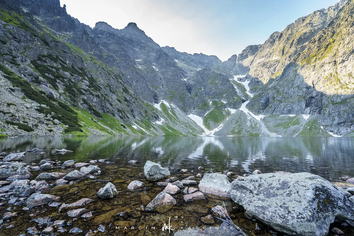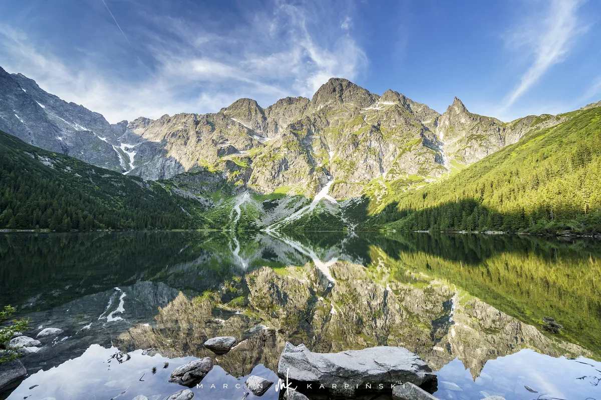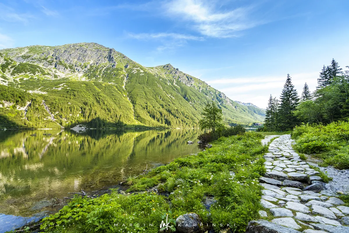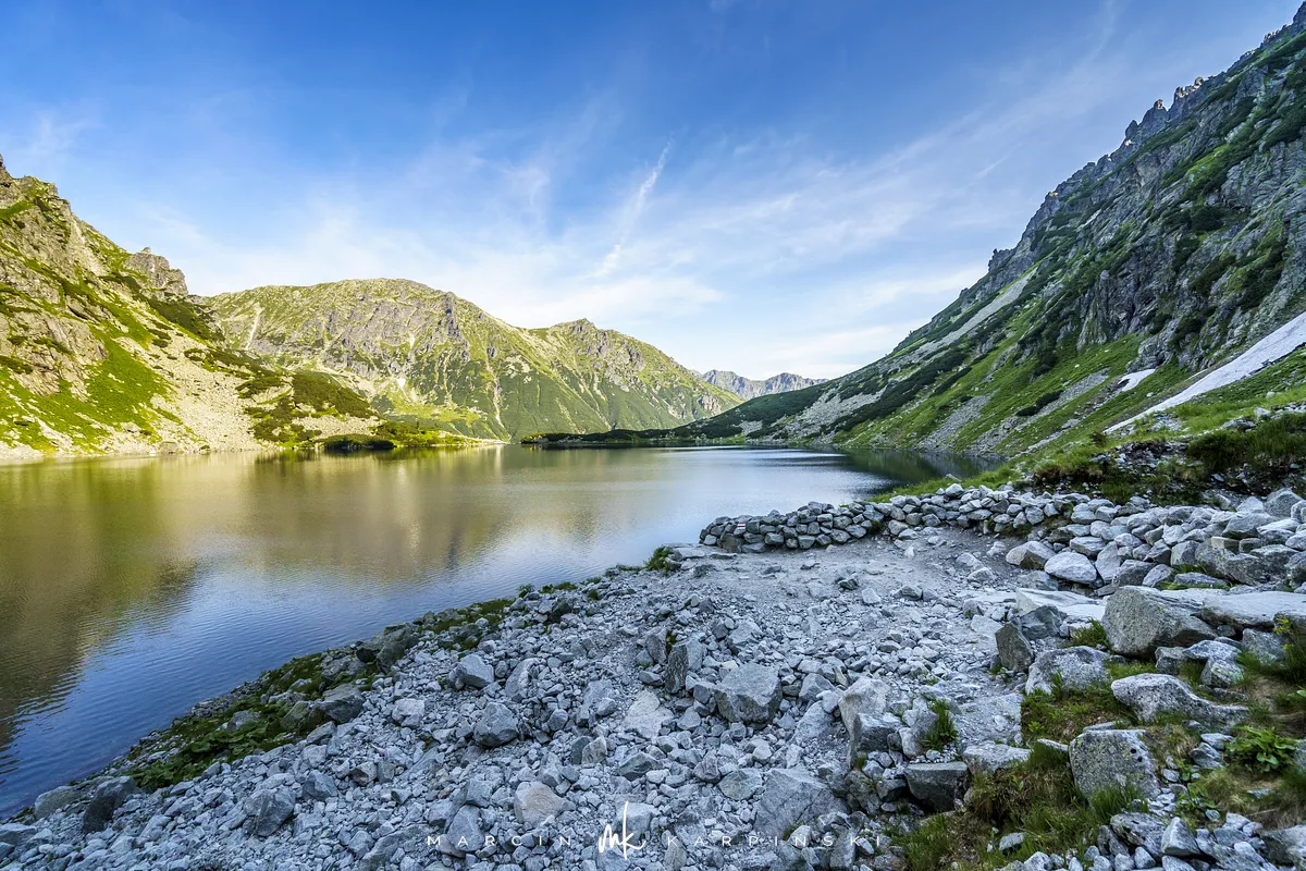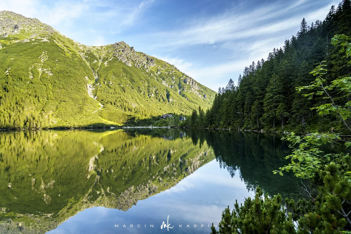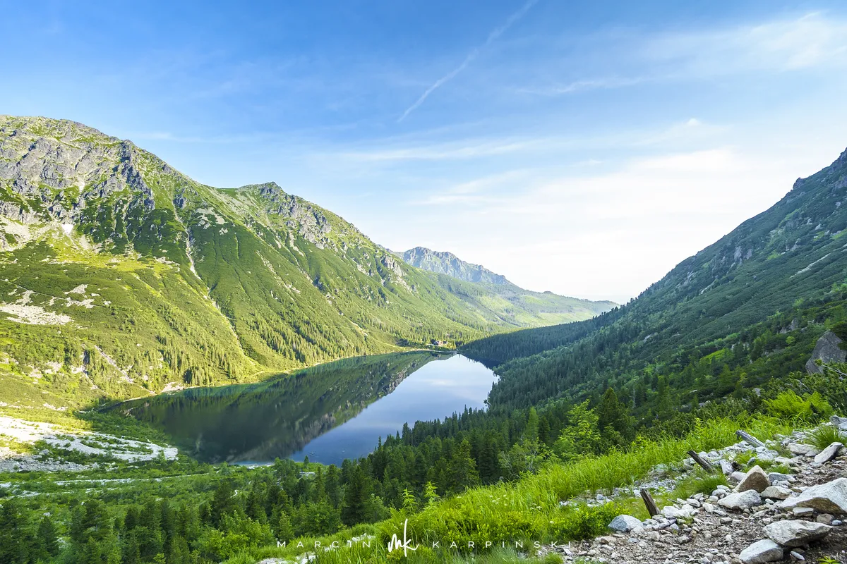Morskie Oko to najsłynniejszy tatrzański staw. Do niedawna uznawano je również za największe pod względem powierzchni, jednak według najnowszych pomiarów większy jest Wielki Staw Polski w Dolinie Pięciu Stawów Polskich. Tafla wody Morskiego Oka znajduje się na wysokości około 1410 m n.p.m. Stojąc nad brzegiem jeziora, na pierwszy plan wysuwają się trzy wierzchołki Mięguszowieckich Szczytów, które przewyższają taflę wody o ponad kilometr. Charakterystyczna jest także sylwetka Mnicha, widoczna na prawo od Mięguszowieckich Szczytów. Cel naszej wyprawy, czyli Rysy, to niewyróżniający się szczyt po lewej stronie. Od Morskiego Oka ruszamy o 7:10.