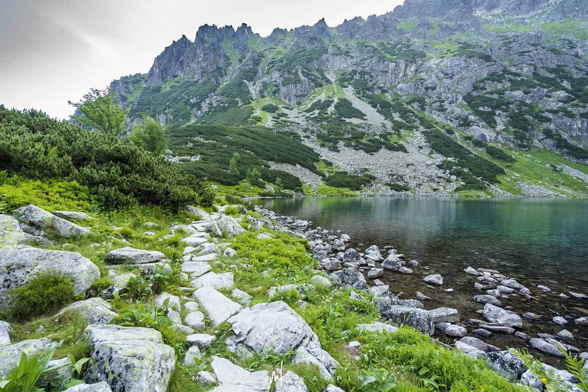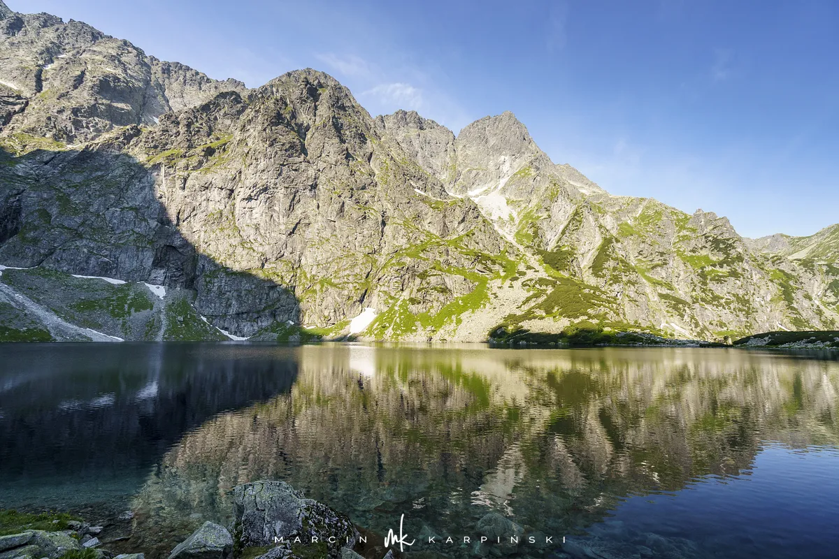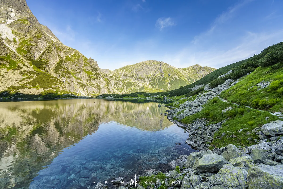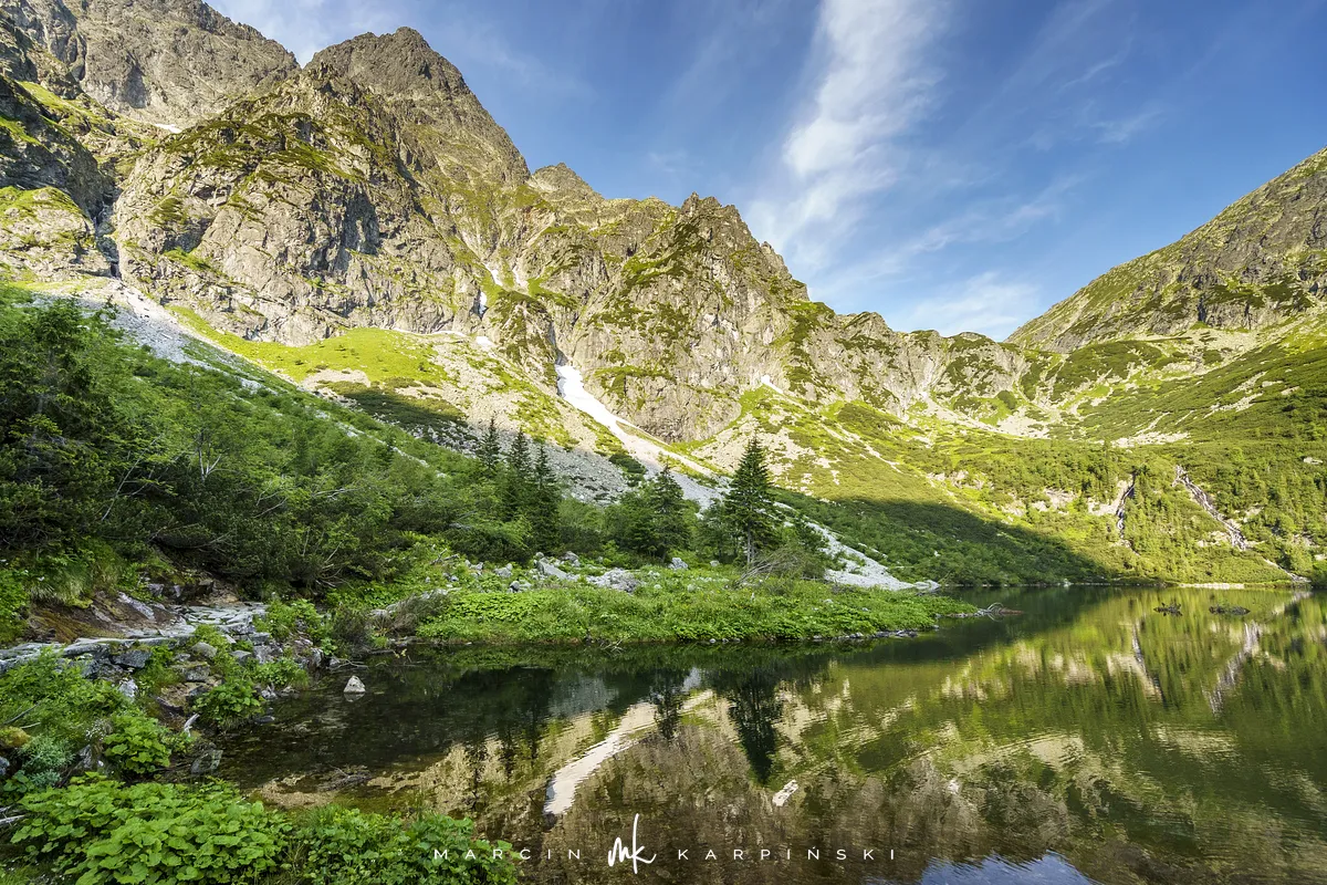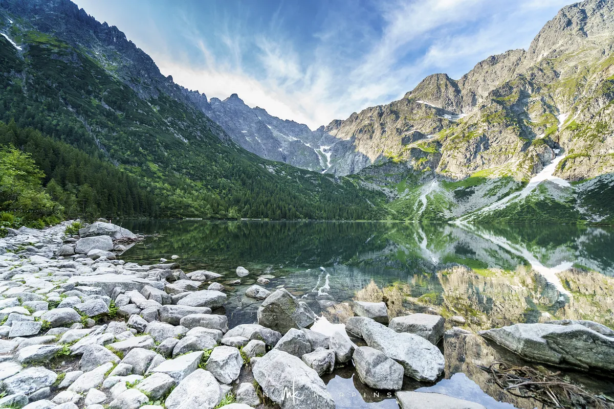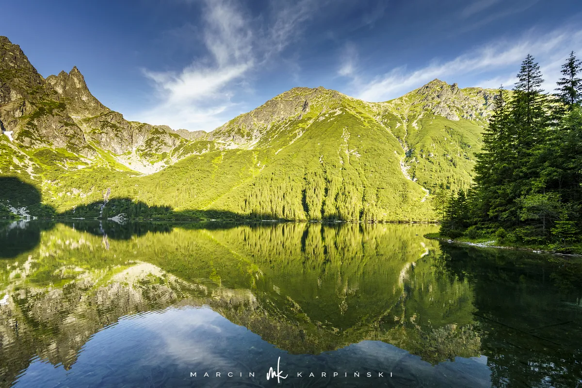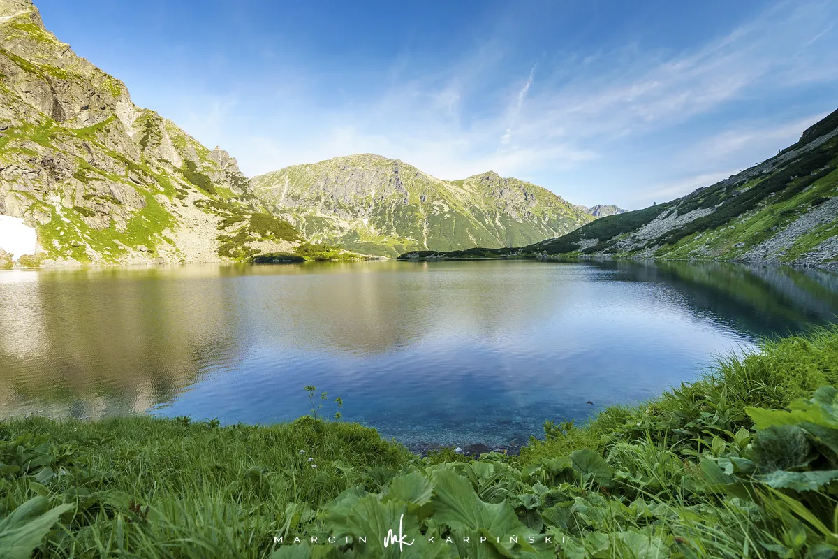 Morskie Oko to najsłynniejszy tatrzański staw. Do niedawna uznawano je również za największe pod względem powierzchni, jednak według najnowszych pomiarów większy jest Wielki Staw Polski w Dolinie Pięciu Stawów Polskich. Tafla wody Morskiego Oka znajduje się na wysokości około 1410 m n.p.m. Stojąc nad brzegiem jeziora, na pierwszy plan wysuwają się trzy wierzchołki Mięguszowieckich Szczytów, które przewyższają taflę wody o ponad kilometr. Charakterystyczna jest także sylwetka Mnicha, widoczna na prawo od Mięguszowieckich Szczytów. Cel naszej wyprawy, czyli Rysy, to niewyróżniający się szczyt po lewej stronie. Od Morskiego Oka ruszamy o 7:10.