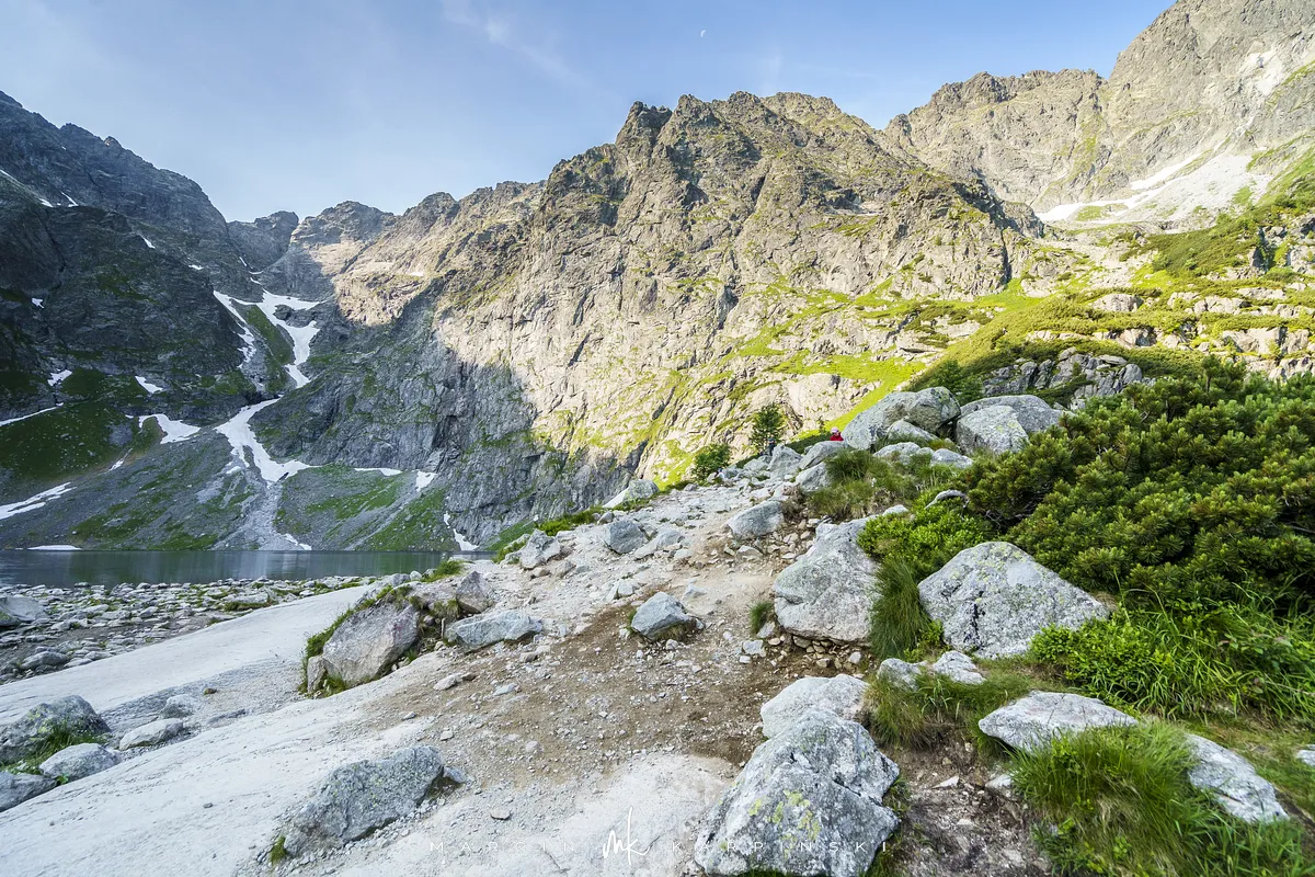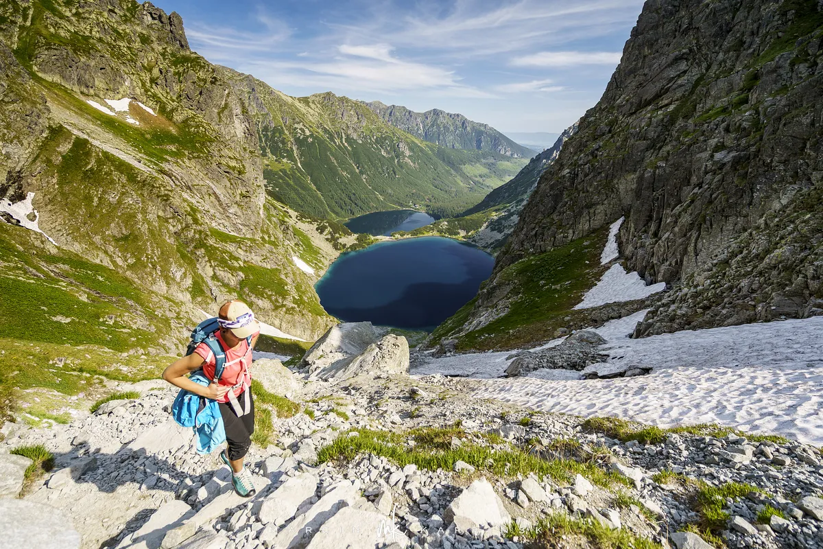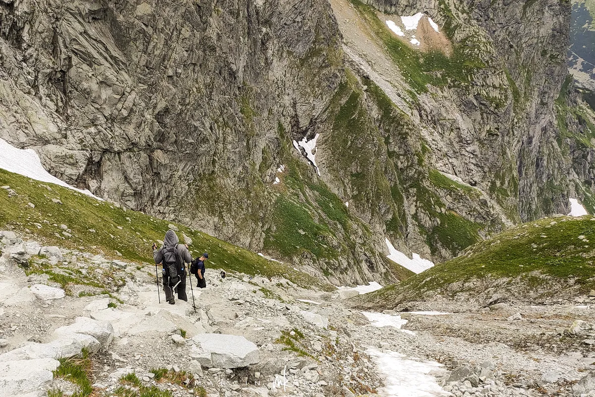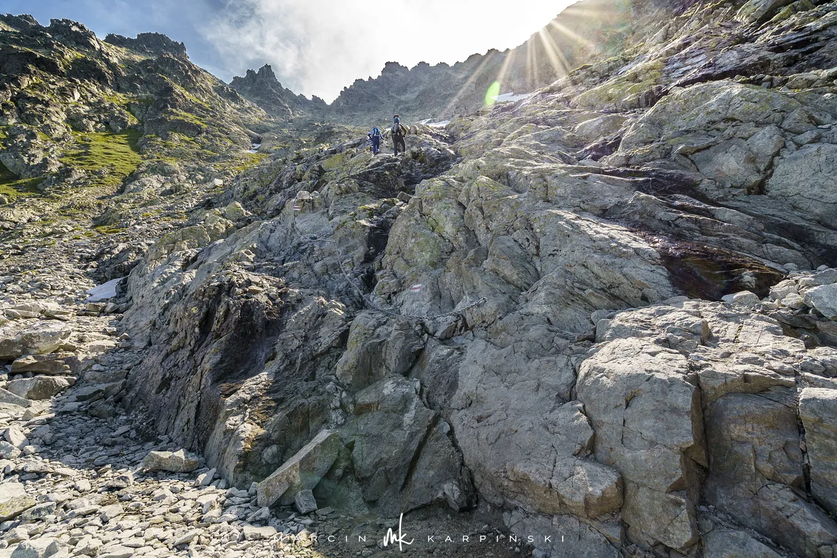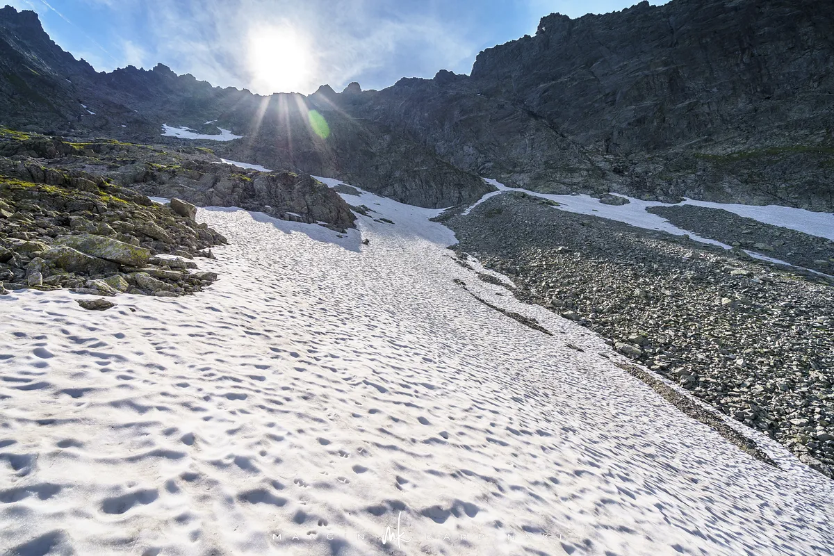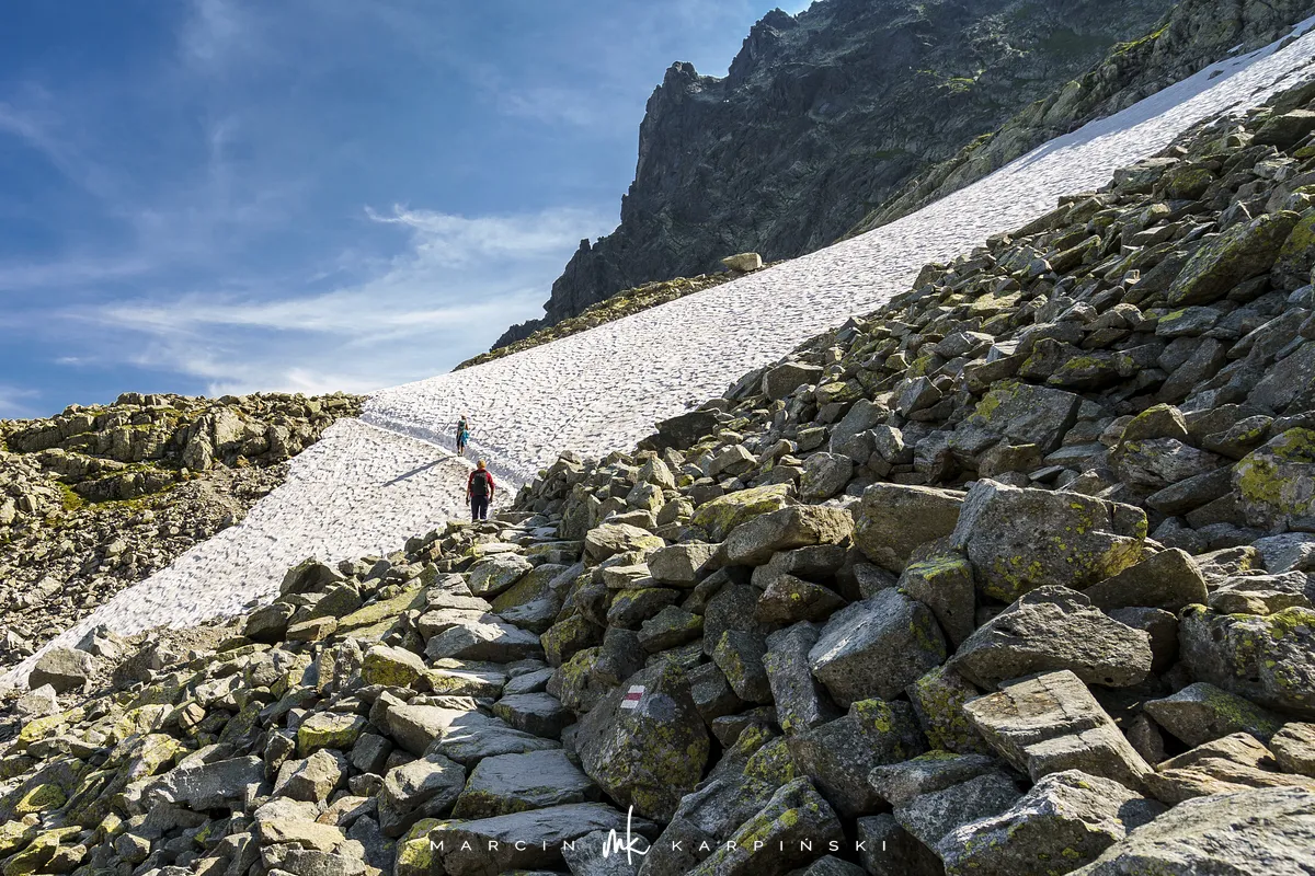 Obchodzimy Czarny Staw od wschodu, a następnie kierujemy się w stronę Buli pod Rysami. Od tego momentu czeka nas mozolne zdobywanie wysokości po kamieniach i skałach. W niektórych miejscach szlak jest zniszczony, co utrudnia przejście. Mimo że jest połowa lipca, w kilku miejscach leży jeszcze śnieg, co dodatkowo komplikuje wędrówkę.