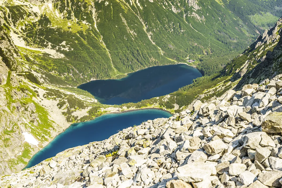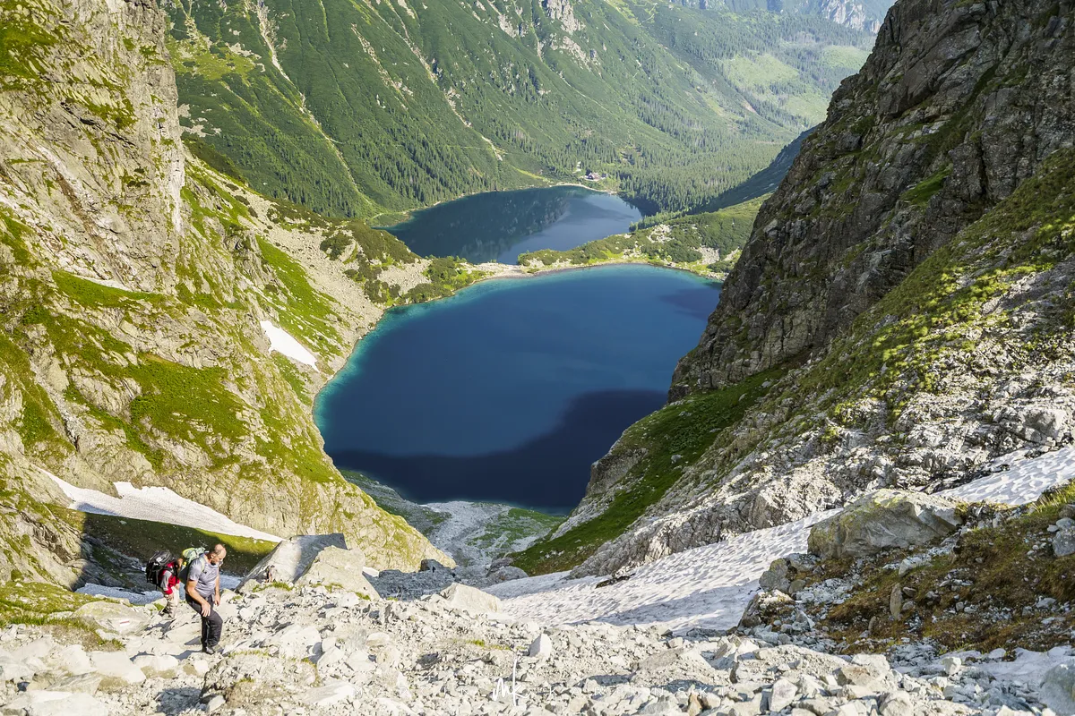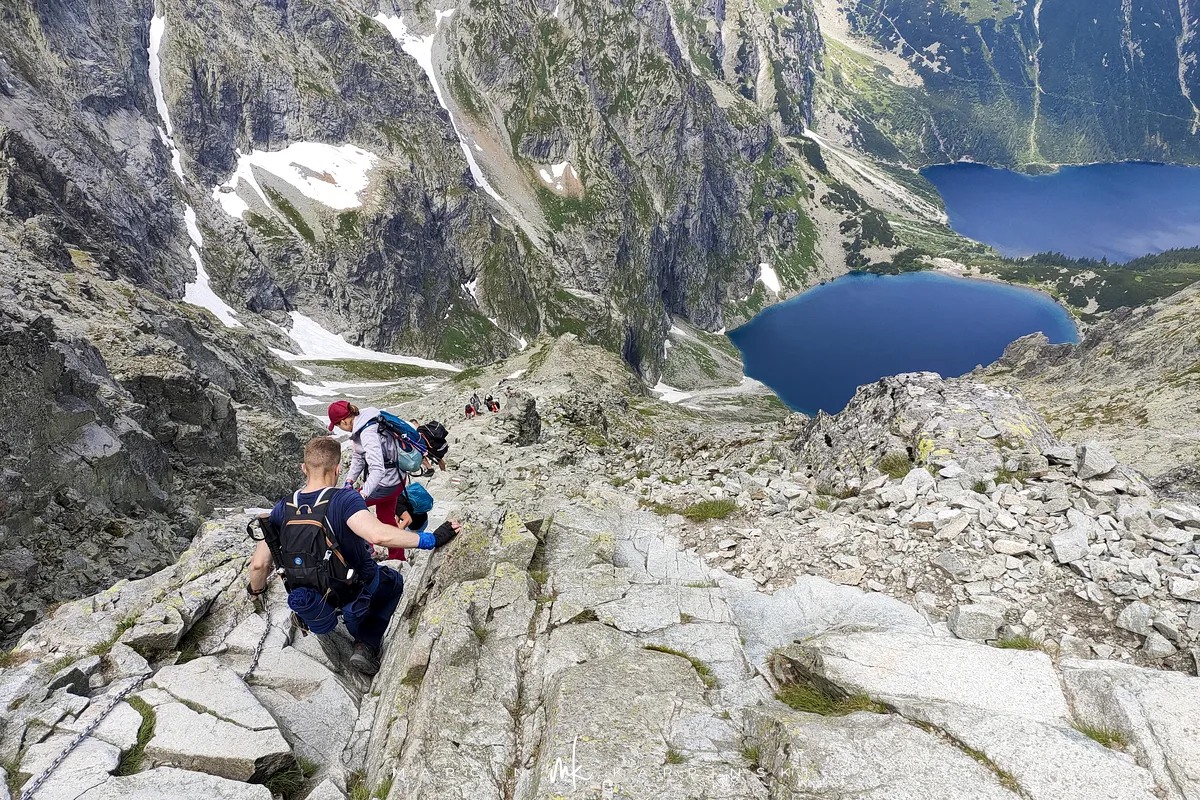 Schodzimy tą samą trasą. Odcinek z łańcuchami jest dodatkowo utrudniony przez mijające się osoby. Zmniejszamy tempo i robimy więcej przerw. Skutkuje to tym, że zejście zajmuje nam o godzinę więcej niż wejście. Nad Morskim Okiem jesteśmy o 16:30, a na parkingu o 18:50.