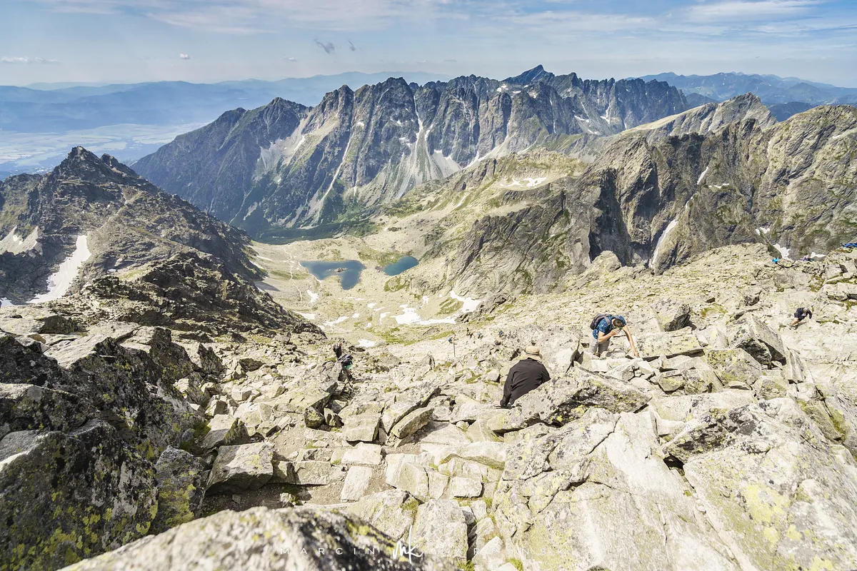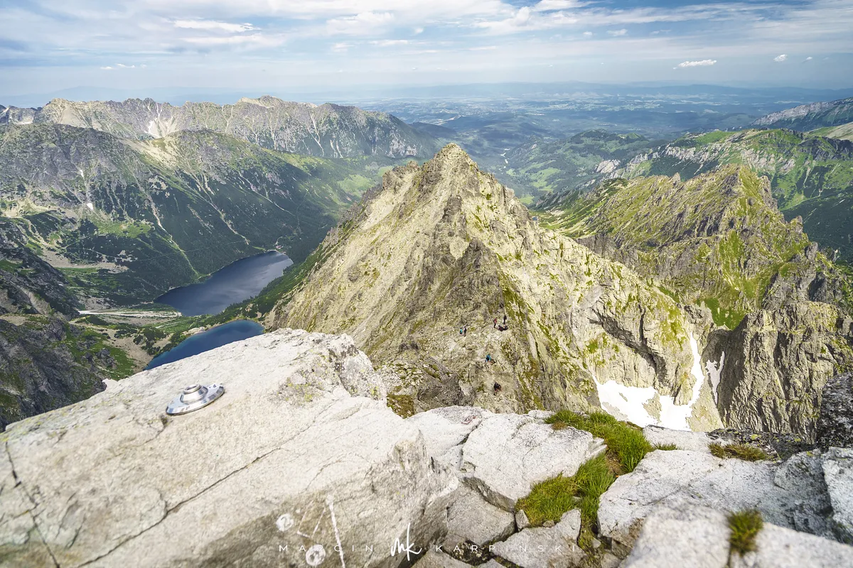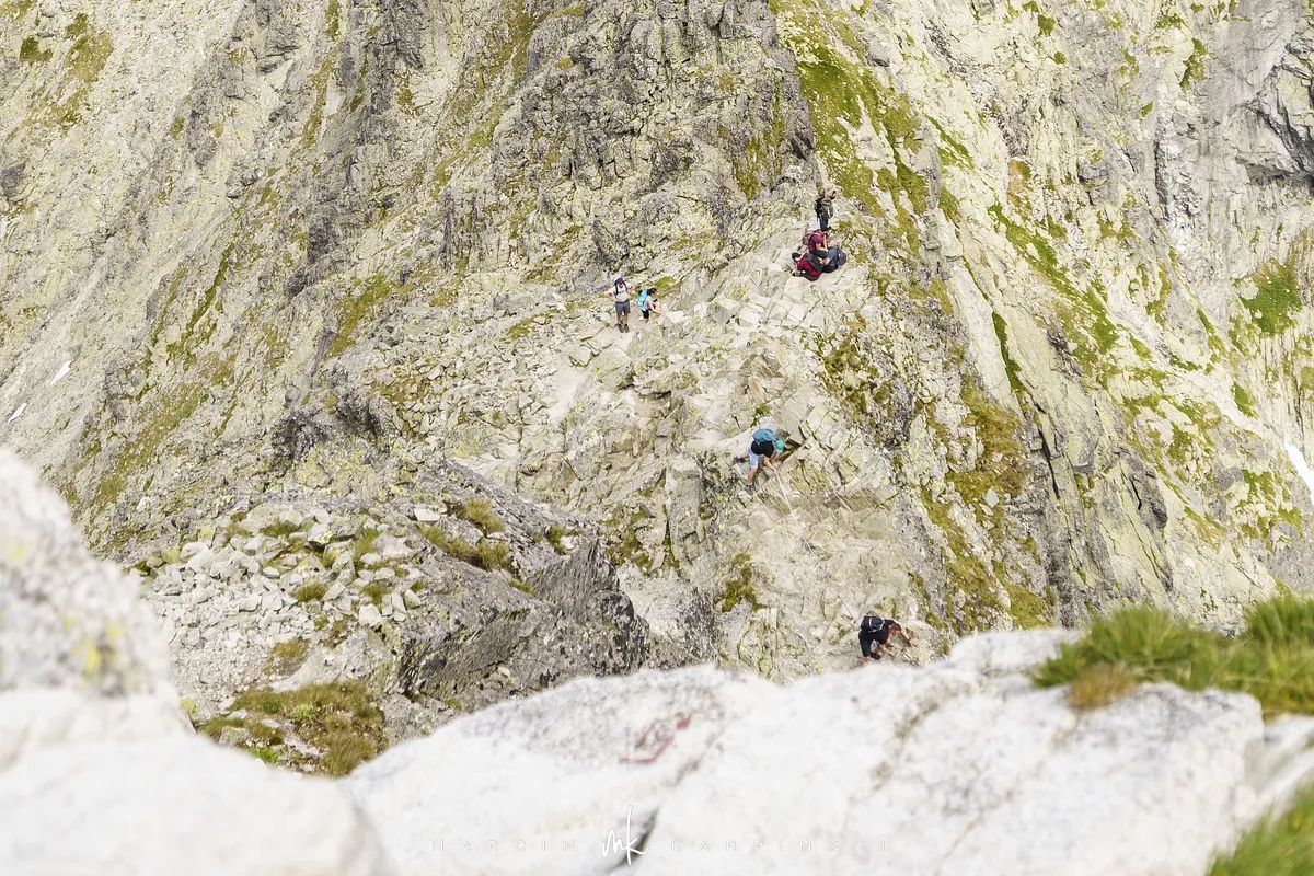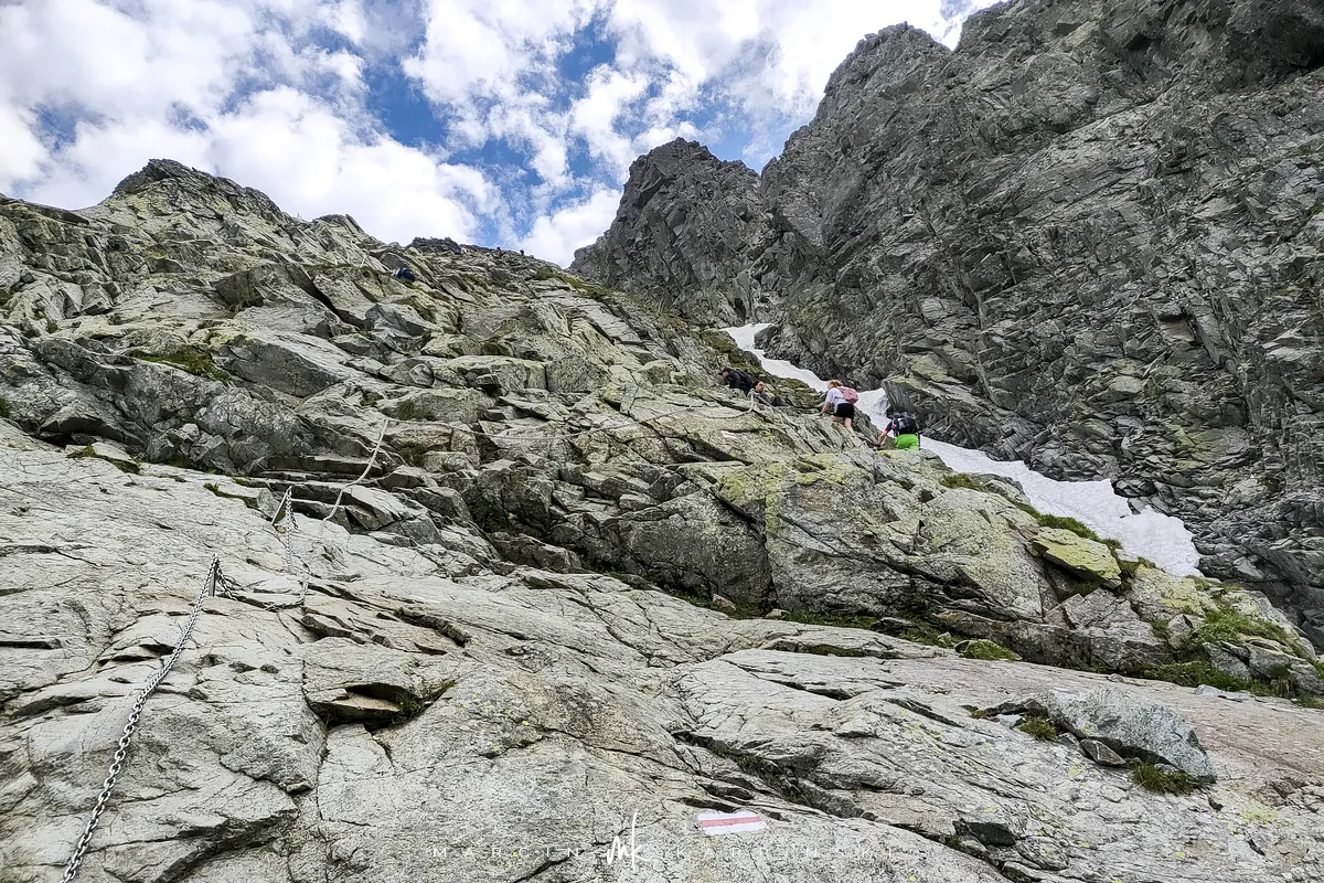 O godzinie 9:45 docieramy do miejsca, w którym zaczyna się ubezpieczony łańcuchami odcinek szlaku. Ścieżka prowadzi przez strome, skalne płyty. Łańcuchy będą towarzyszyć nam już do samego szczytu, choć zdarzają się krótkie odcinki bez zabezpieczeń. Tuż przed wierzchołkiem czeka nas najtrudniejszy fragment trasy – tzw. „przełączka”. Technicznie nie jest on skomplikowany, jednak ekspozycja może być dla niektórych osób paraliżująca.