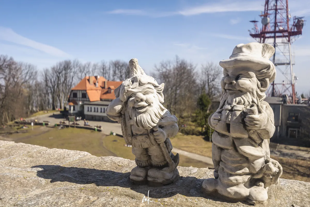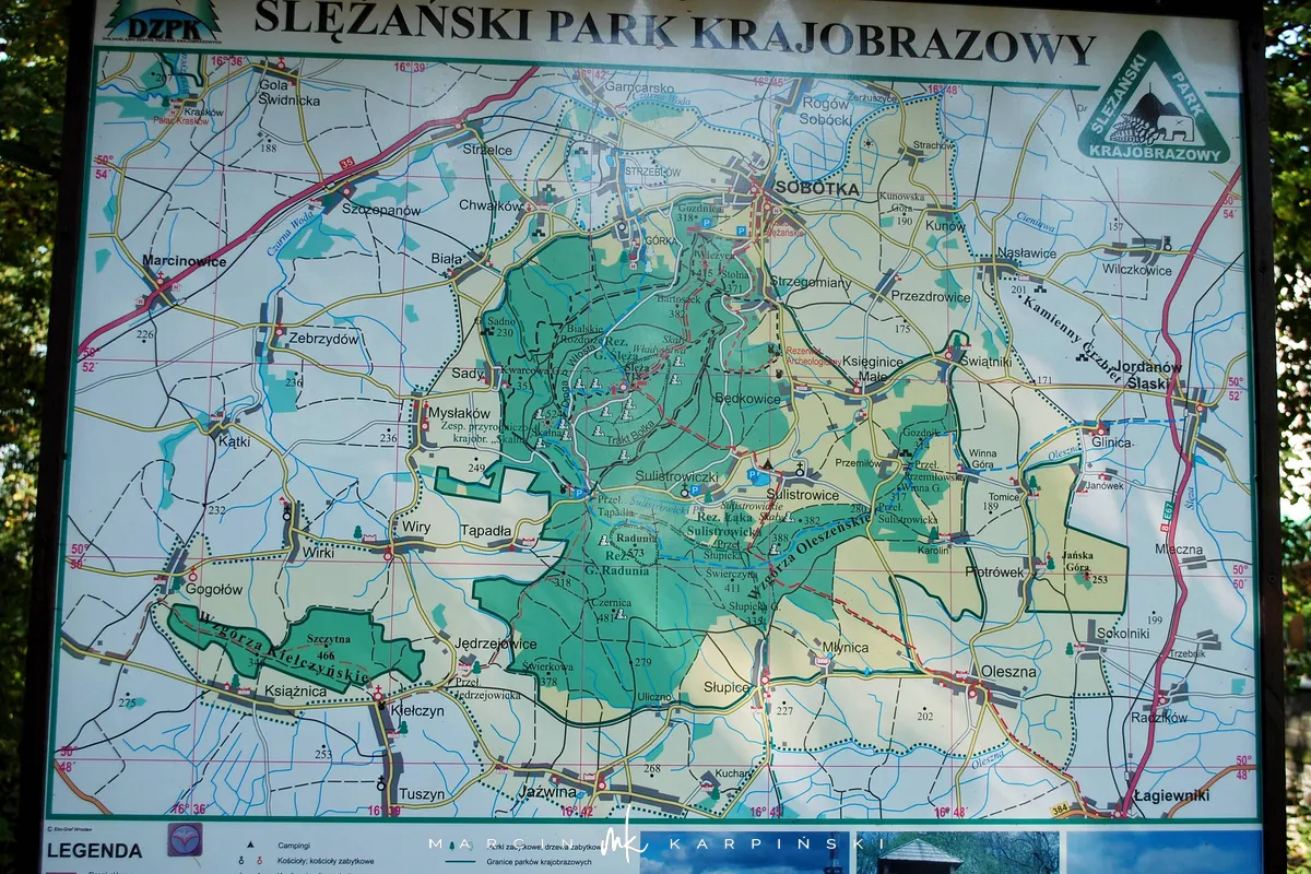 Na szczycie Ślęży byliśmy dwukrotnie. Pierwsze wejście miało miejsce wczesną jesienią, a drugie trzynaście lat później - wiosną. Na szczyt prowadzi kilka dróg. Najpopularniejsze rozpoczynają sie w Sobótce oraz na Przełęczy Tąpadła. Mimo niewielkiego obszaru cały masyw pokrywa gęsta sieć szlaków. Można kilkukrotnie wchodzić na szczyt i za każdym razem iść inną trasą. Oba wejścia na Ślęże rozpoczynaliśmy z Sobótki i szliśmy żółtym szlakiem na szczyt. Za pierwszym razem zeszliśmy tą samą trasą, którą weszliśmy. Natomiast za drugim razem do zejścia wybraliśmy niebieski szlak do Przełęczy Tąpadła i dalej do Sobótki czarny szlak po wschodniej stronie góry.