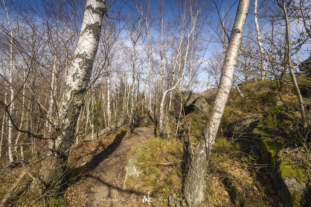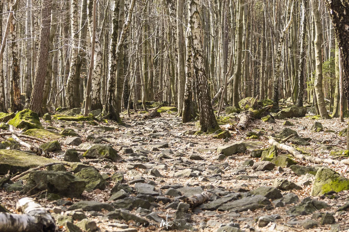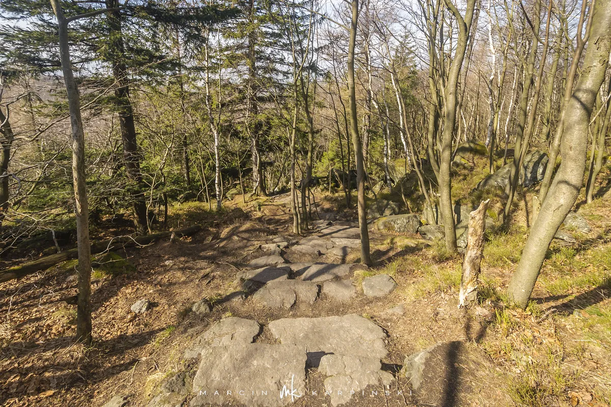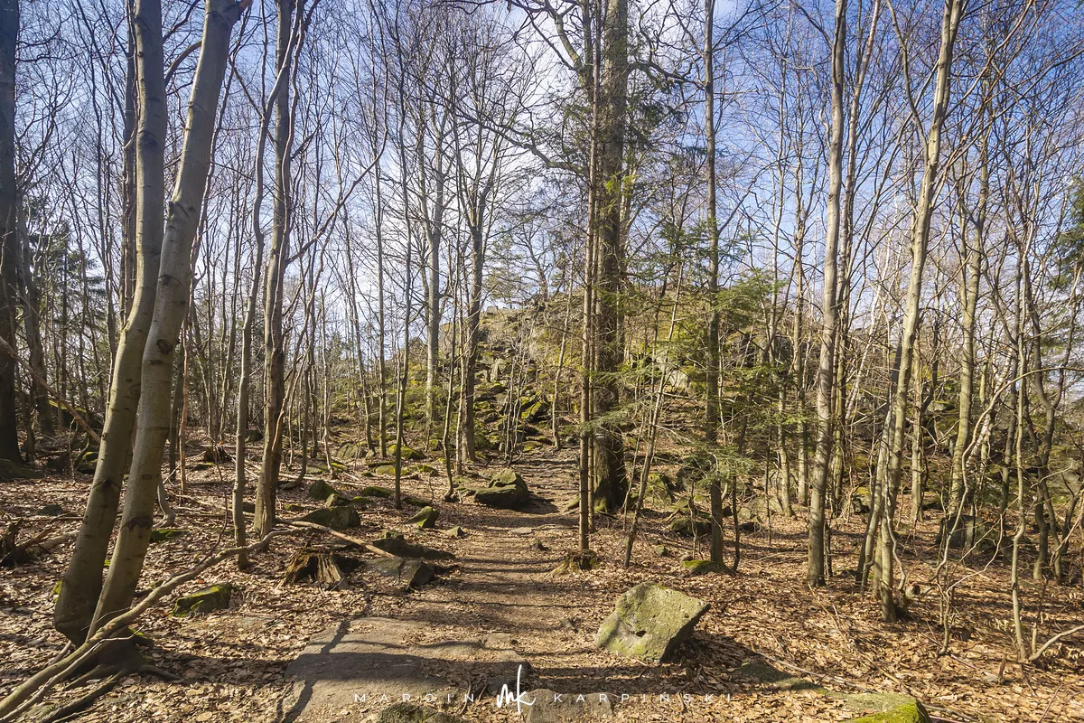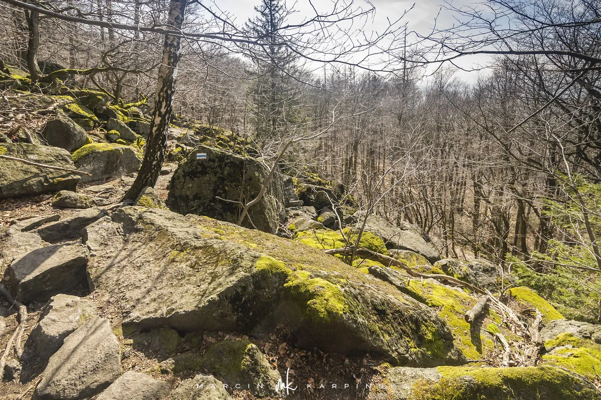 Po zejściu z wieży widokowej wchodzimy na niebieski szlak, który zaprowadzi nas do Przełęczy Tąpadła. Według mapy powinno nam to zająć godzinę i pięć minut. Jak się później okazało do tego czasu trzeba dodać jeszcze 45 minut. Po kilku minutach schodzenia po "kamiennych schodach" wchodzimy na płaski odcinek. Po kolejnych kilku minutach dochodzimy do Olbrzymek - skalnego gruzowiska, przez które został poprowadzony szlak. Jest to najciekawszy odcinek, inny od tego co widzieliśmy dotychczas. Niezwykle malowniczy, ale i trudniejszy do przejścia. Na mapie oznaczony jest nazwą "Skalna Perć". Dalej krótki odcinek szlaku prowadzi płasko po "Drodze Piotra Włosta", by później odbić w prawo w kierunku Skalnej - obszaru ze zgrupowaniem ciekawych skałek i głazów. Od miejsca gdzie niebieski szlak łączy się z zielonym, do Przełęczy Tąpadła pozostaje nam kilkadziesiąt minut wędrówki po płaskim.