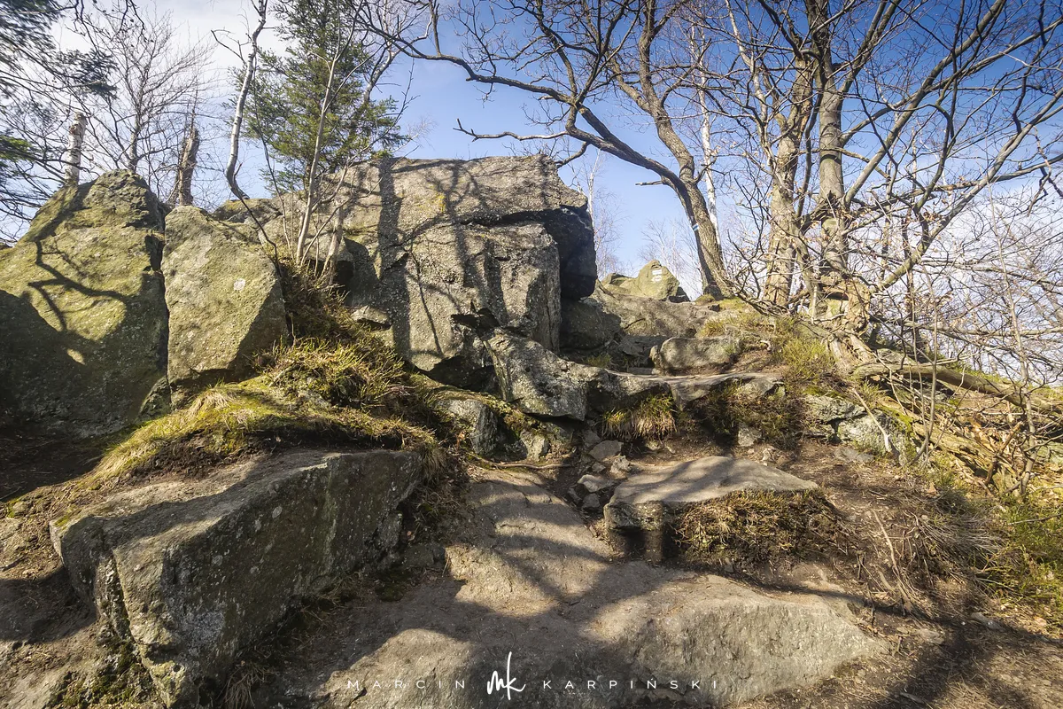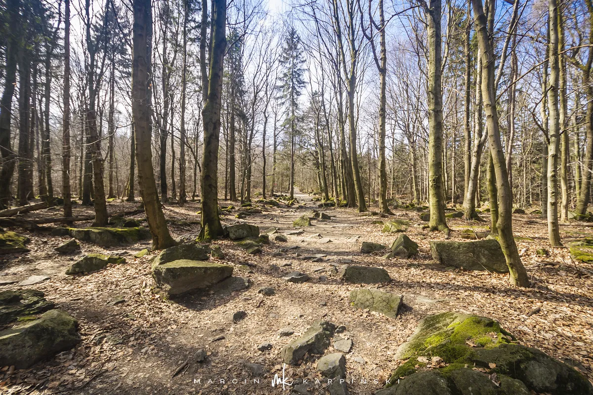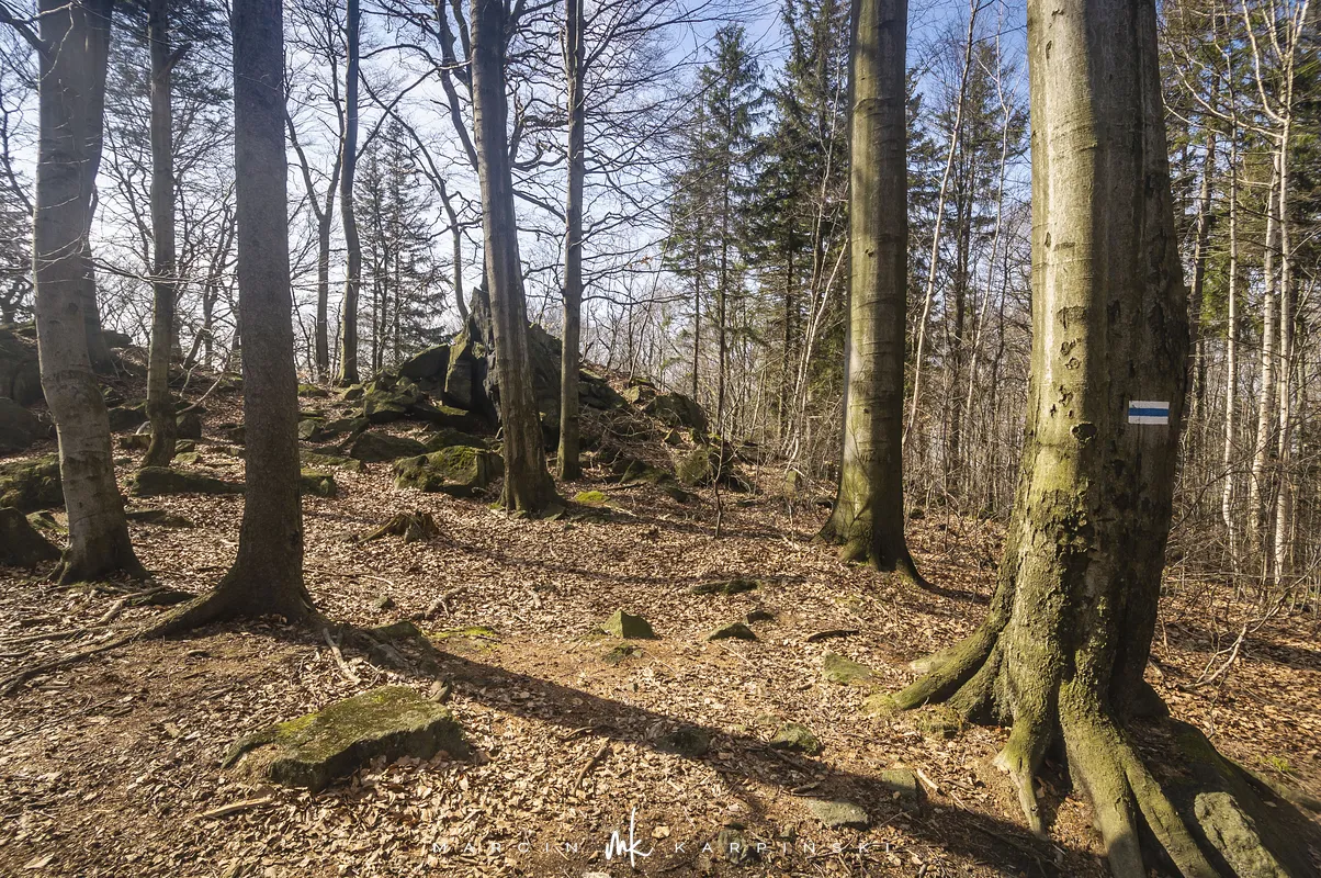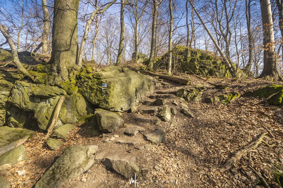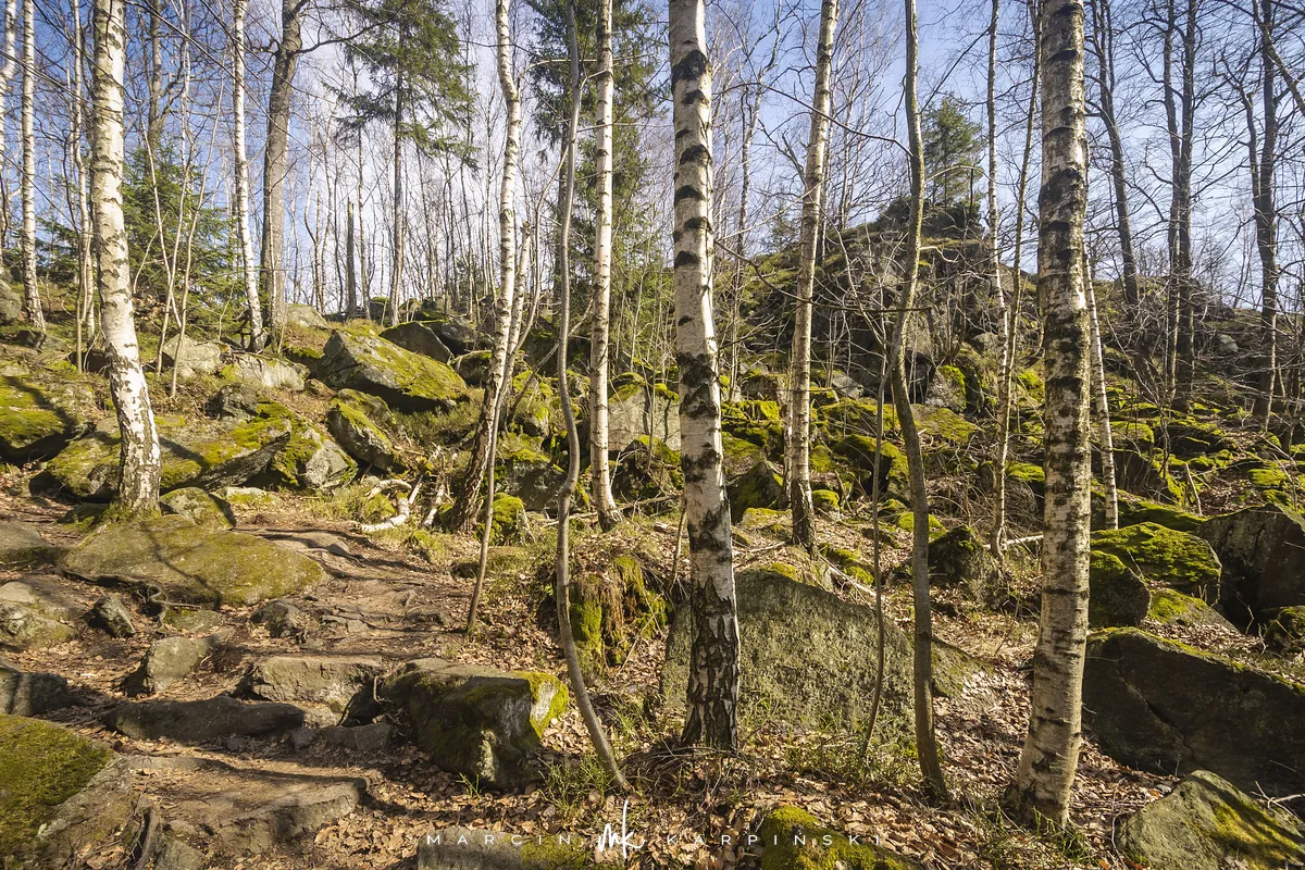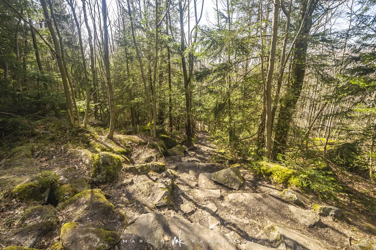 Po zejściu z wieży widokowej wchodzimy na niebieski szlak, który zaprowadzi nas do Przełęczy Tąpadła. Według mapy powinno nam to zająć godzinę i pięć minut. Jak się później okazało do tego czasu trzeba dodać jeszcze 45 minut. Po kilku minutach schodzenia po "kamiennych schodach" wchodzimy na płaski odcinek. Po kolejnych kilku minutach dochodzimy do Olbrzymek - skalnego gruzowiska, przez które został poprowadzony szlak. Jest to najciekawszy odcinek, inny od tego co widzieliśmy dotychczas. Niezwykle malowniczy, ale i trudniejszy do przejścia. Na mapie oznaczony jest nazwą "Skalna Perć". Dalej krótki odcinek szlaku prowadzi płasko po "Drodze Piotra Włosta", by później odbić w prawo w kierunku Skalnej - obszaru ze zgrupowaniem ciekawych skałek i głazów. Od miejsca gdzie niebieski szlak łączy się z zielonym, do Przełęczy Tąpadła pozostaje nam kilkadziesiąt minut wędrówki po płaskim.