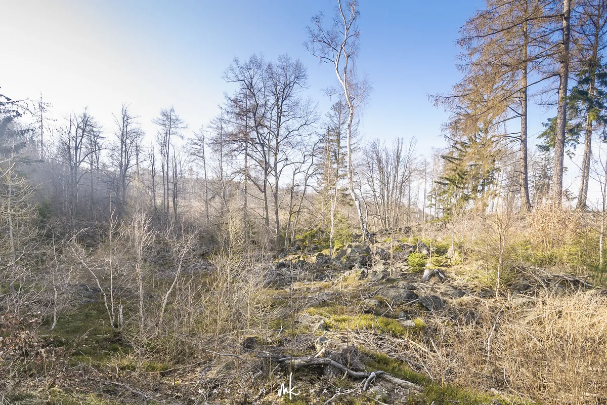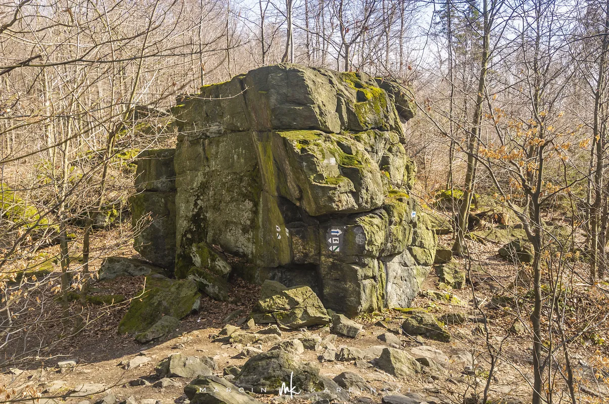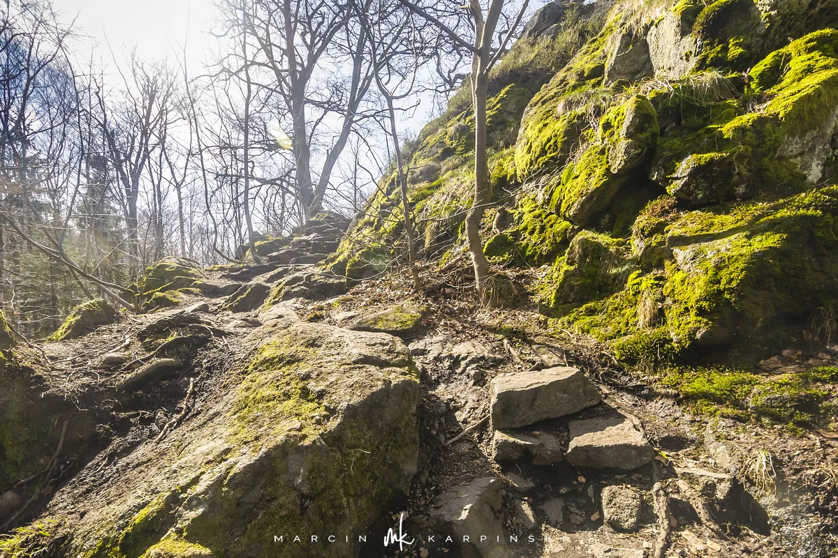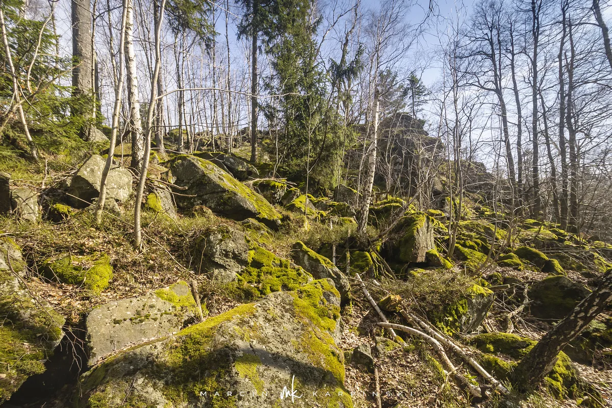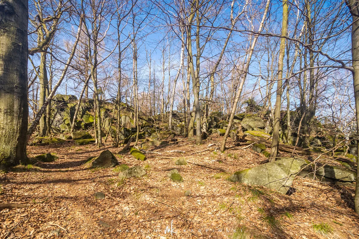 Po zejściu z wieży widokowej wchodzimy na niebieski szlak, który zaprowadzi nas do Przełęczy Tąpadła. Według mapy powinno nam to zająć godzinę i pięć minut. Jak się później okazało do tego czasu trzeba dodać jeszcze 45 minut. Po kilku minutach schodzenia po "kamiennych schodach" wchodzimy na płaski odcinek. Po kolejnych kilku minutach dochodzimy do Olbrzymek - skalnego gruzowiska, przez które został poprowadzony szlak. Jest to najciekawszy odcinek, inny od tego co widzieliśmy dotychczas. Niezwykle malowniczy, ale i trudniejszy do przejścia. Na mapie oznaczony jest nazwą "Skalna Perć". Dalej krótki odcinek szlaku prowadzi płasko po "Drodze Piotra Włosta", by później odbić w prawo w kierunku Skalnej - obszaru ze zgrupowaniem ciekawych skałek i głazów. Od miejsca gdzie niebieski szlak łączy się z zielonym, do Przełęczy Tąpadła pozostaje nam kilkadziesiąt minut wędrówki po płaskim.