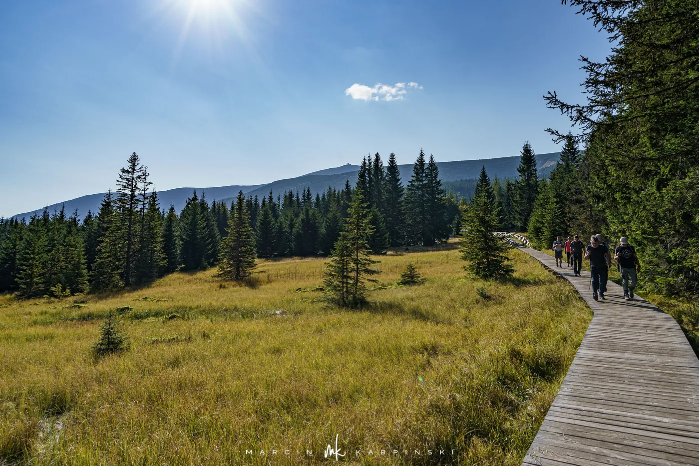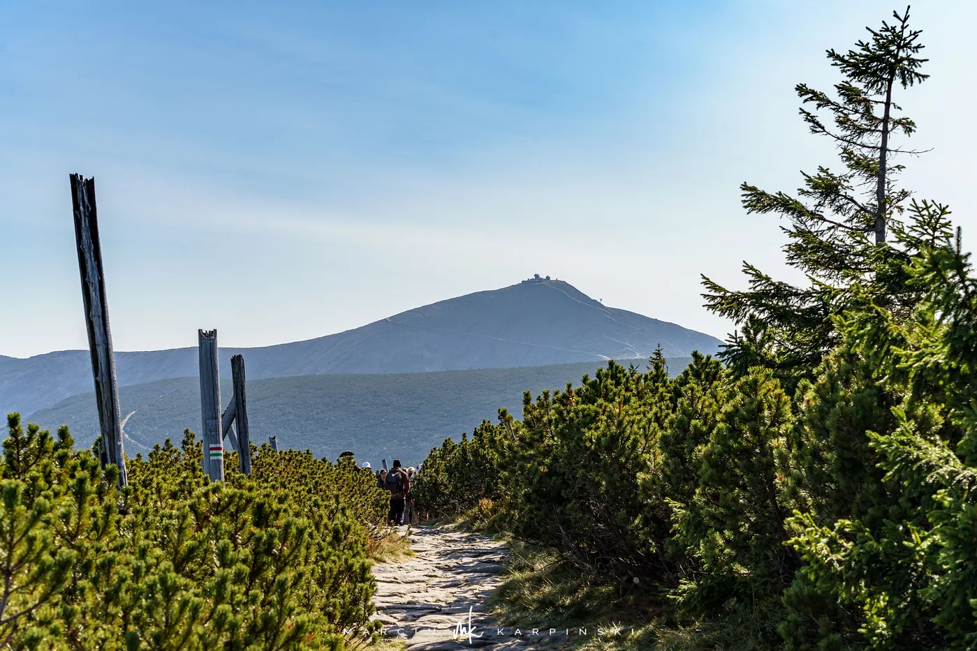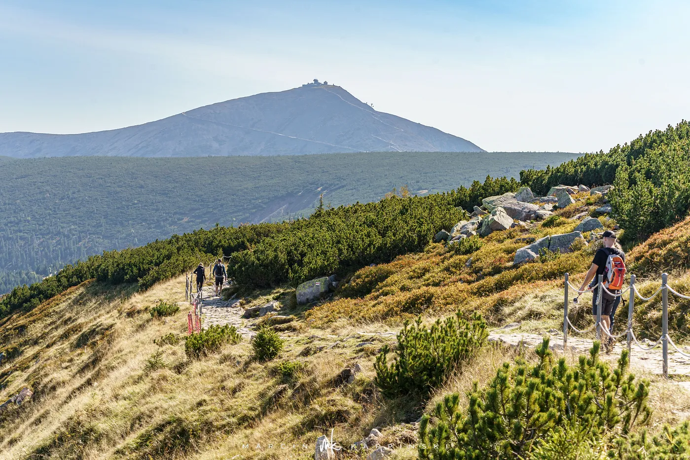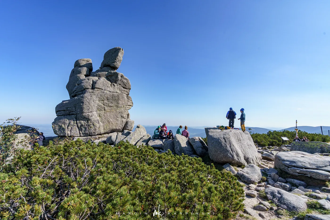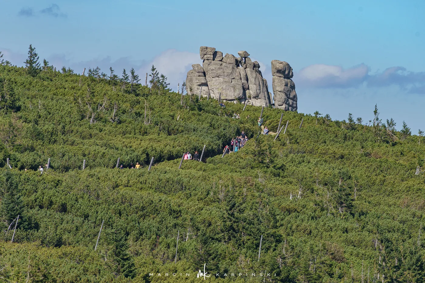 Początkowo idziemy drewnianą kładką przez łąki. Po chwili ścieżka znów zagłębia się w las i zaczyna piąć się ku górze. Po krótkim podejściu docieramy do Pielgrzymów - trzech monumentalnych skalnych baszt, których kształty powstały wskutek długotrwałego działania wiatru, mrozu i deszczu. Idąc dalej, szlak wynurza się z lasu, a droga prowadzi wśród kosodrzewiny. Po około 1 godzinie i 50 minutach docieramy do Słonecznika. To charakterystyczna, 12-metrowa formacja skalna, która przez wieki służyła mieszkańcom Kotliny Jeleniogórskiej jako naturalny zegar słoneczny. W tym miejscu otwierają się już szerokie panoramy: na zachód ku Górom Izerskim, na północ ku Kotlinie Jeleniogórskiej i Górom Kaczawskim, a na wschód ku Rudawom Janowickim i widocznej już z tego miejsca Śnieżce.